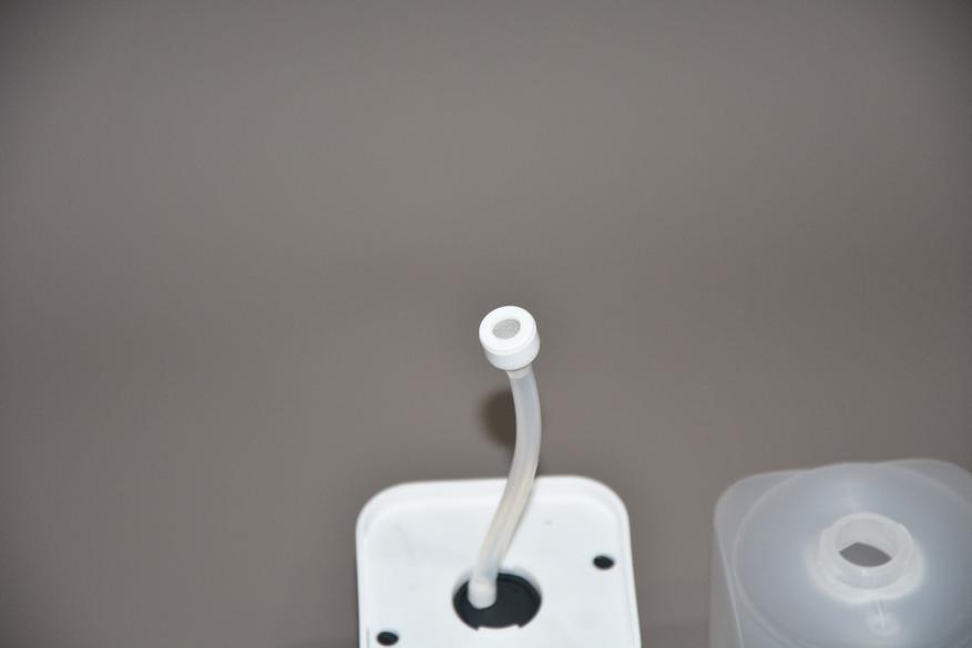 Общие габариты дозатора 19*7*7 см (еще 3,8 см носик). Выходной патрубок дозатора вынесен на 3 см от корпуса и установлен под углом к пользователю. Сквозь стенку резервуара можно рассмотреть необычную деталь — на шланг надет фильтр, чего раньше в диспенсерах не встречал.