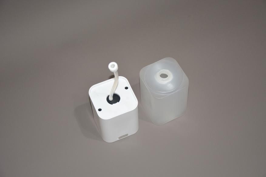 Для отсоединения емкости нужно провернуть ее на 90 градусов. Да, здесь нет резьбы, как у обычных бутылок, емкость фиксируется через уплотнитель и протечки исключены. Немного узковата горловина, но и тут есть свой плюс — при смешивании мыла с водой достаточно зажать пальцем горловину и как следует встряхнуть. На трубке действительно оказался сетчатый фильтр для защиты пеногенератора от постороннего случайного мусора. Еще один плюс конструкции в том, что верхняя часть диспенсера разборная. За черными силиконовыми заглушками спрятаны пара саморезов и в случае необходимости добраться до внутренностей устройства не составит большого труда.