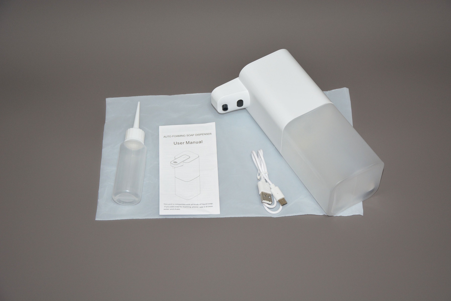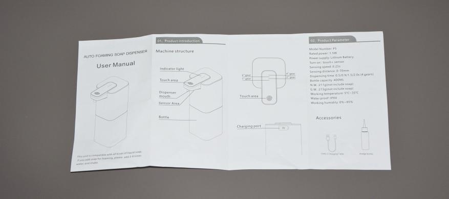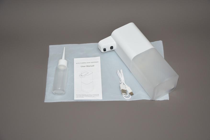 Комплект поставки состоит из дозатора, полуметрового кабеля Type-C для зарядки аккумулятора, инструкции на английском языке и маленькой пластиковой бутылки с конусообразной насадкой. Сначала подумалось — для заправки жидким мылом, но нет, она для других целей, о которых чуть позже.