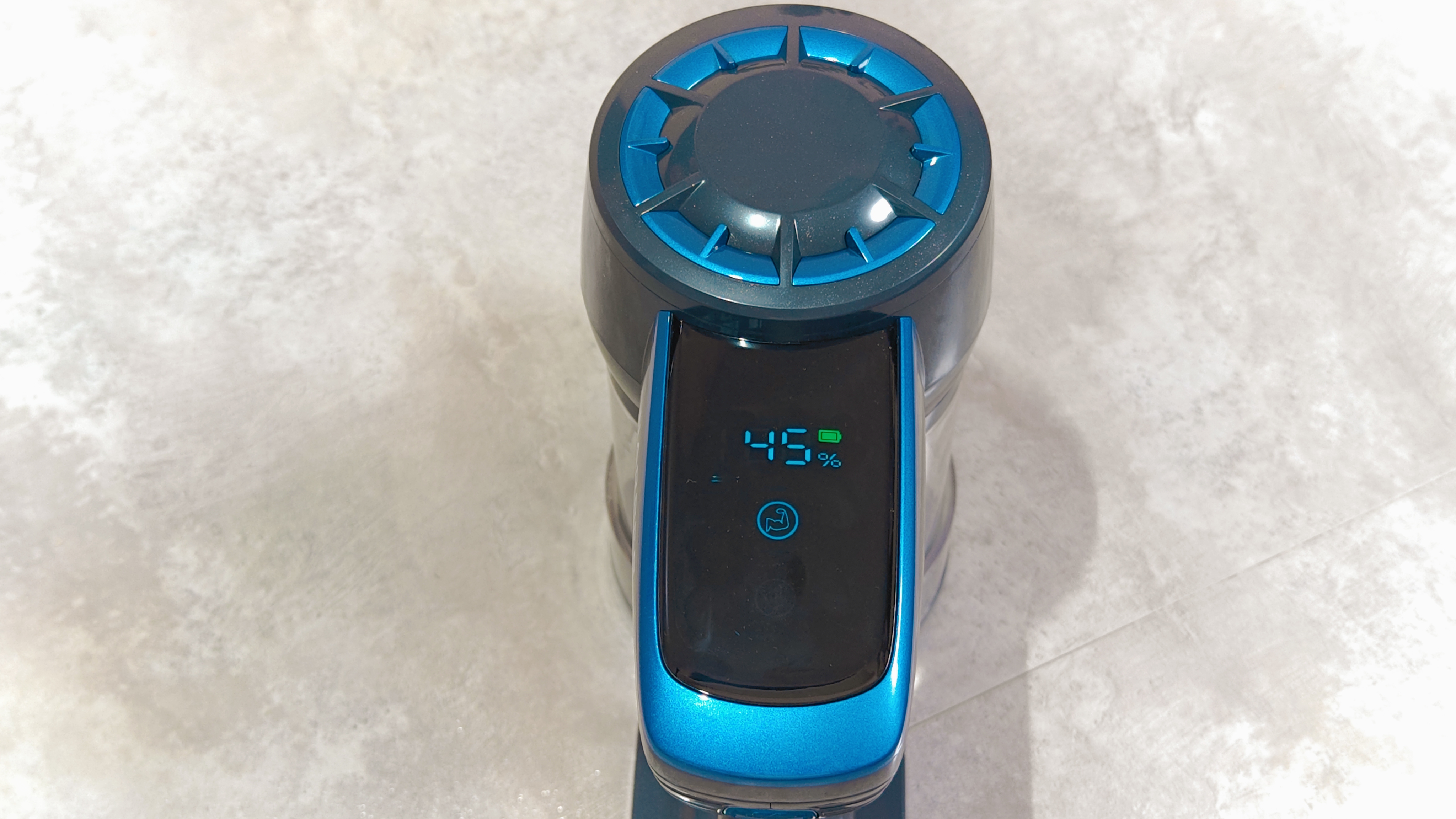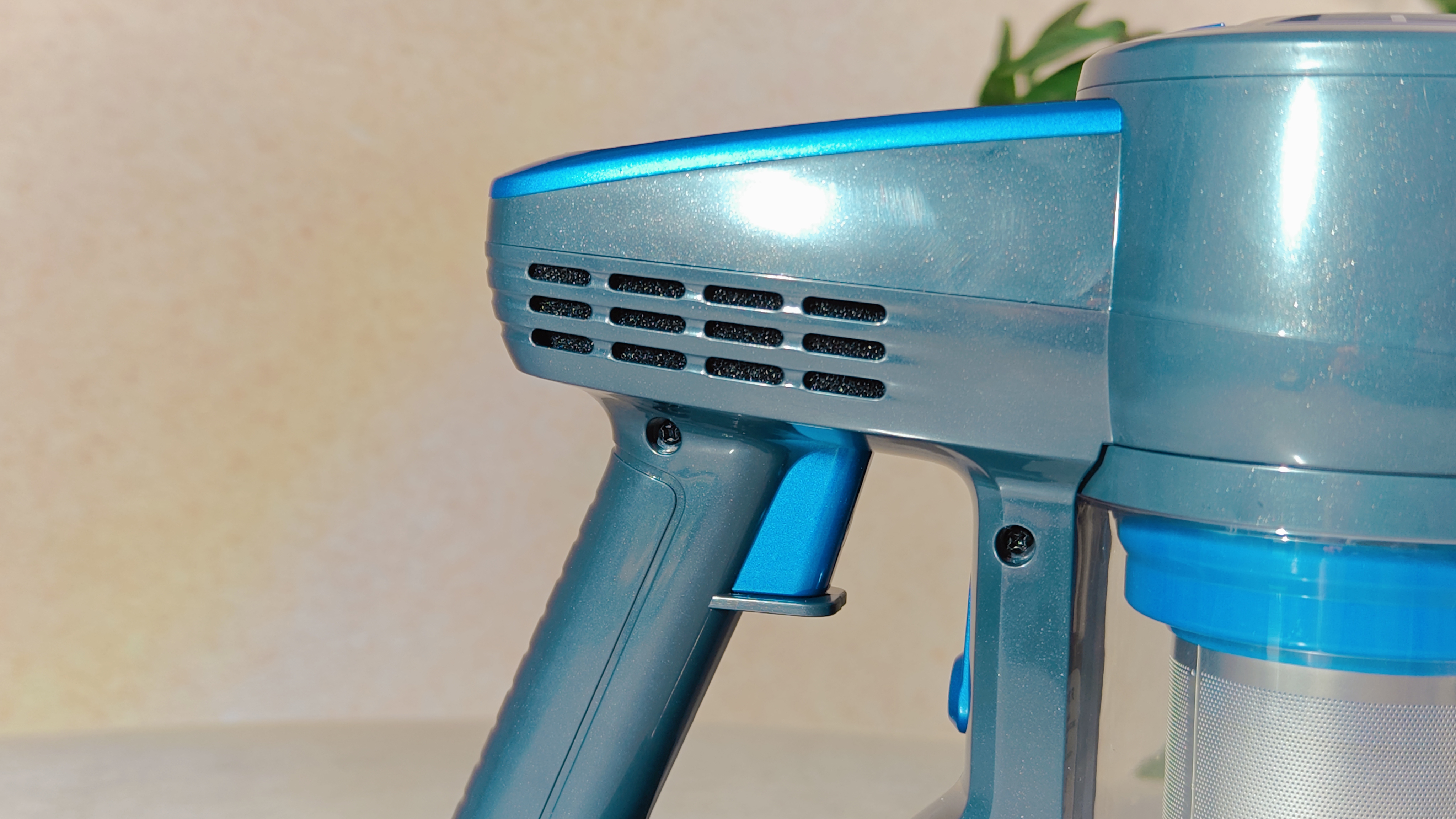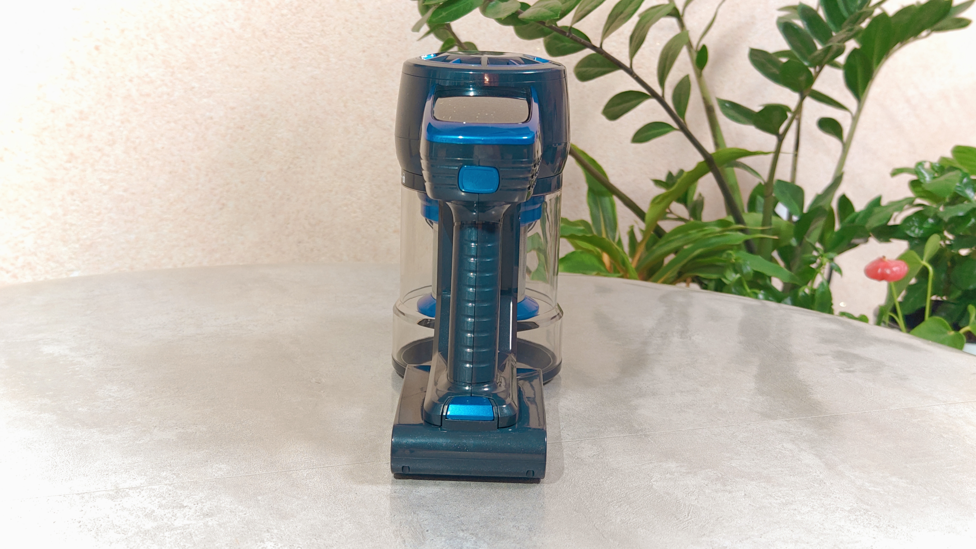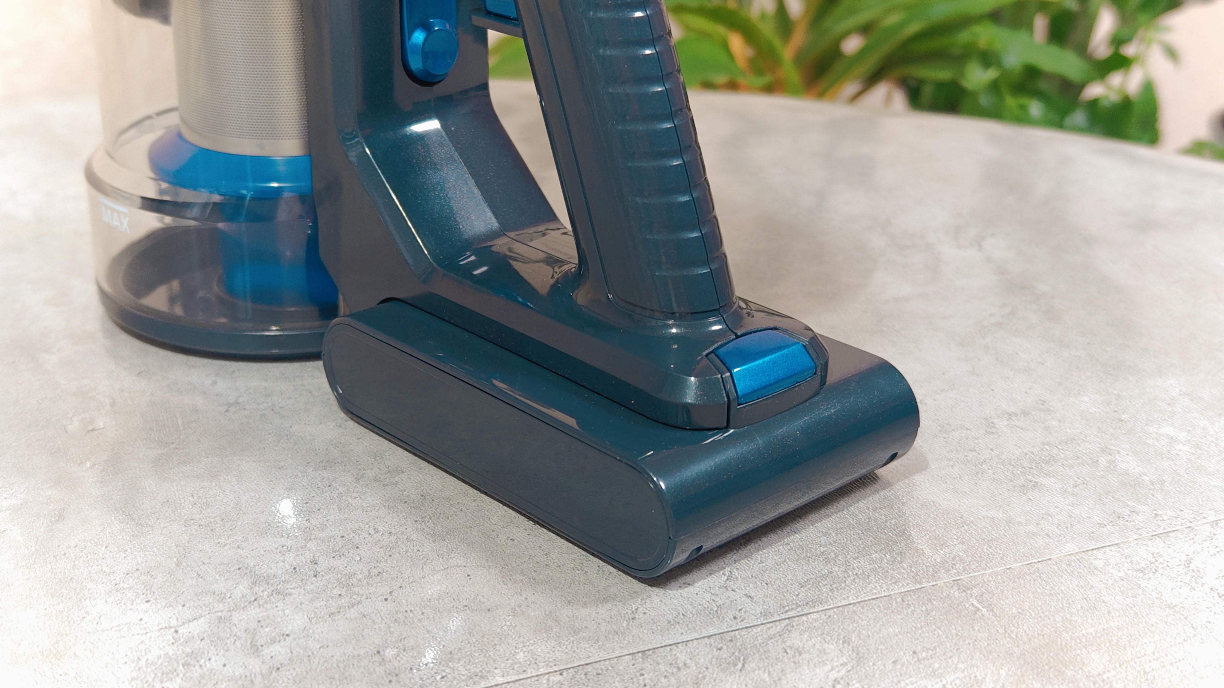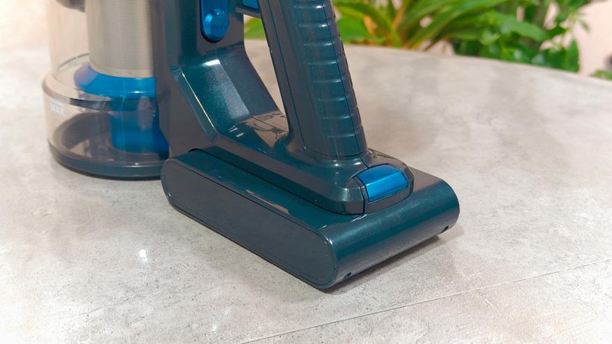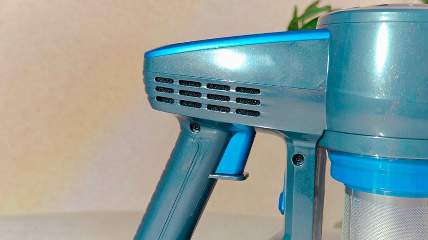 На торце, обращенном к пользователю расположена кнопка переключения режимов мощности всасывания. Рукоятка из пластика, достаточно удобная. Если присмотреться с правого бока на аккумуляторе расположен разъем для зарядки.