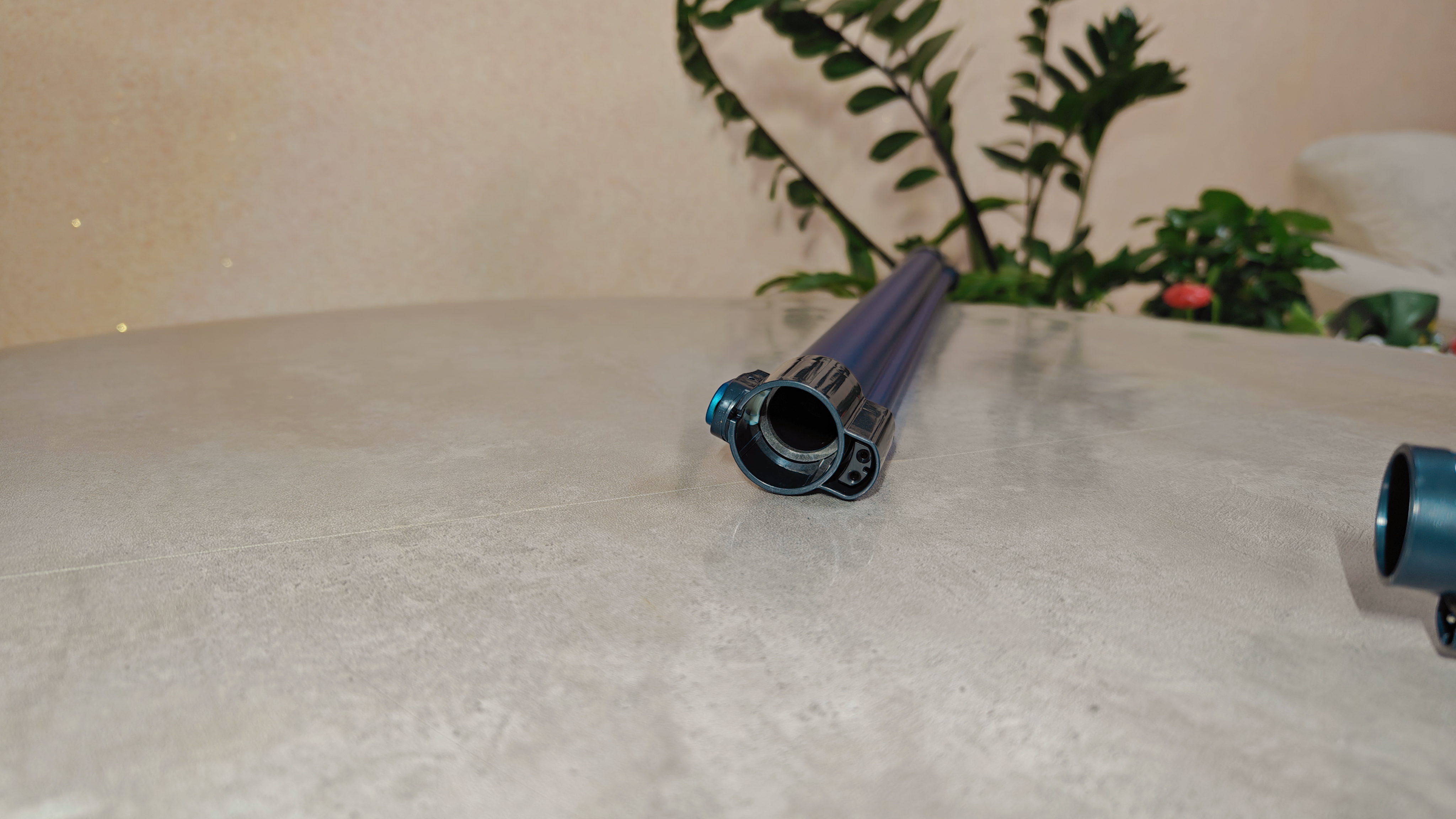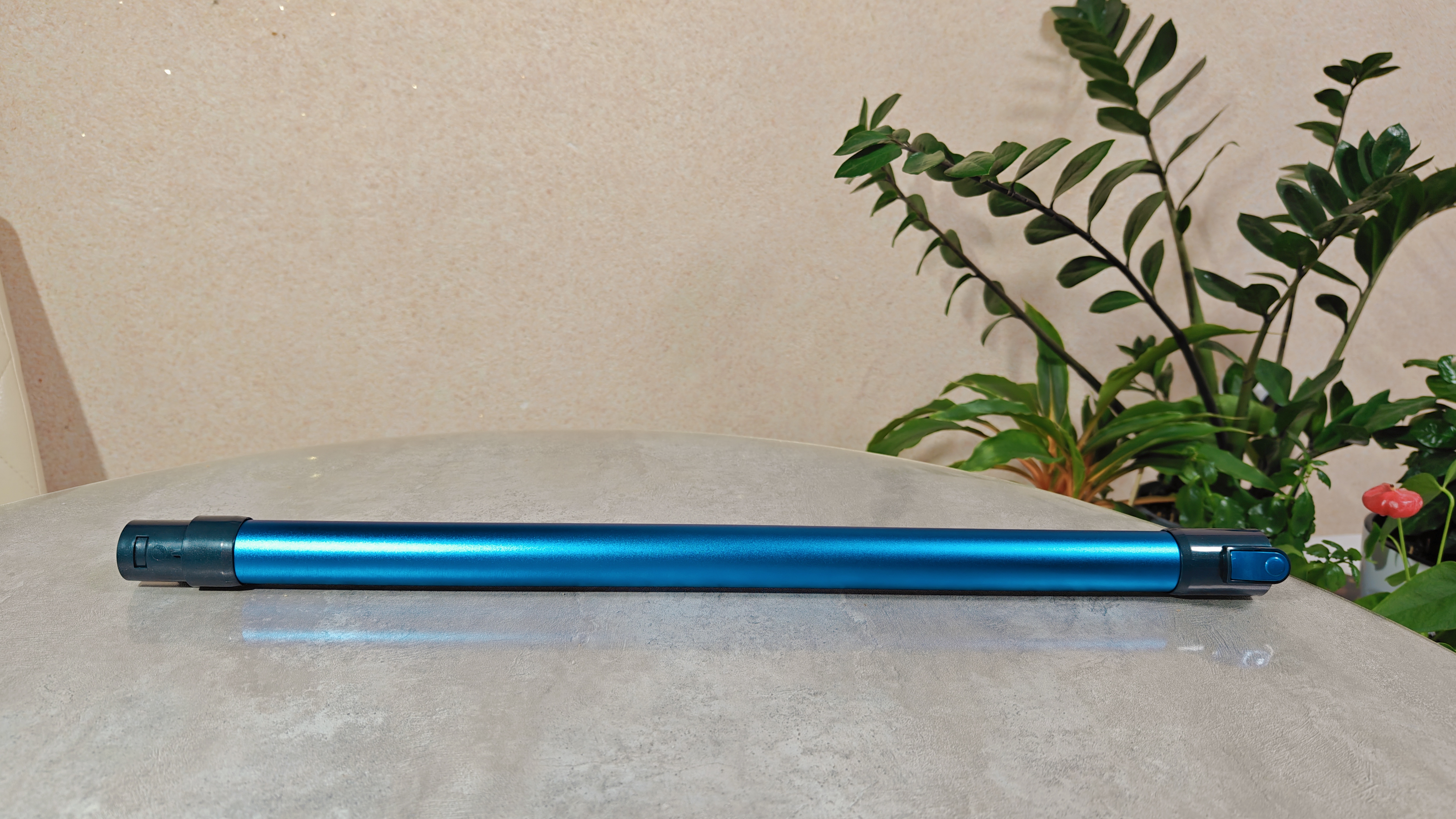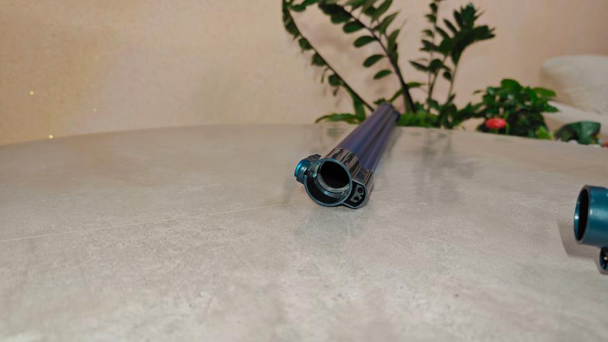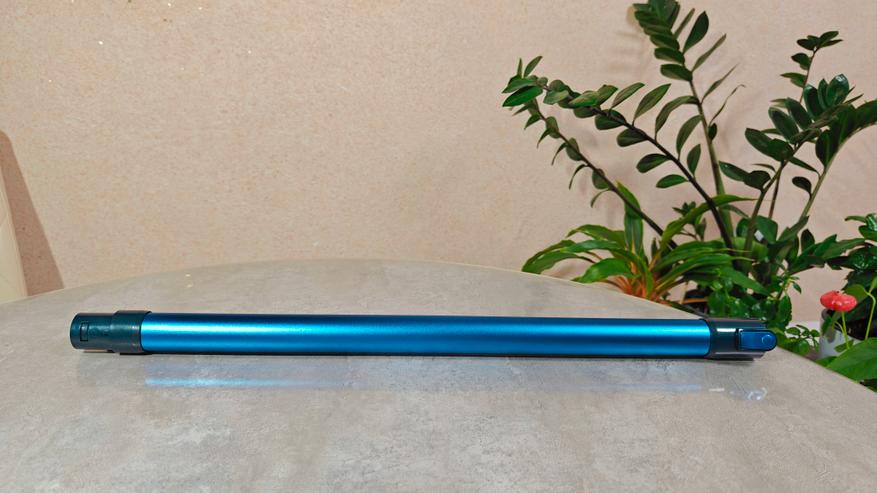 Насадки щелевая и универсальная с ворсом не нуждаются в представлении. Они типовые и всем знакомые. Собственно, трубка также достаточно стандартная, с каналами передачи питания до турбощетки. Она выполнена из алюминия, крепления из пластика. Сама окрашена в голубой цвет.