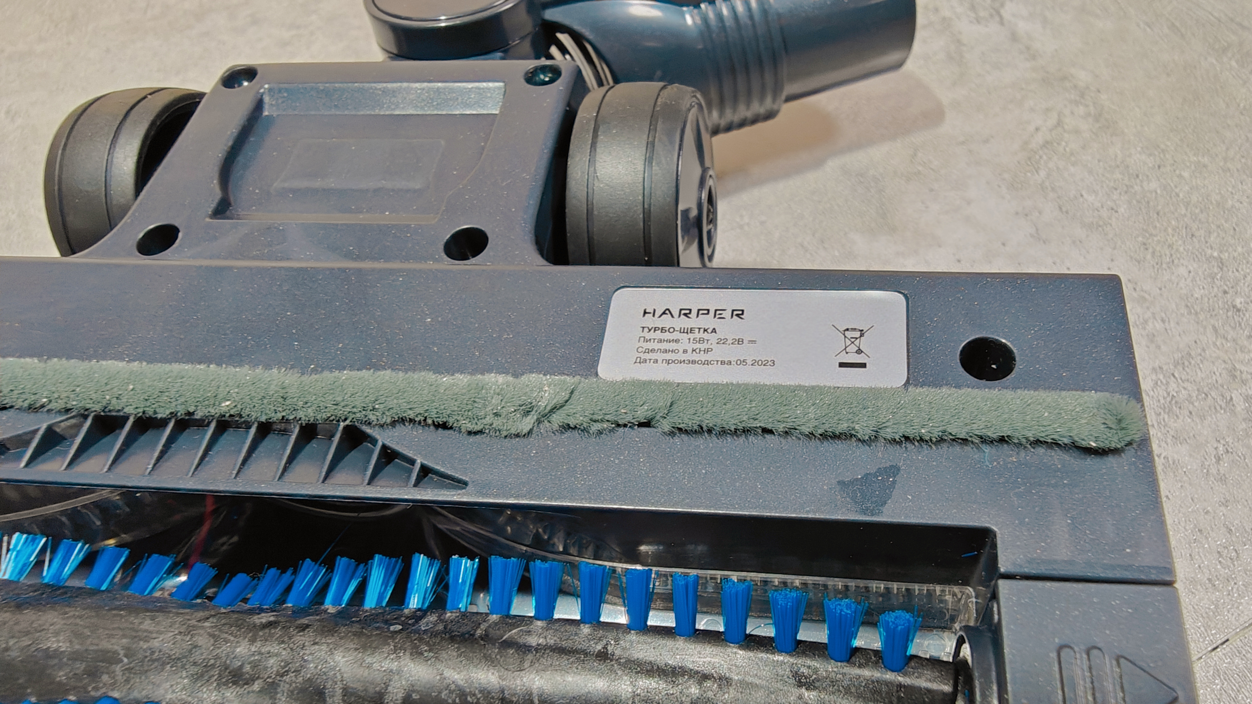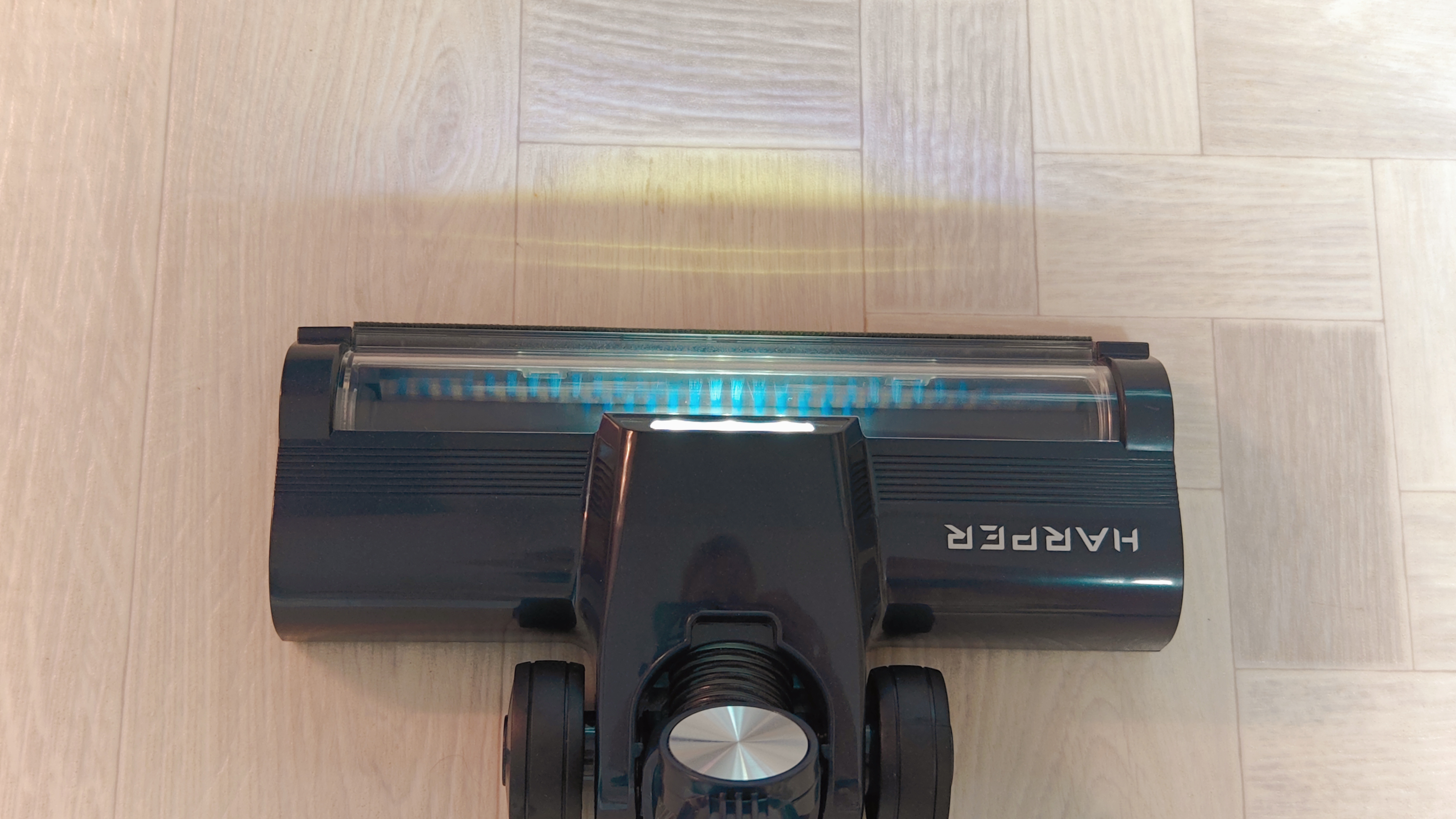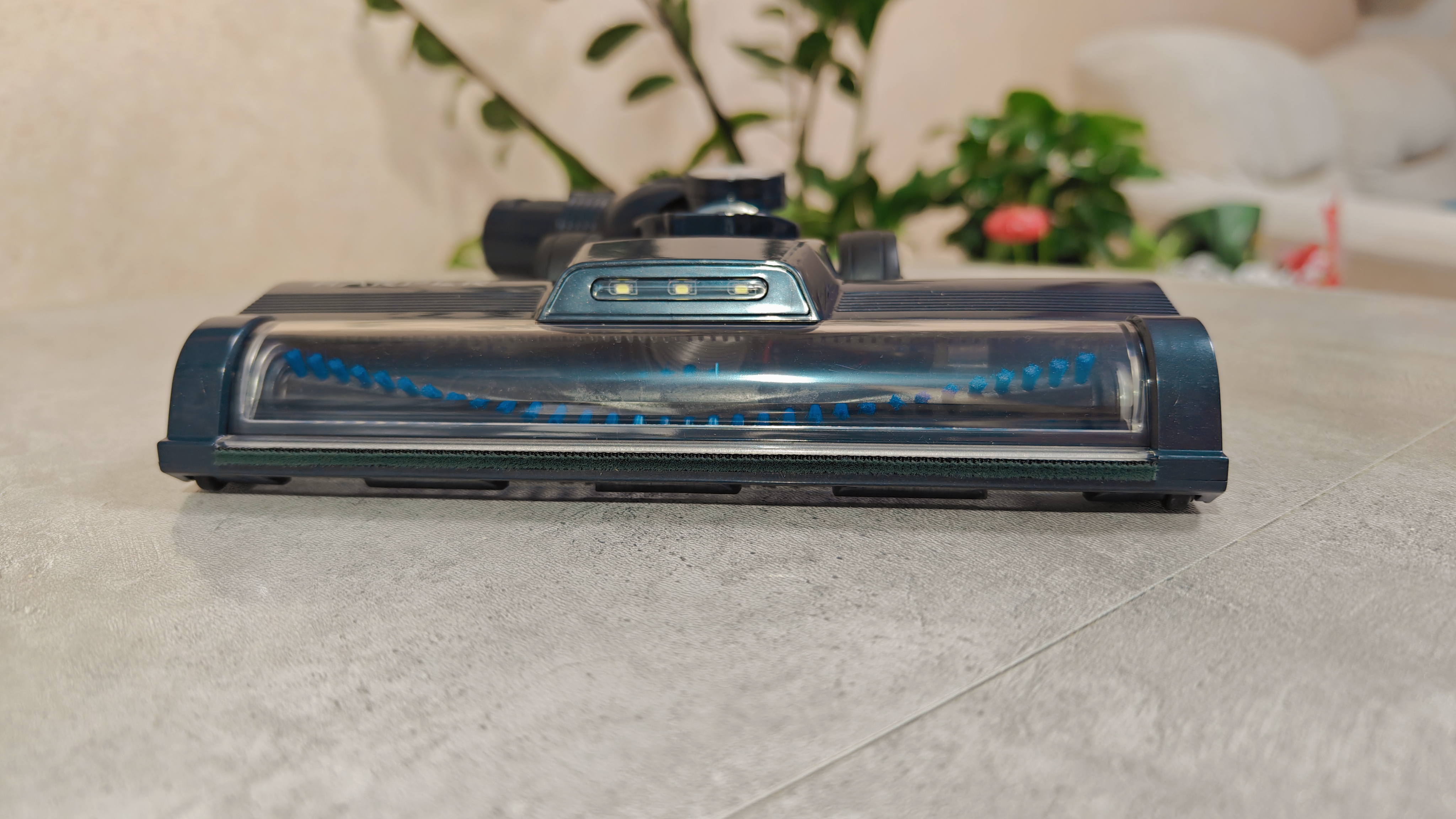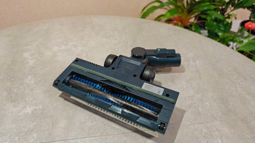 Основная насадка для уборки стандартная на вид, У нее есть прозрачная пластиковая витрина сверху, чтобы можно было на глаз оценить состояние щетки. А над витриной расположен блок их трех светодиодов. Насадка снабжена гибким шлангом, что позволяет дотянуться щеткой до всех мест. Катается при помощи двух колесиков с резиновой покрышкой. Снизу дополнительная наклеенная ворсовая полоса для полноценного задержания мусора и последующего забора в контейнер.