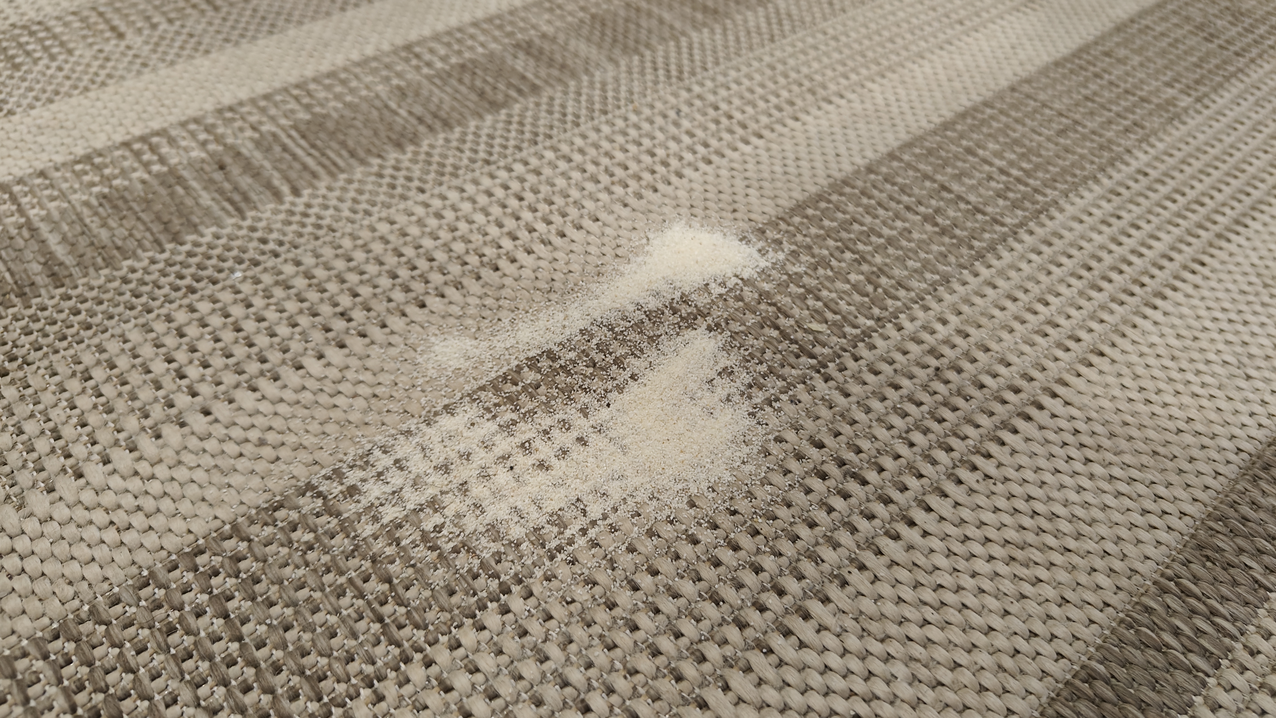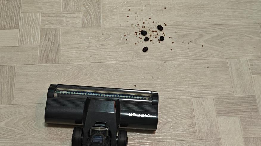 Приступаем к тесту посложнее, рассыпаем мелкую крупу (манка как имитация песка) на придверный ковер с крупным плетением. Весь мусор был собран в контейнер. Мощности высосать песок из придверного коврика ему хватает. А это одна из часто используемых функции в нашем доме, потому что в переходные периоды (весна-осень) песка с улицы несется много. Проще всего его периодически убирать, схватив легкий пылесос.