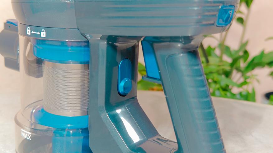 Пылесос имеет классическое исполнение: рукоятка со съемным аккумулятором, прозрачный пластиковый контейнер, симпатичного цвета корпус с логотипом производителя. Все элементы снабжены специальными кнопками. Для того чтобы извлечь аккумулятор, или открыть крышку контейнера, или просто отстегнуть контейнер, нужно просто нажать соответствующую кнопку. Сквозь прозрачный корпус ёмкости для мусора проглядывает система фильтрации. Сразу понимаем, что это никакой не циклон, но в данную стоимость это и не удивительно. На корпусе нанесены подсказки, куда нужно крутить контейнер для снятия.