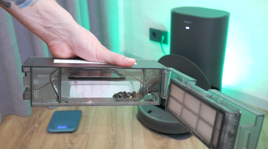 Устаревшая конструкция не мешает станции выполнять свои обязанности, причем лучше, чем большинство аналогов. Она практически без остатка вытащила из пылесборника семечки, песок, крупу и даже наполнитель! Такое качество самоочистки встречается не часто, даже у топовых моделей.