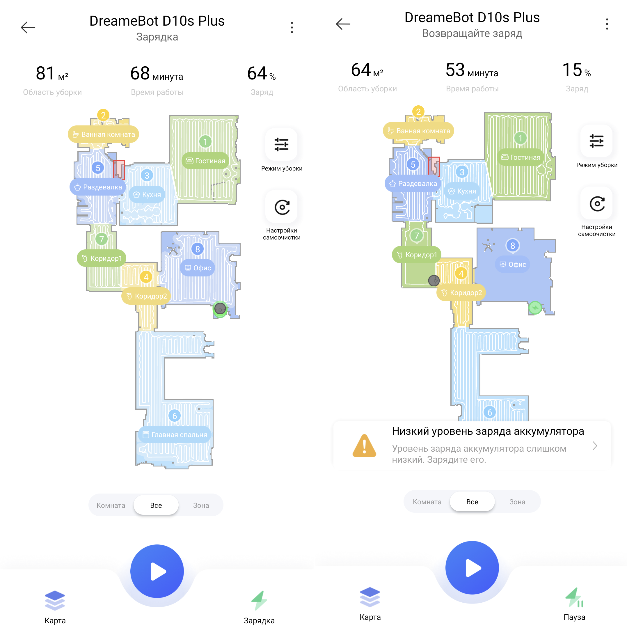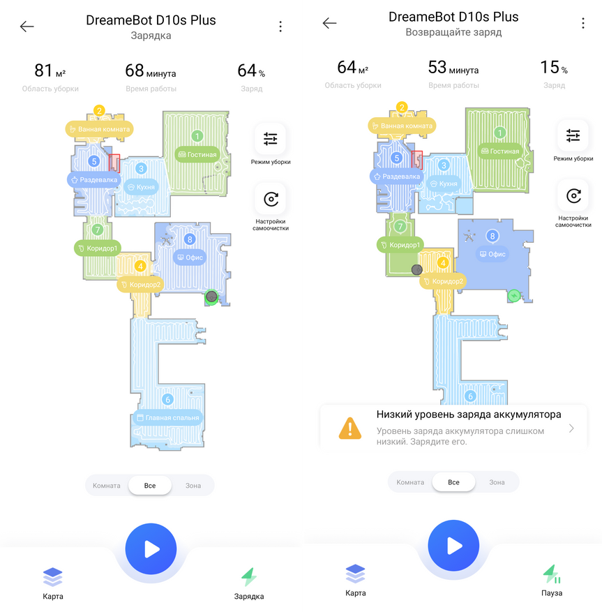 - Выбор режима влажной уборки. Dreame D10s Plus может протирать пол быстрыми зигзагами без заезда на уже обработанную полосу. А может убирать плотными зигзагами, перекрывая до 50% смежной зоны и даже замедляя при этом скорость.