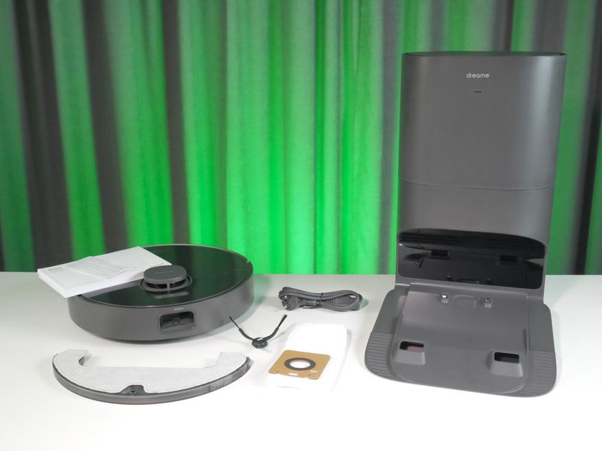 Посылка приезжает в большой коробке, где помещается пылесос и док-станция. Само собой, положили швабру с микрофиброй, торцевую щётку, которую нужно посадить в посадочное место, шнур питания и документацию. Из дополнительных аксессуаров нашлось место для запасного мешка.