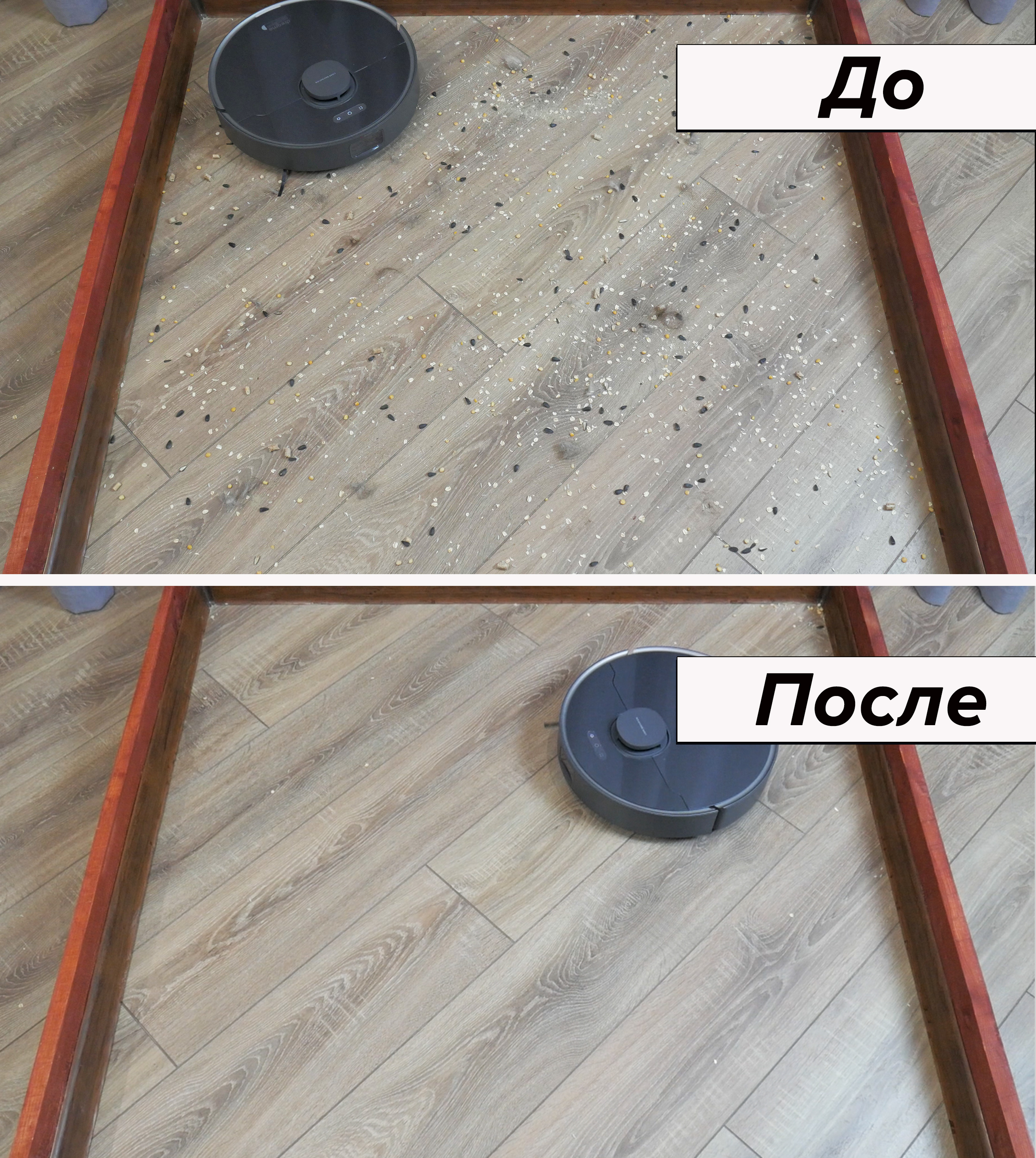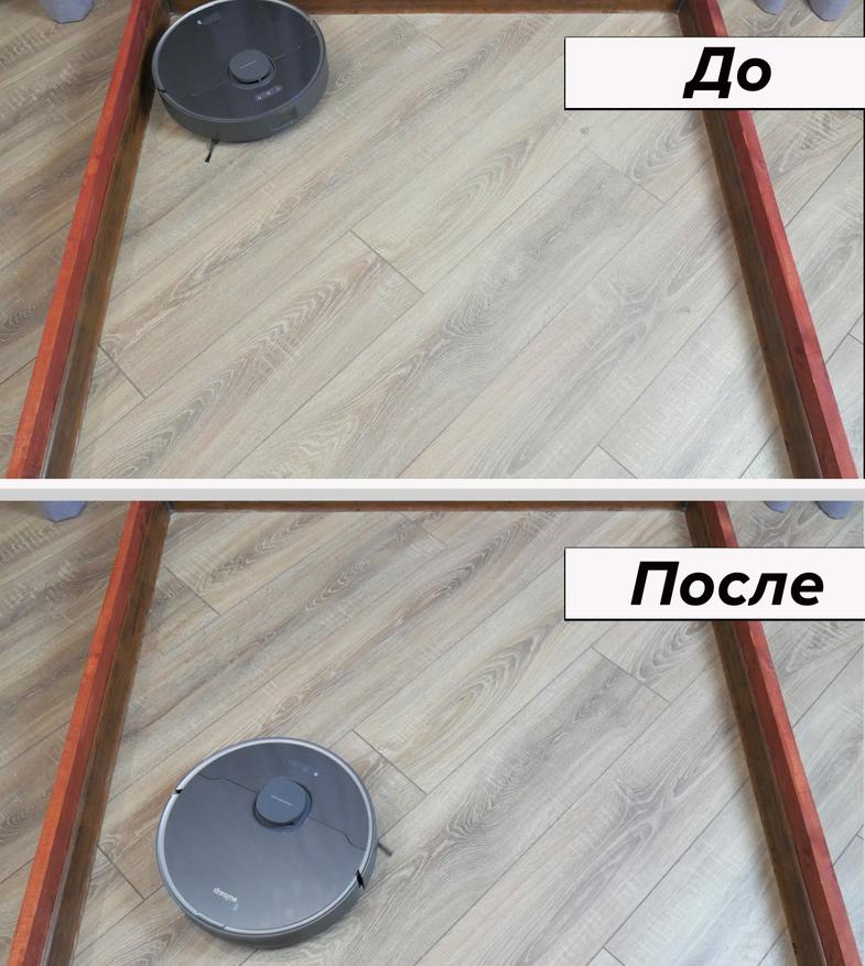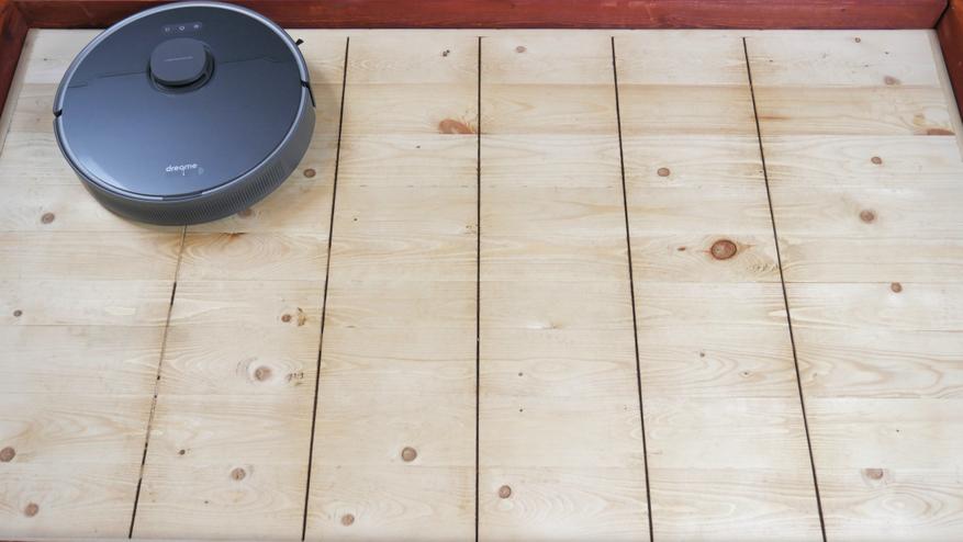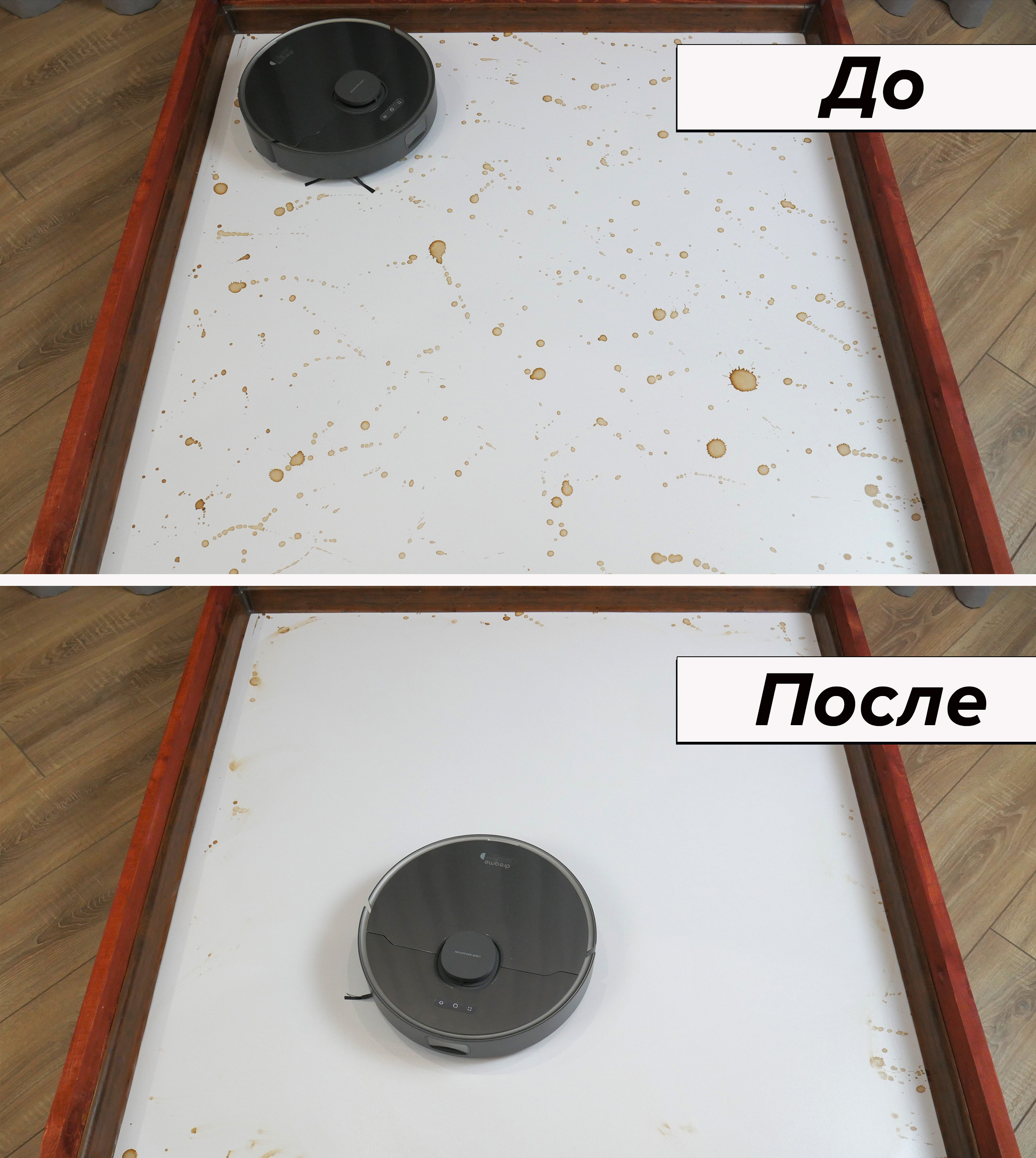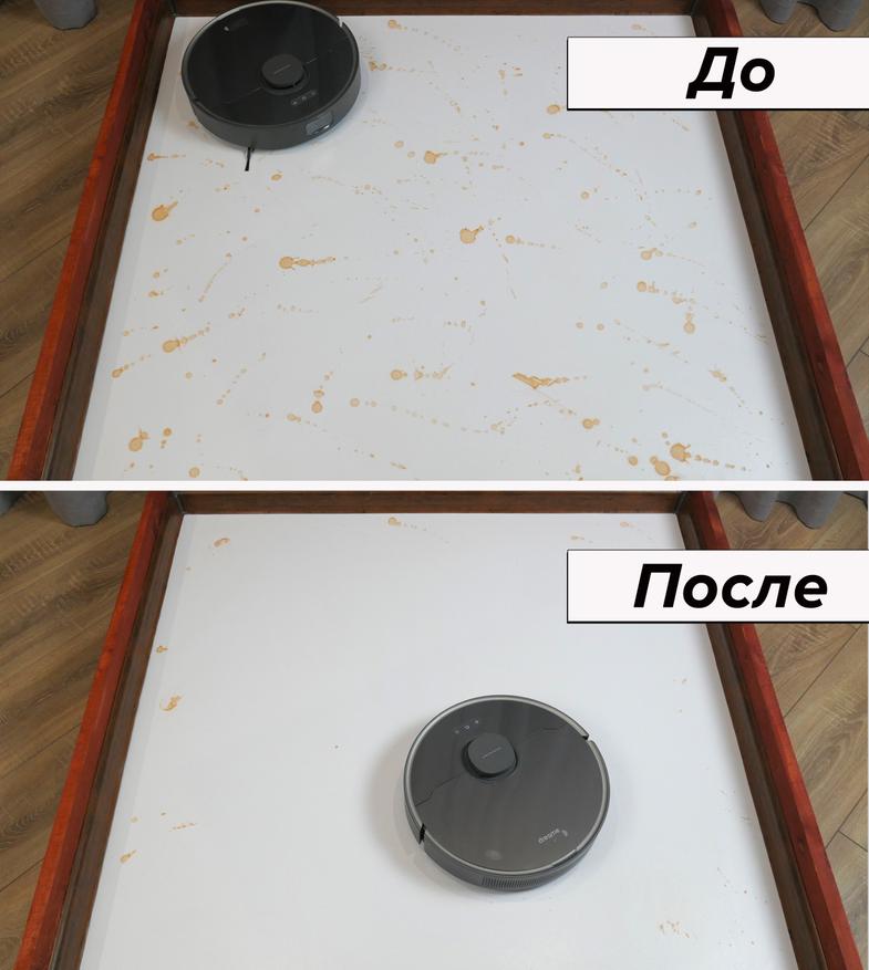 Несмотря на С-образную форму швабра хорошо прижимается к полу и отмывает середину стенда от легких загрязнений, включая кофейные пятна. Пристенные зоны, как и другие роботы такого типа, Dreame D10s Plus оставляет грязными.