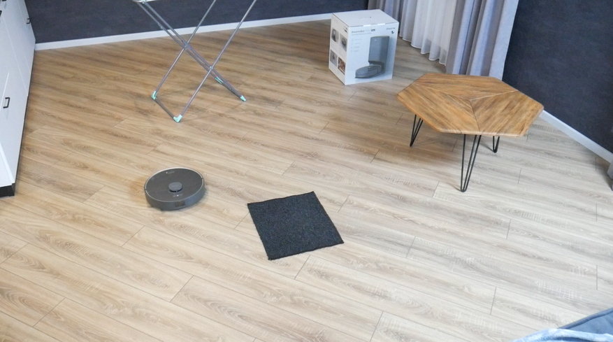 Пылесос последовательно убирает в каждой комнате, соблюдает установленные на карте ограничения. Обметает каждую ножку стула, но почему-то переезжает через основание сушилки. Впрочем, делает это легко. Проходимость порогов на уровне 2 см. Датчики поверхности не пускают робота на лестницу, нормально реагируют на твердые темные покрытия, но с ковриками бывают сбои.