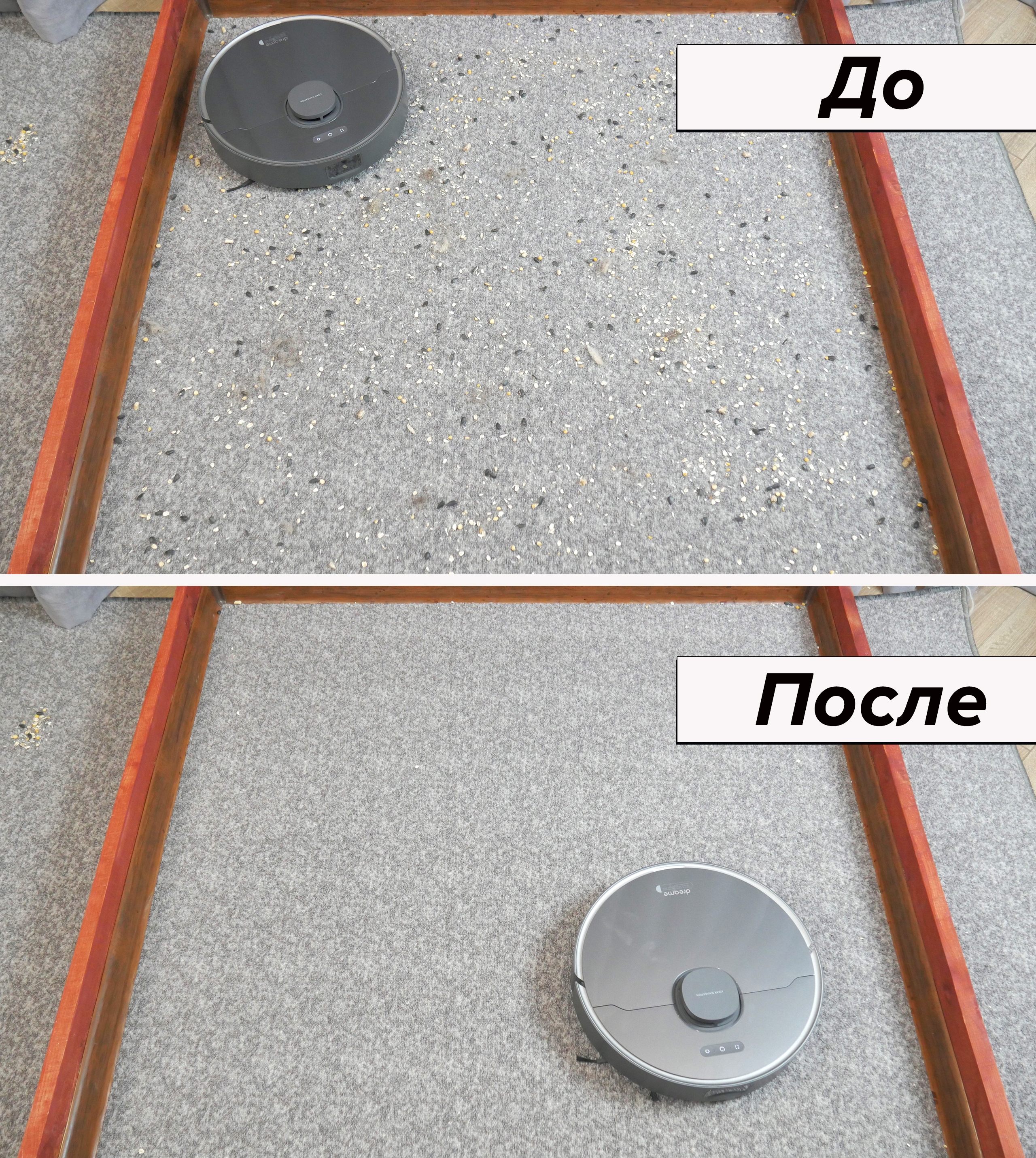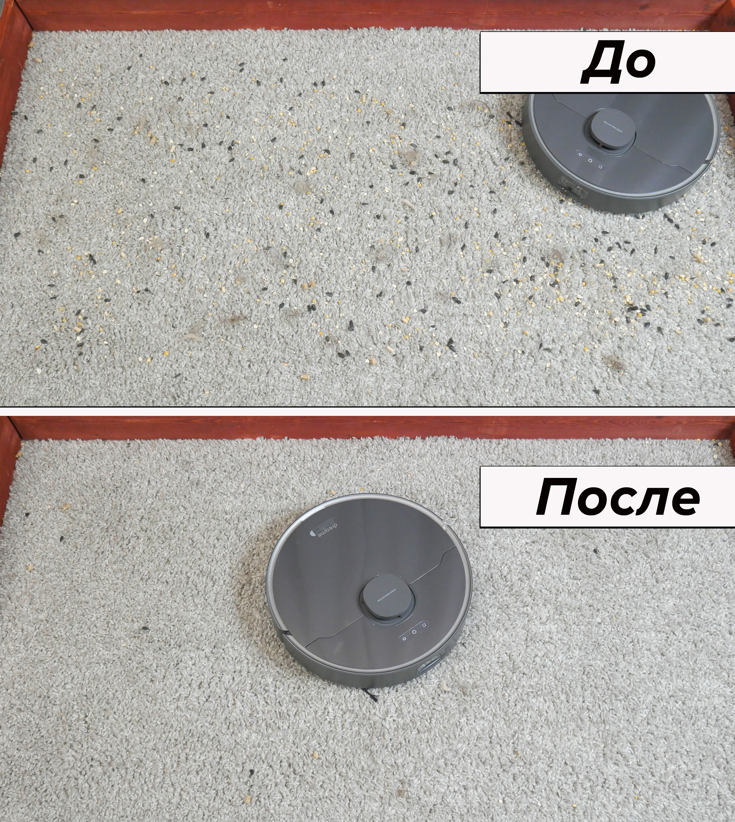 Dreame D10s Plus хорошо показал себя на любых покрытиях. Основную зону стенда очищает от мусора, начиная с песка (на гладком полу), заканчивая наполнителем. При этом количество соринок в углах и вдоль стен выше среднего. Особого упоминания заслуживает результат на среднем ковре — 85%. Резиновый валик неплохо прочесывает глубокий ворс и не наматывает на себя волосы. Обслуживание максимально простое.