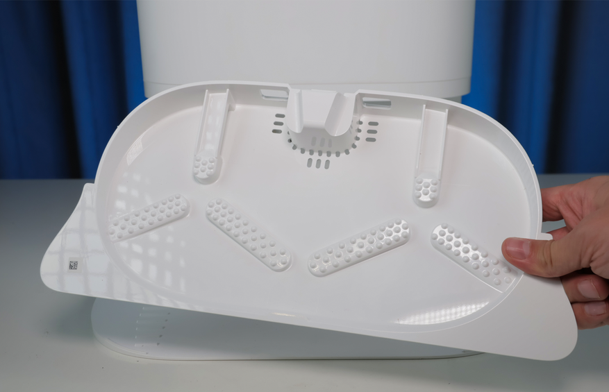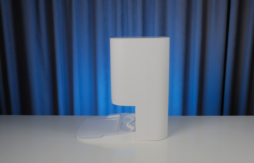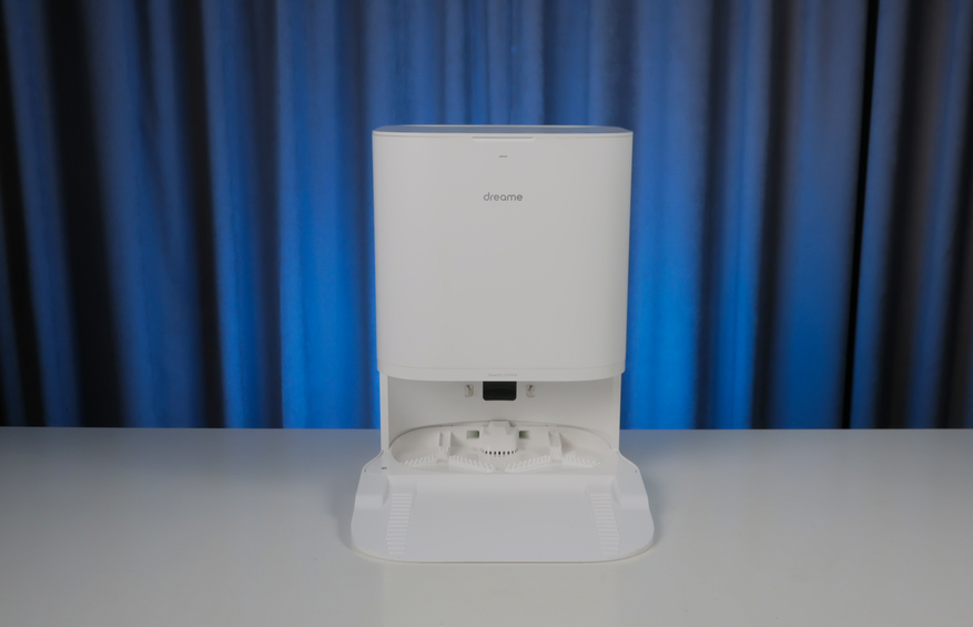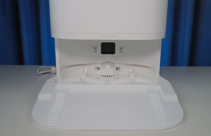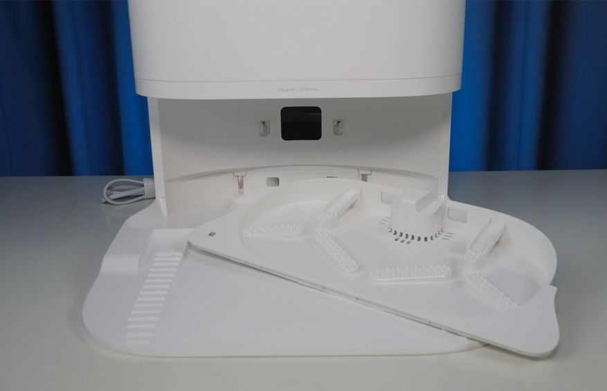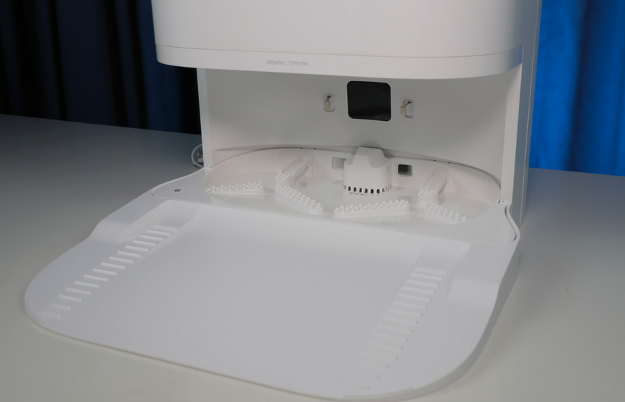Ниже находится док, где робот выполаскивает салфетки за счет трения о ребристые крестовины. Штуцера в станции нет, поскольку у робота отсутствует встроенный бачок. Сушка салфеток без подогрева — не самая быстрая, но хотя бы есть.