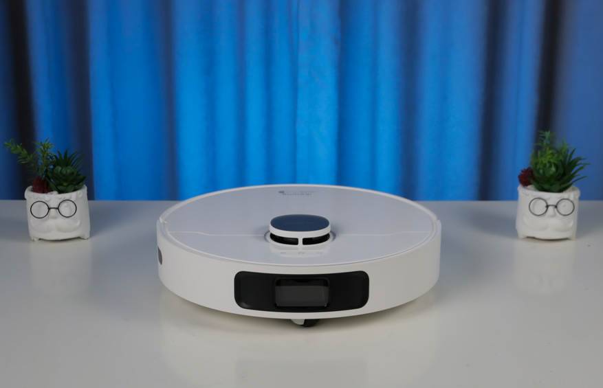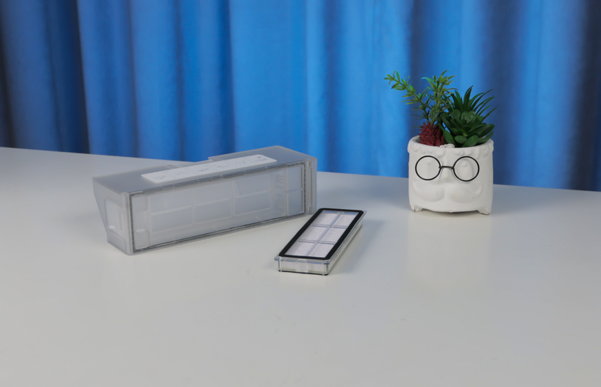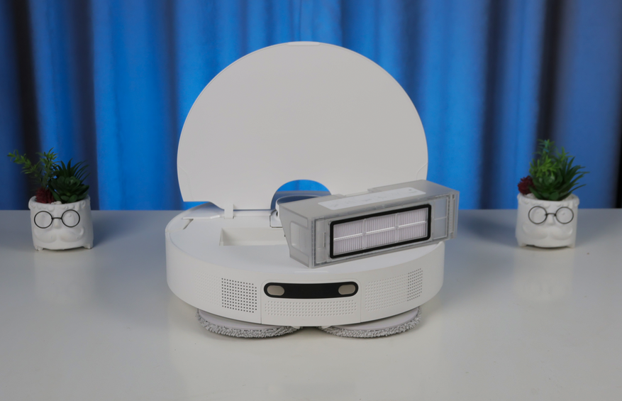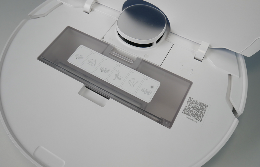 Дизайн L10 Prime ничем не отличается от роботов 10-й серии: круглый корпус высотой 104 мм (это важно!), вверху башенка лидара и откидная крышка. Под ней помещается объемистый контейнер на 450 мл с двойной фильтрацией. НЕРА-фильтр защищает мелкоячеистая сетка, так что служить он будет долго!