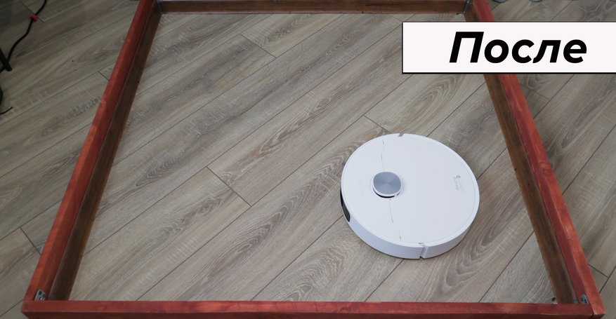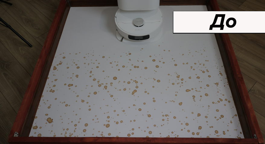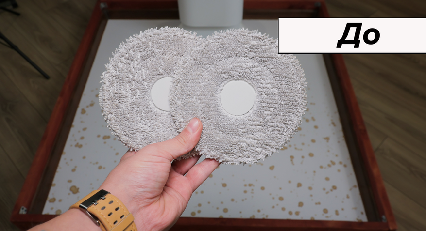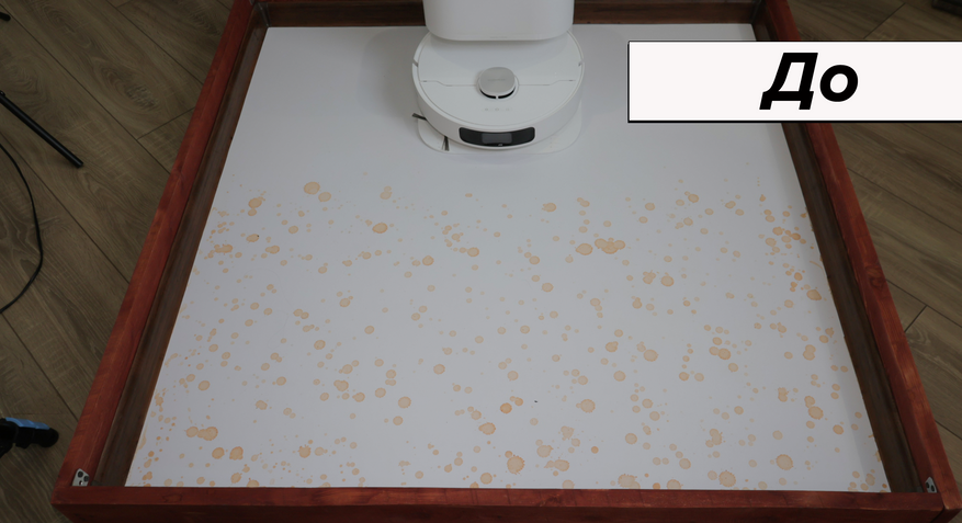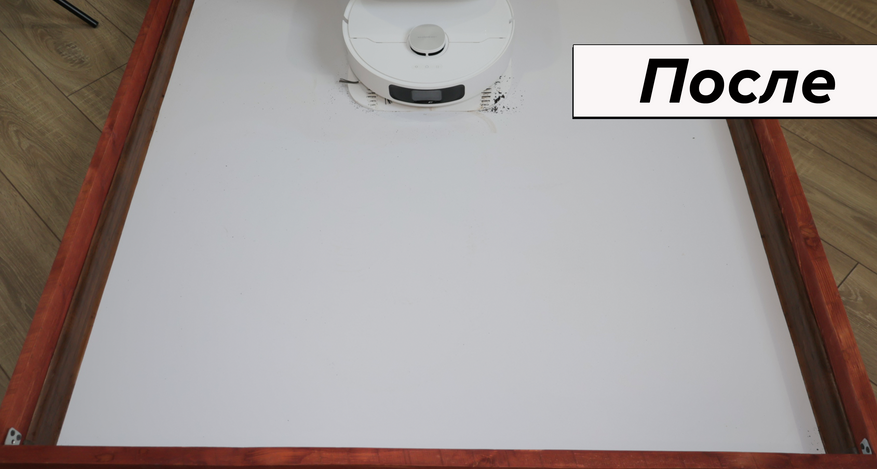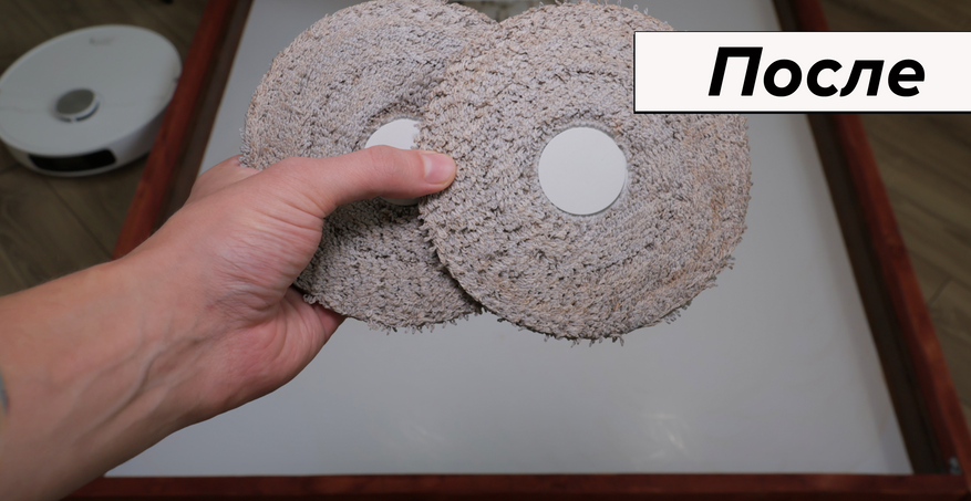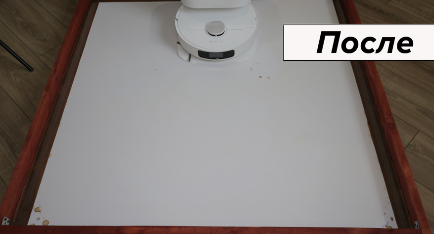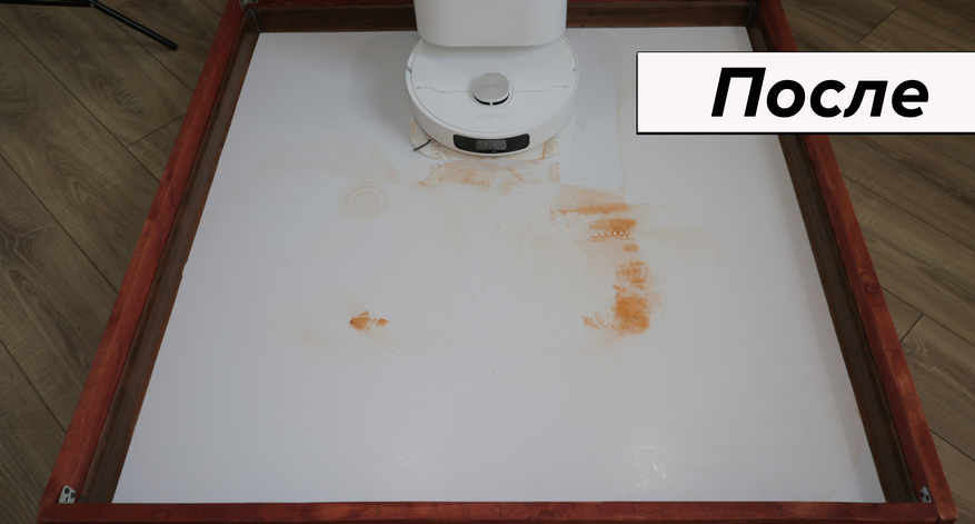Но основная причина купить Dreame L10 Prime — это качество влажной уборки. Робот смачивает салфетки на станции и оттирает водные пятна с одного прохода! Топовый результат. Вдоль стены промывает поворотами корпуса, на некоторых участках моет в ноль, на других оставляет недомытыми до 2 см. Салфетки Dreame прижимаются не слишком плотно — подобную ситуацию наблюдаем и у флагманских моделей производителя.