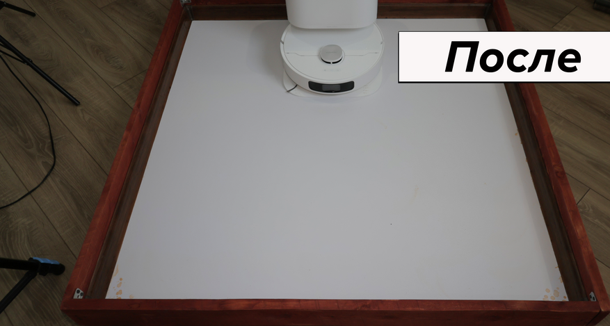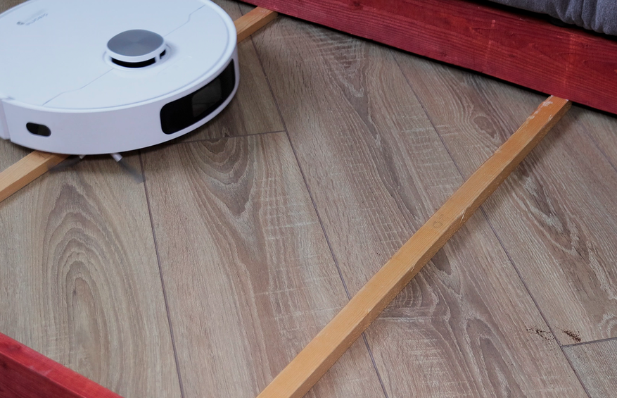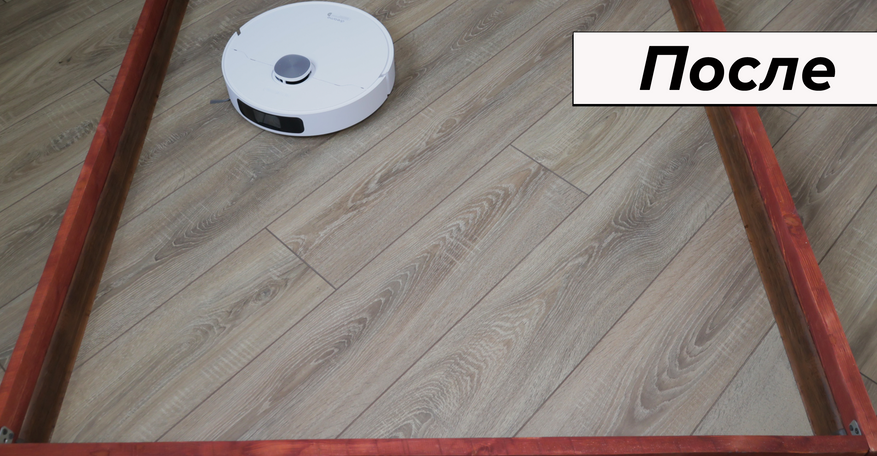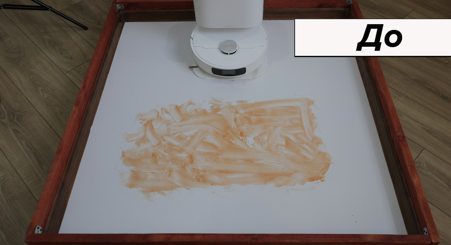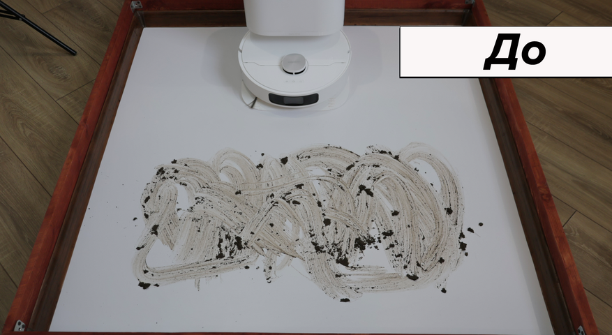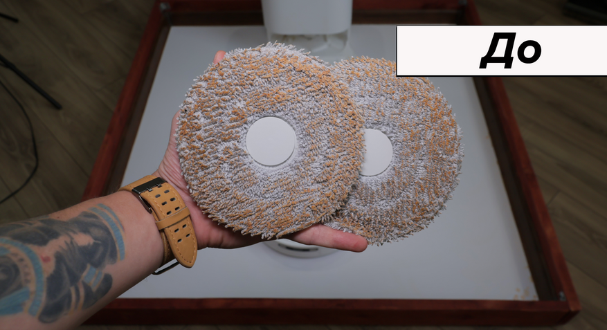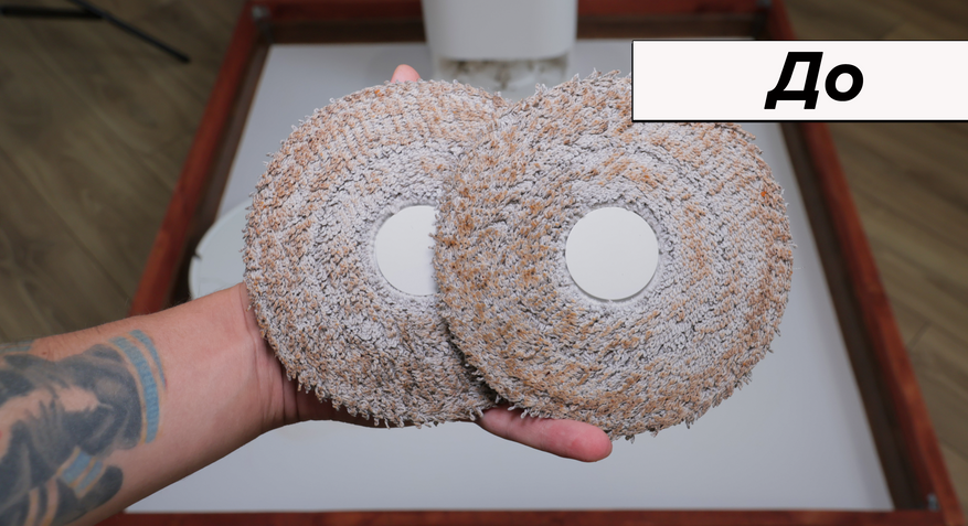 Но основная причина купить Dreame L10 Prime — это качество влажной уборки. Робот смачивает салфетки на станции и оттирает водные пятна с одного прохода! Топовый результат. Вдоль стены промывает поворотами корпуса, на некоторых участках моет в ноль, на других оставляет недомытыми до 2 см. Салфетки Dreame прижимаются не слишком плотно — подобную ситуацию наблюдаем и у флагманских моделей производителя.