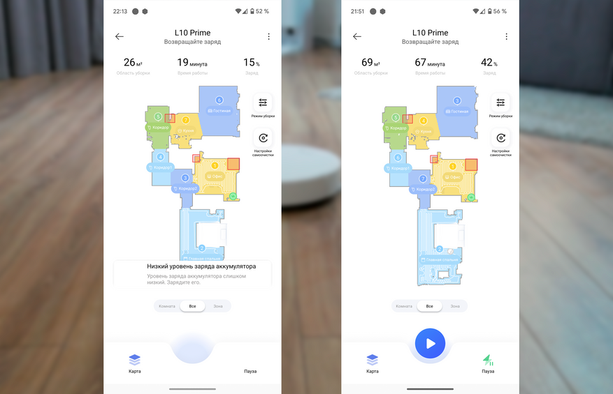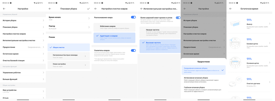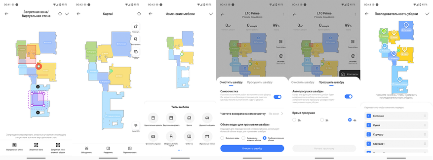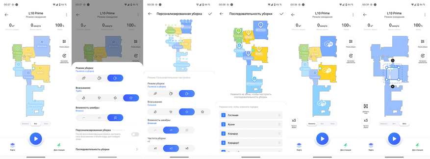 - определение всасывания, смачивания и количества проходов персонально для каждой комнаты;