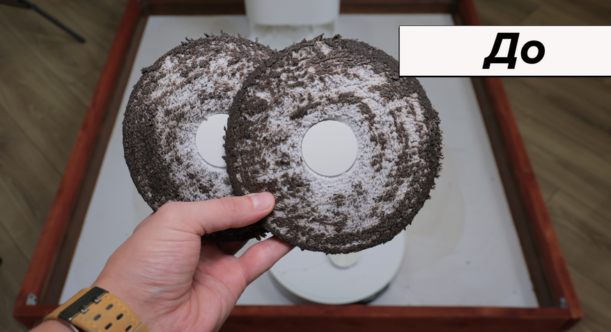 Резиновый валик делает большую часть работы за счет механической обработки покрытий, торцевая щётка хорошо справляется с периферийными зонами. Вот что по итогу удалось показать: