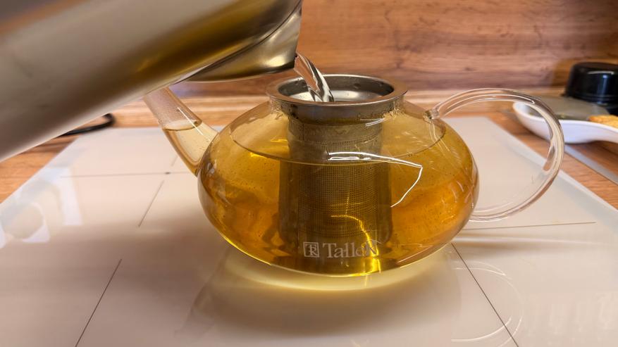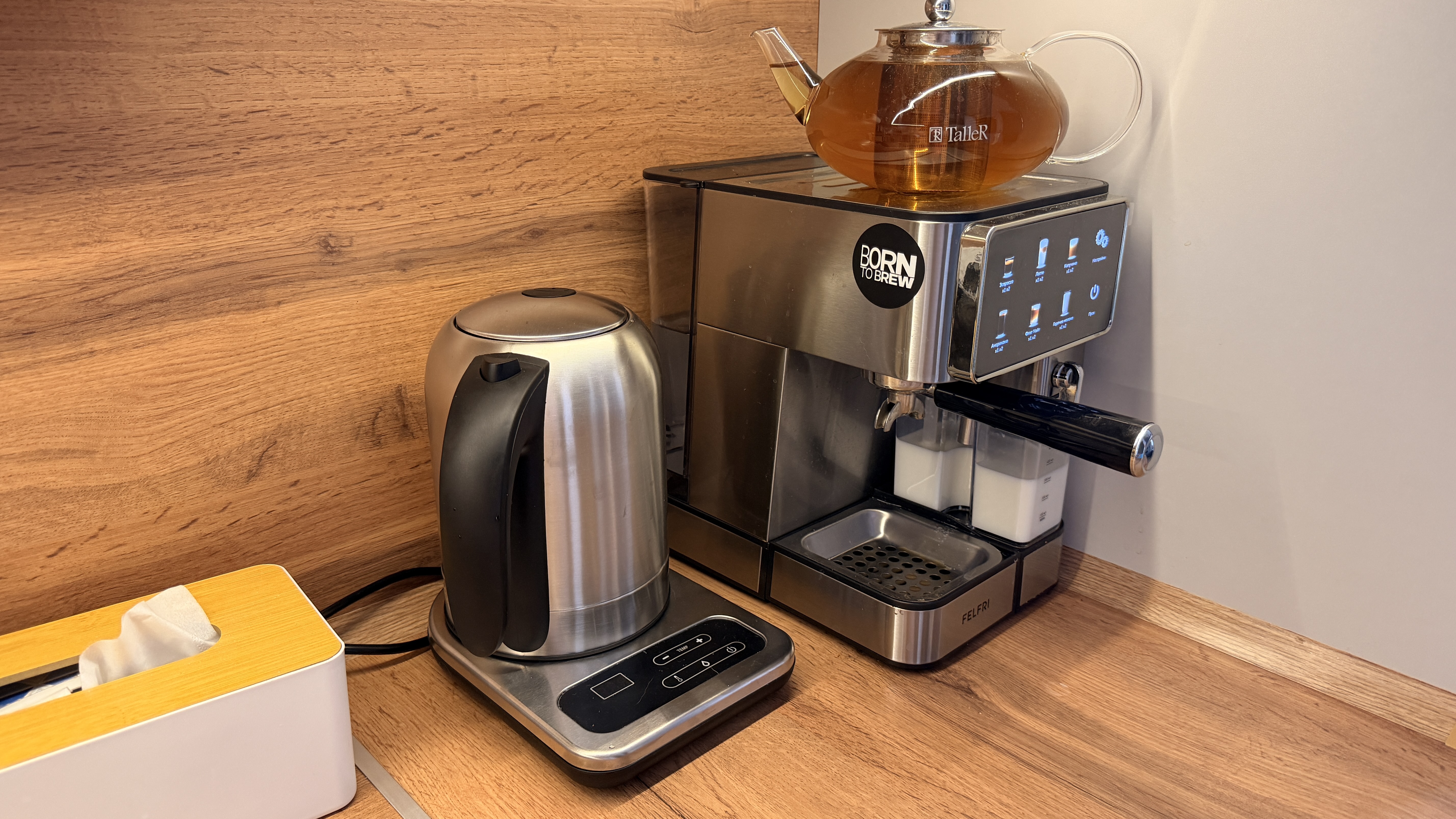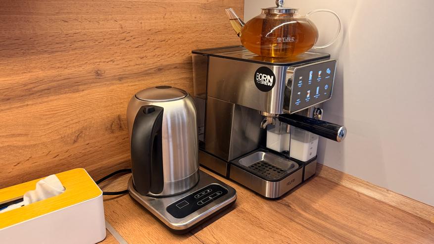 Для поддержания нужной температуры просто выбираем необходимое значение и чайник будет удерживать температуру, периодически включаясь. При кипячении потребляет около 1950 Вт электроэнергии, а шумность во время интенсивного кипения не более 62 ДБ. Вполне классические параметры. Чайник вполне неплохо вписался в дизайн кухни, рядом с кофемашиной. Можно приступать к чаепитию.