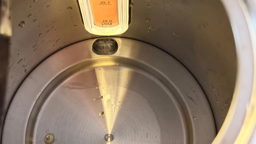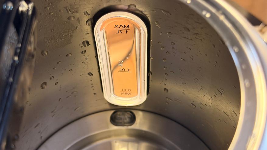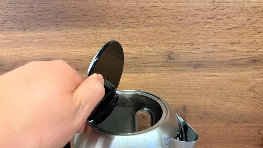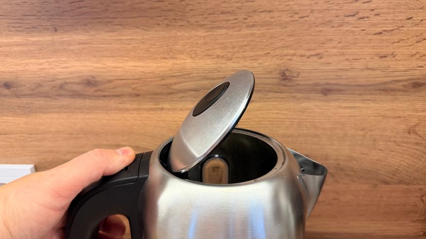 Корпус из двух половинок, на нижней расположился логотип компании. Носик также из металла, с достаточно широким изливом, корректность наливания воды, конечно, проверим ниже. Внутри носика, традиционно вставлен нейлоновый фильтр. Сверху на крышке пластиковая вставка, чтобы закрывать крышку и не обжечься, а на ручке механическая подпружиненная кнопка для открытия крышки. Хотел бы отметить большое окно для проверки уровня воды, разумеется, на нем нанесена шкала. Оно удобное, не придется приглядываться, чтобы узнать уровень воды.