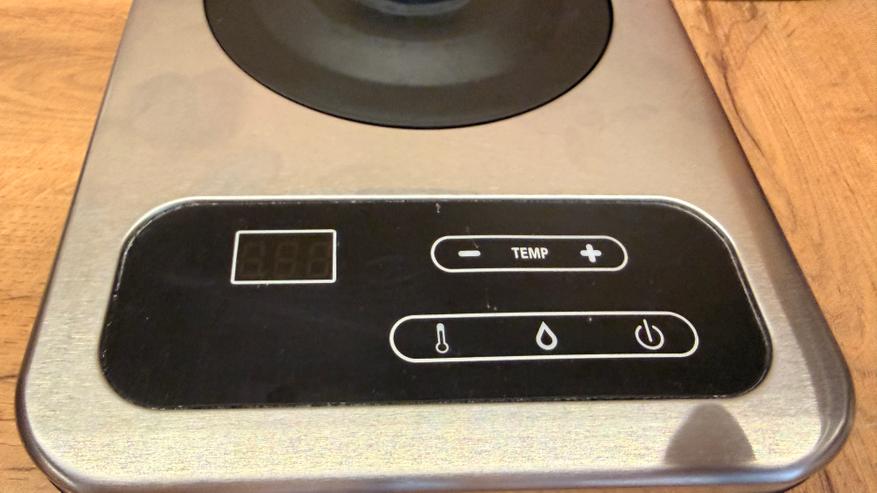 База чуть отличается от привычной классики. Тут вперед выступает блок управления, на котором обнаружим дисплей, кнопки выбора режима и регулировки температуры. Кнопки сенсорные, корпус крышки базы из металла.
