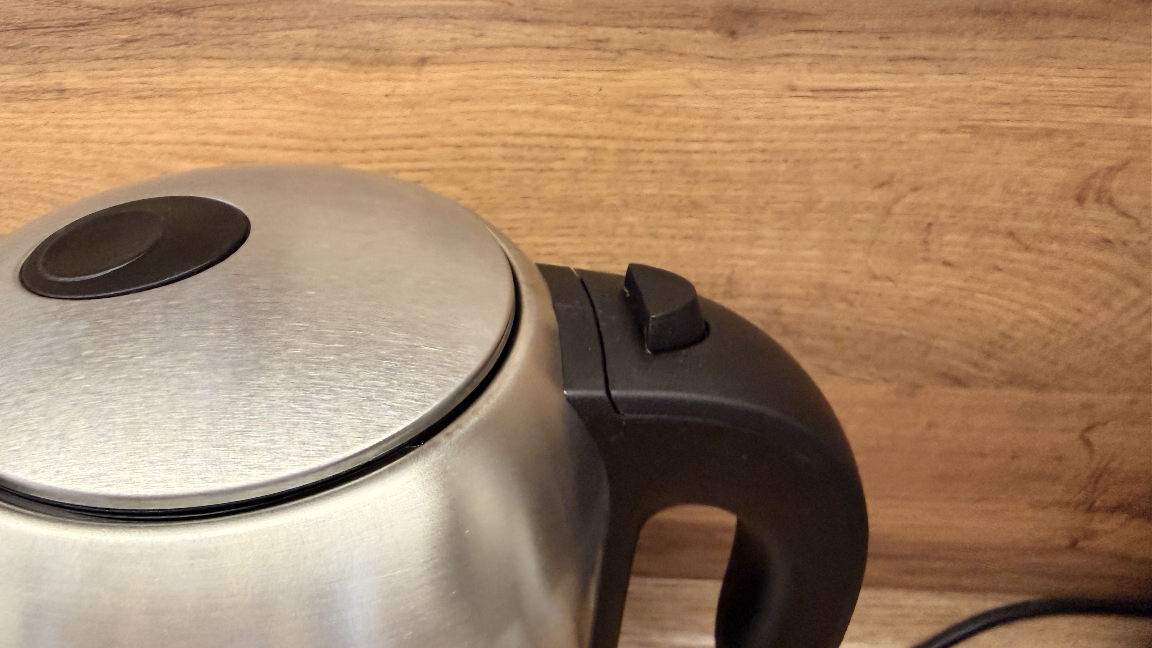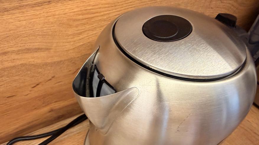 Чайник выбрал за стальной корпус, у меня трудится на каждодневной основе кофемашина в стальном оформлении, решил, что похожее оформление бытовой техники будет неплохо смотреться в углу кухни. Чайник с овальными формами сверху, с пластиковым окошком для проверки уровня и пластиковой черной ручкой.