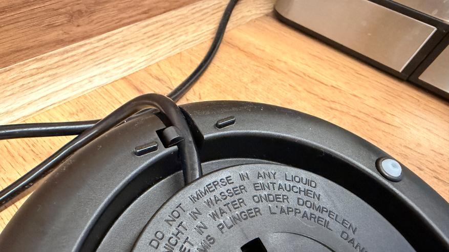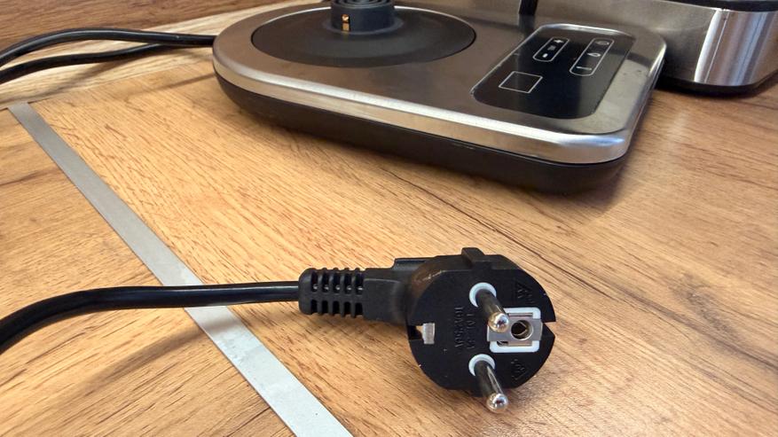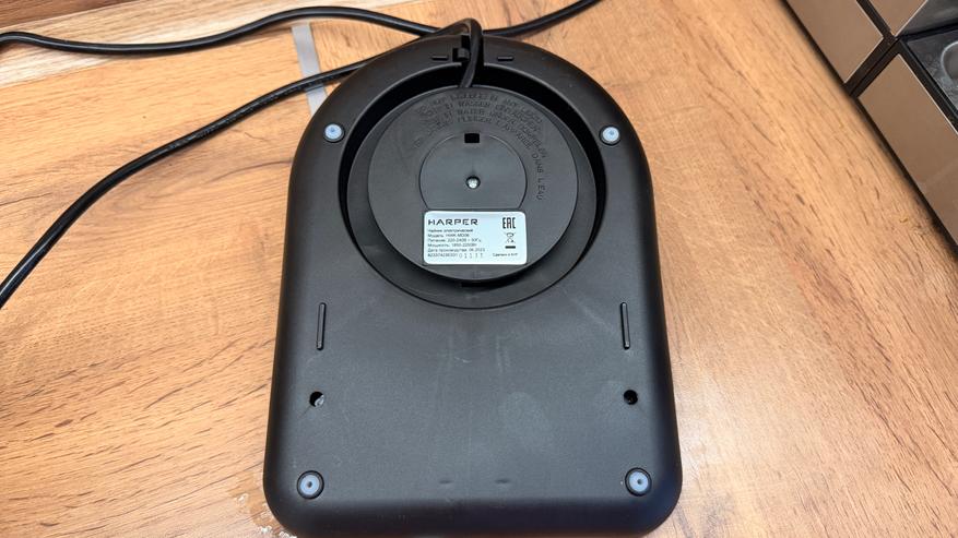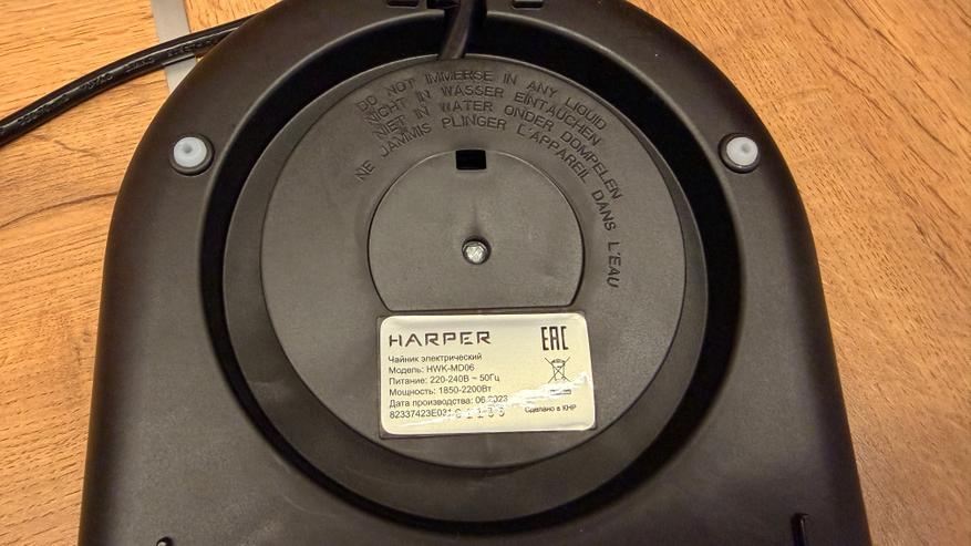 Смотка кабеля — штука необходимая, на наклейке можем почитать параметры модели, ножки из силикона не дают чайнику скользить по столу. Сетевой кабель длиной 0.7 метра, на конце евровилка с заземлением.