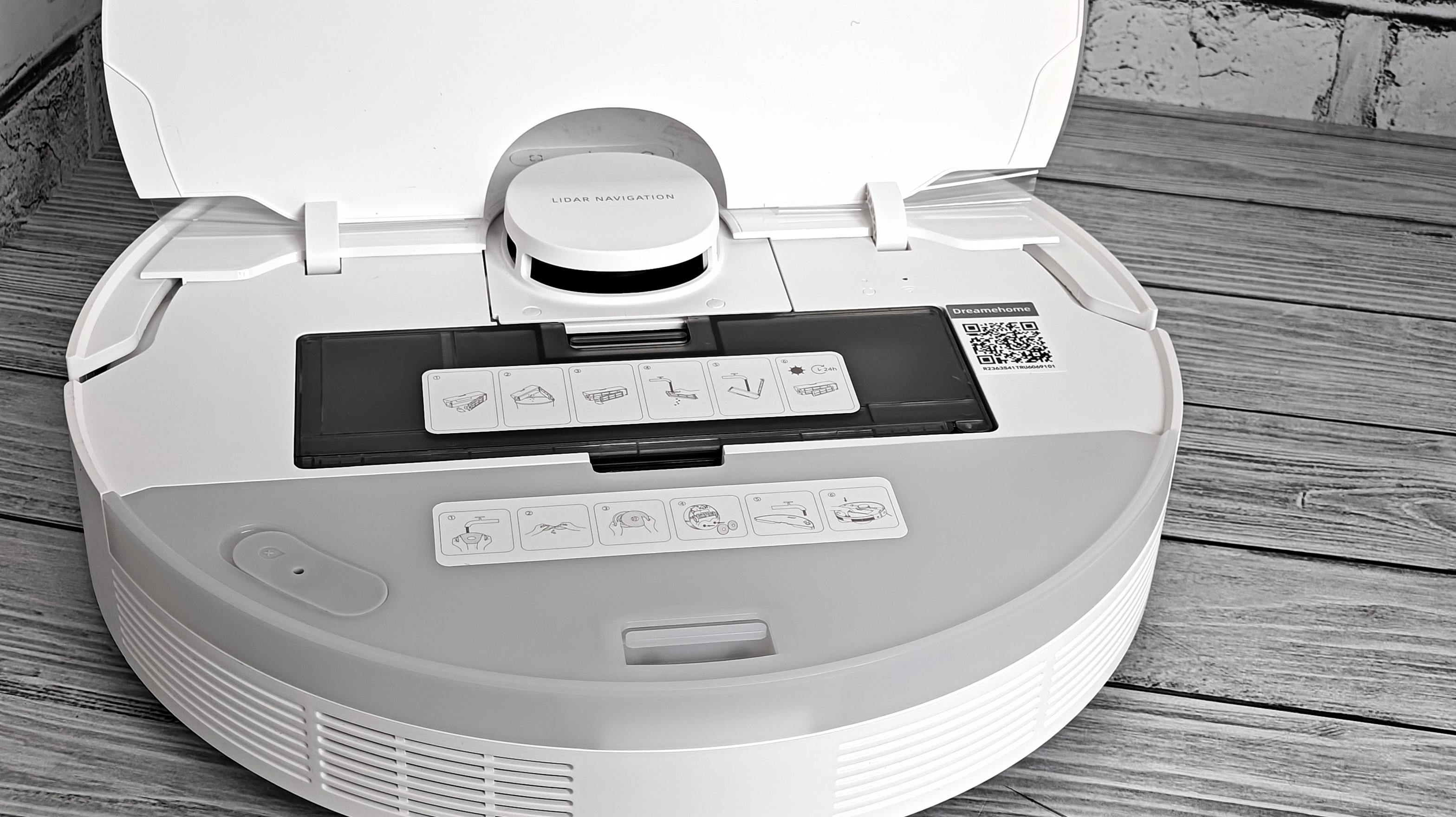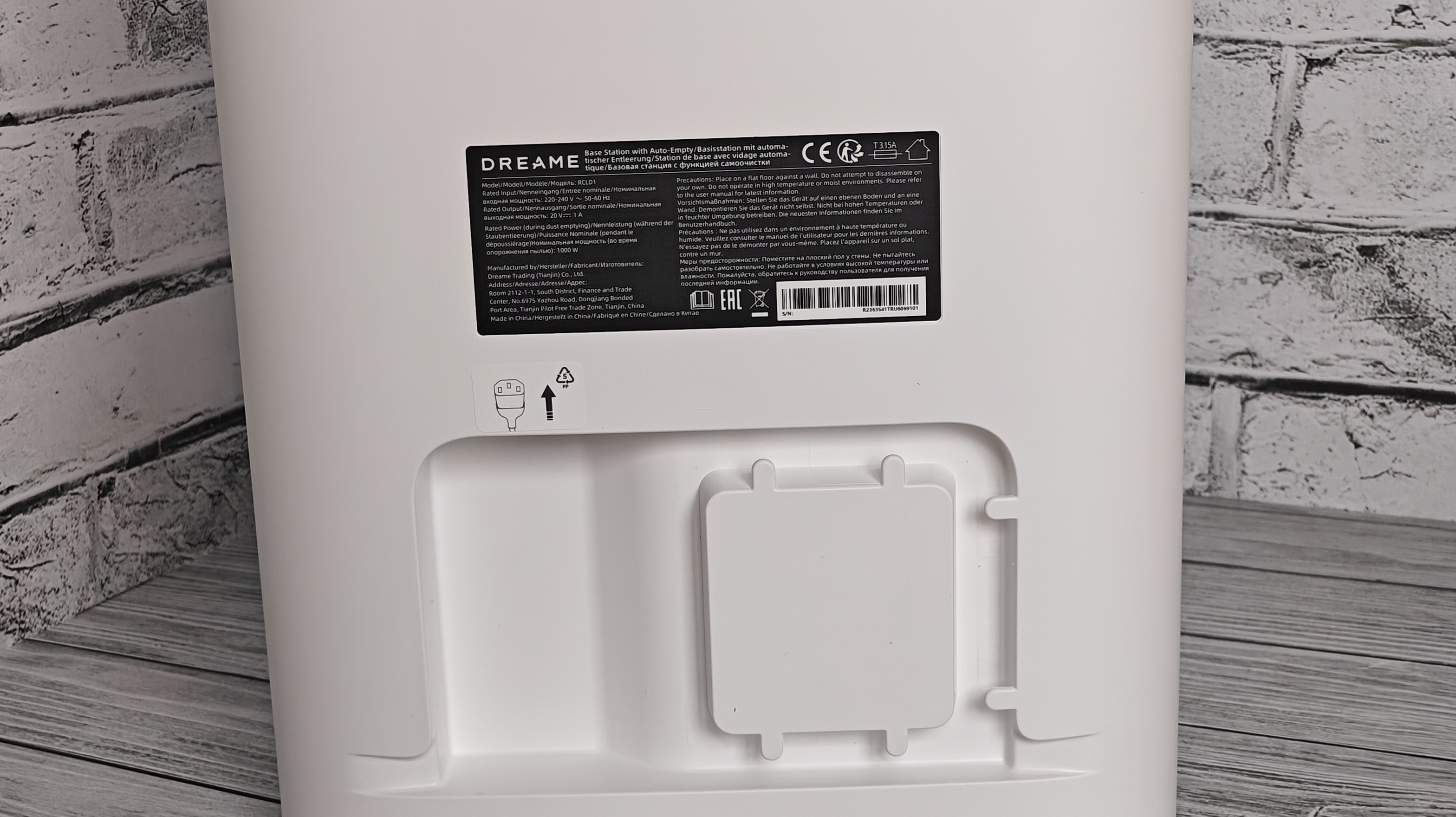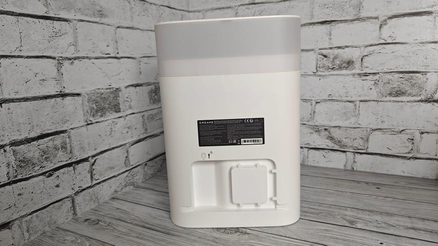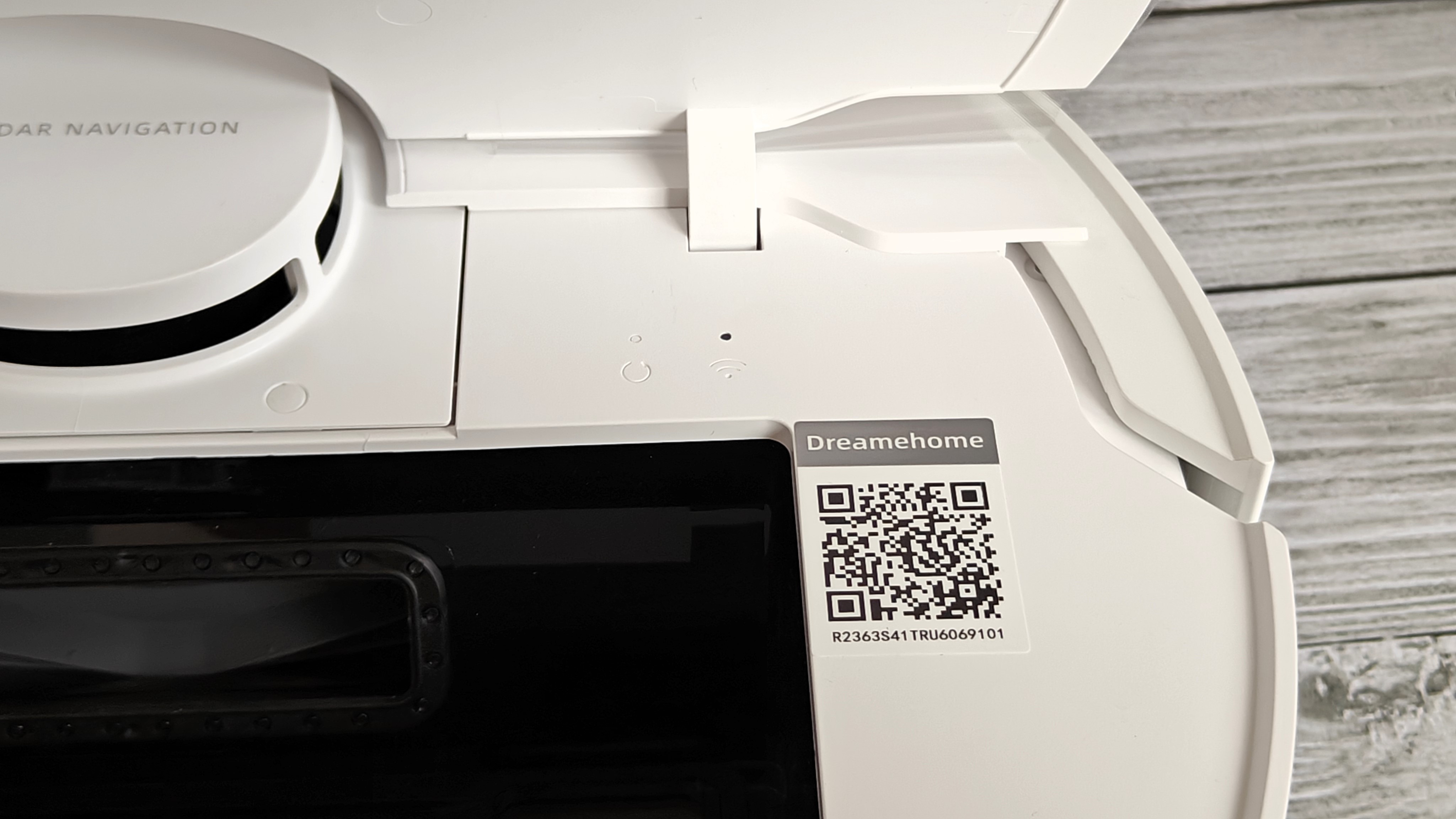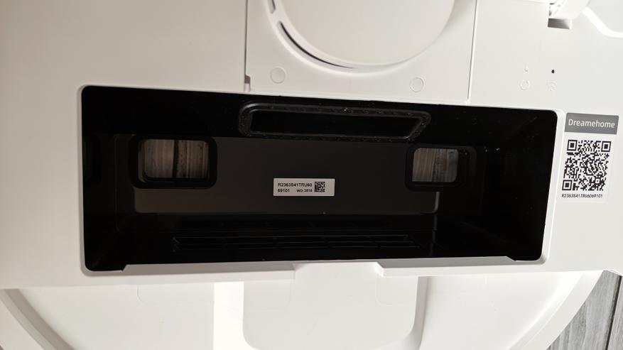 Отсек для контейнера также имеет два соответствующих отверстия. Емкость для воды имеет нажимной клапан для забора воды и датчик наличия ёмкости. Также под крышкой имеется кнопка сброса настроек и светодиод Wi-Fi соединения. Разумеется, есть QR- код для подключения к пылесосу.