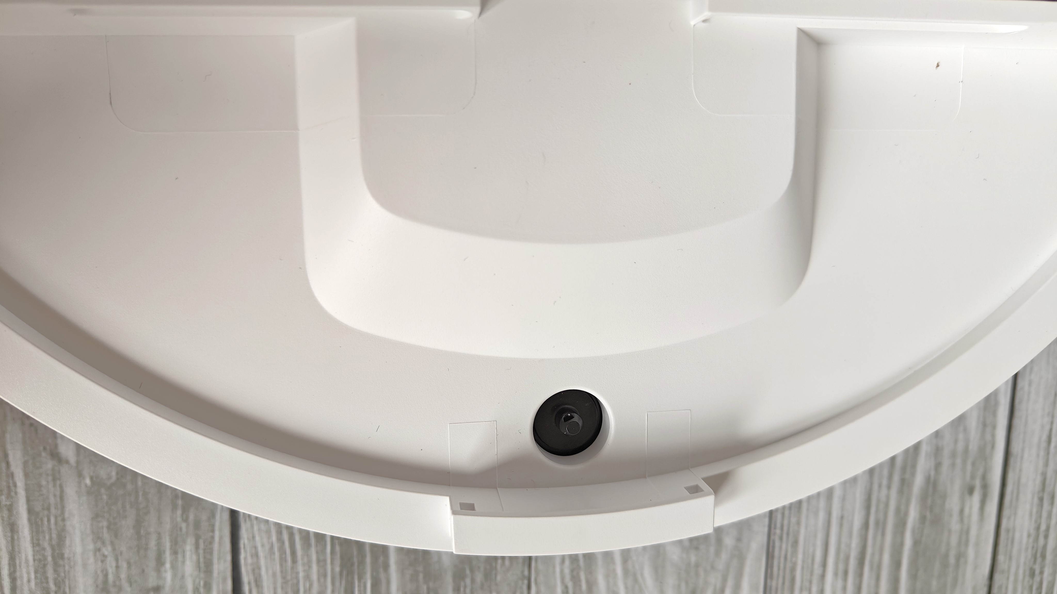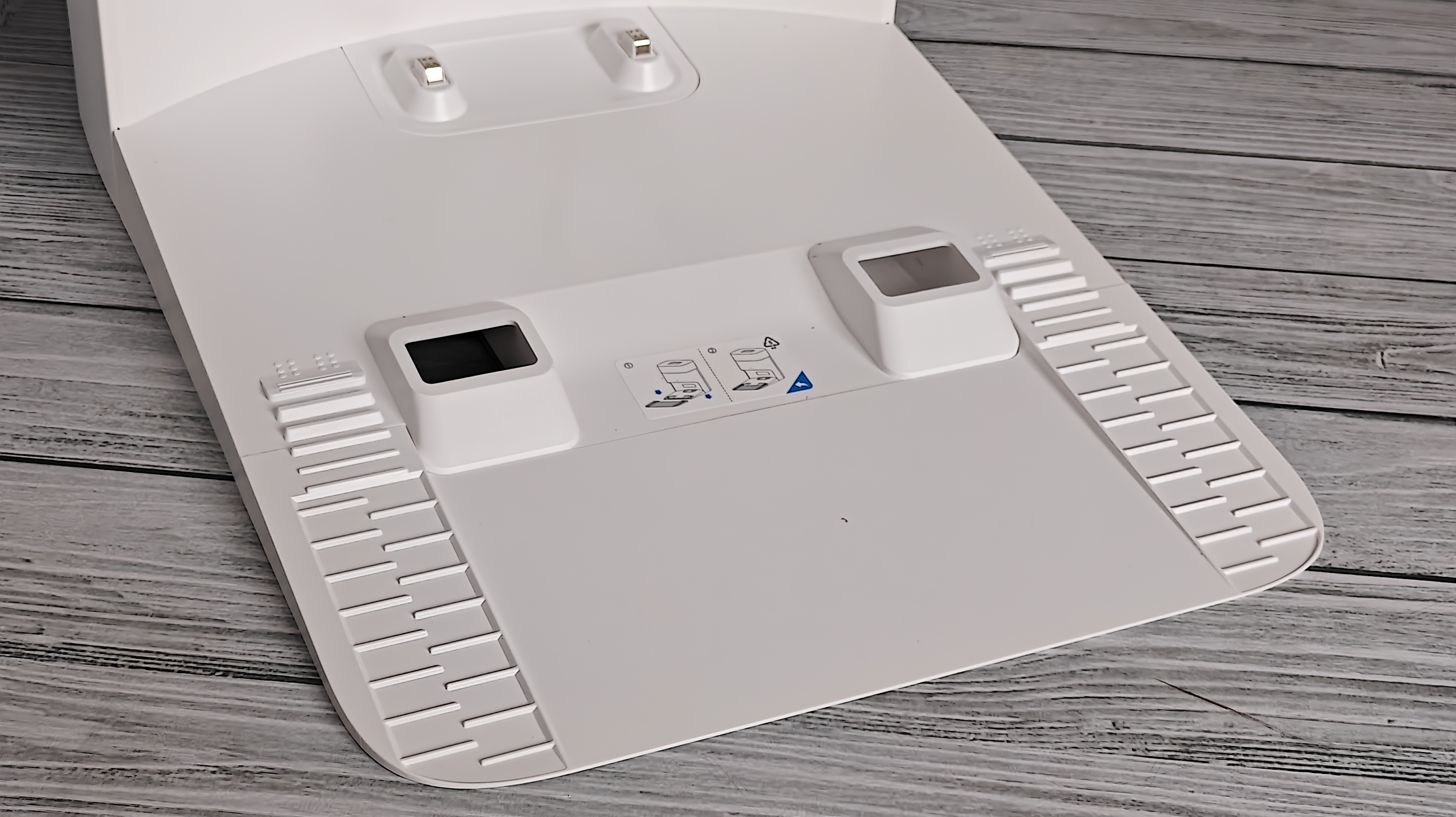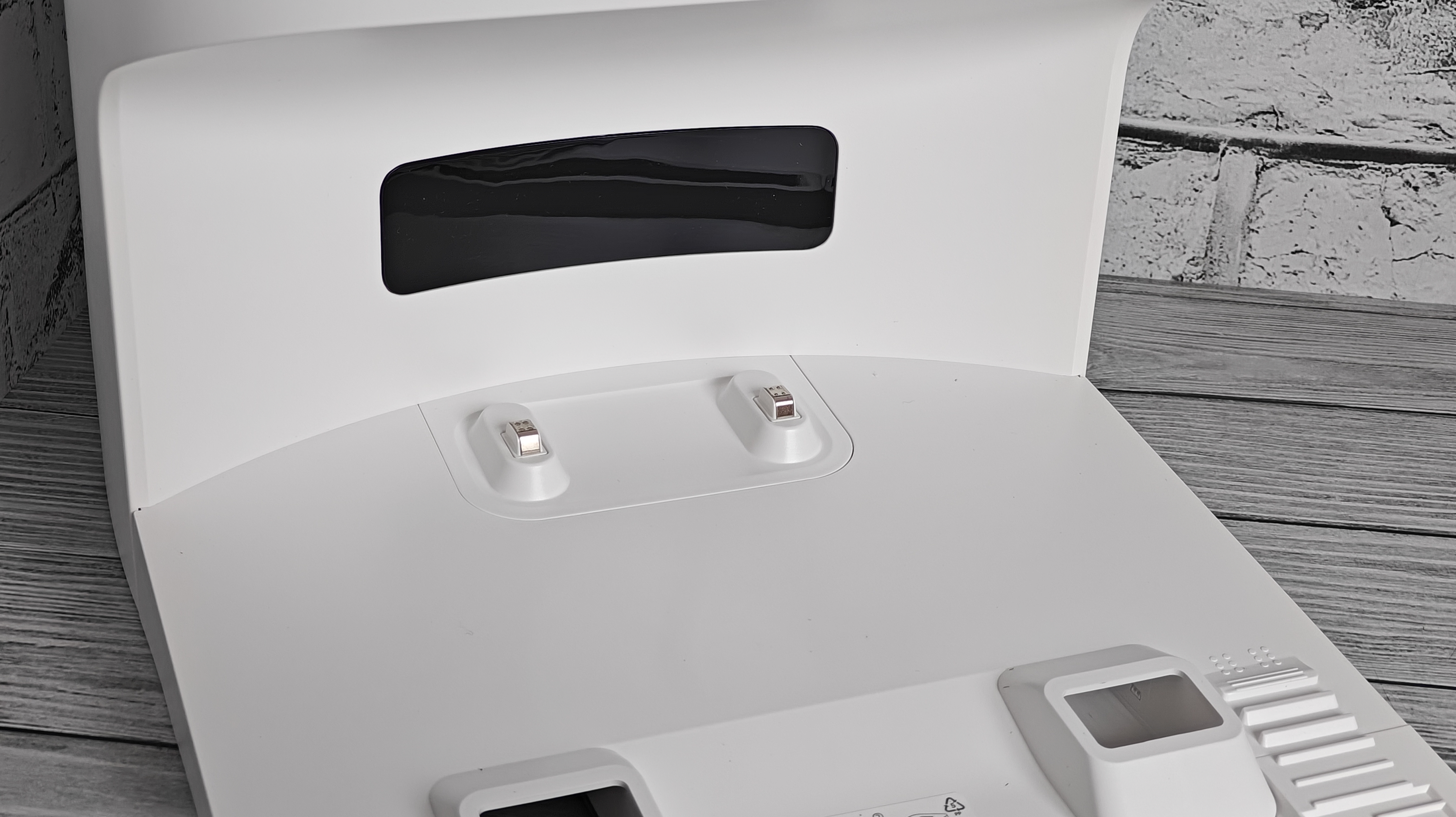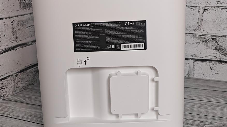 Отсек для контейнера также имеет два соответствующих отверстия. Емкость для воды имеет нажимной клапан для забора воды и датчик наличия ёмкости. Также под крышкой имеется кнопка сброса настроек и светодиод Wi-Fi соединения. Разумеется, есть QR- код для подключения к пылесосу.