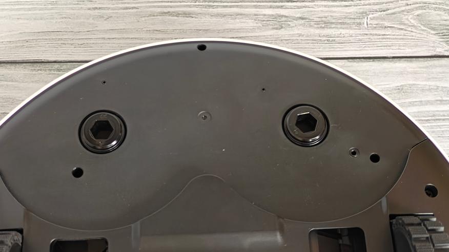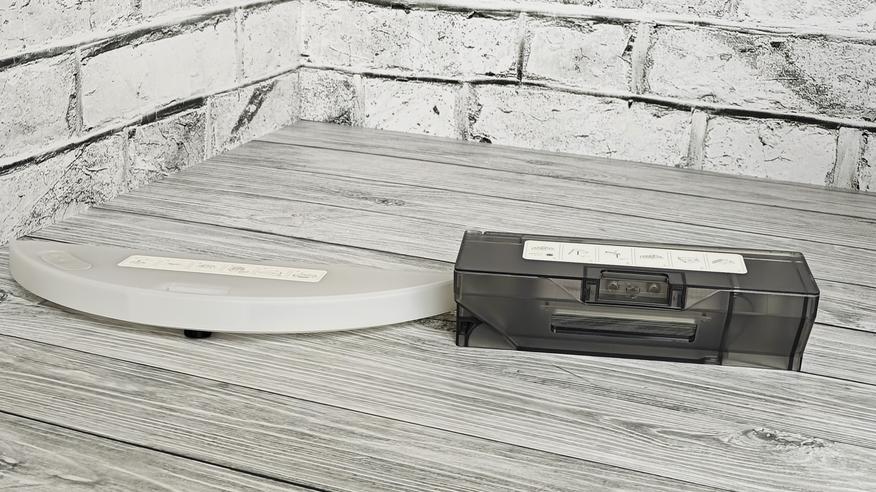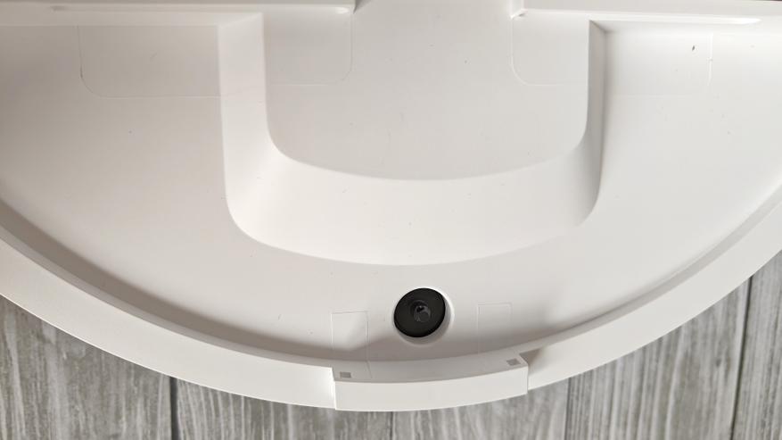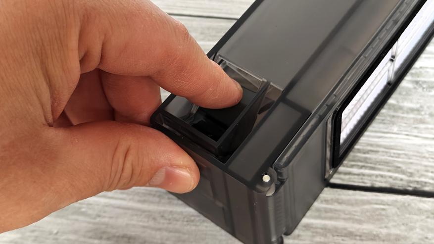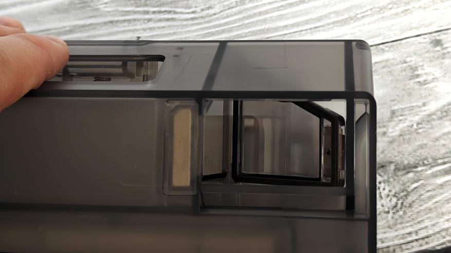 Сзади на корпусе мы видим отверстия для вывода воздуха. И именно с этой стороны нам организован доступ к емкости для воды и контейнеру. За такой апгрейд однозначно хочется сказать спасибо. Емкость для воды теперь намного удобнее заменять, не поднимая каждый раз робот-пылесос. Достаточно нажать кнопку и поднять емкость вверх. Так же делаем и с контейнером для сбора пыли.