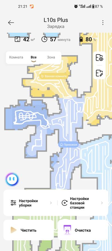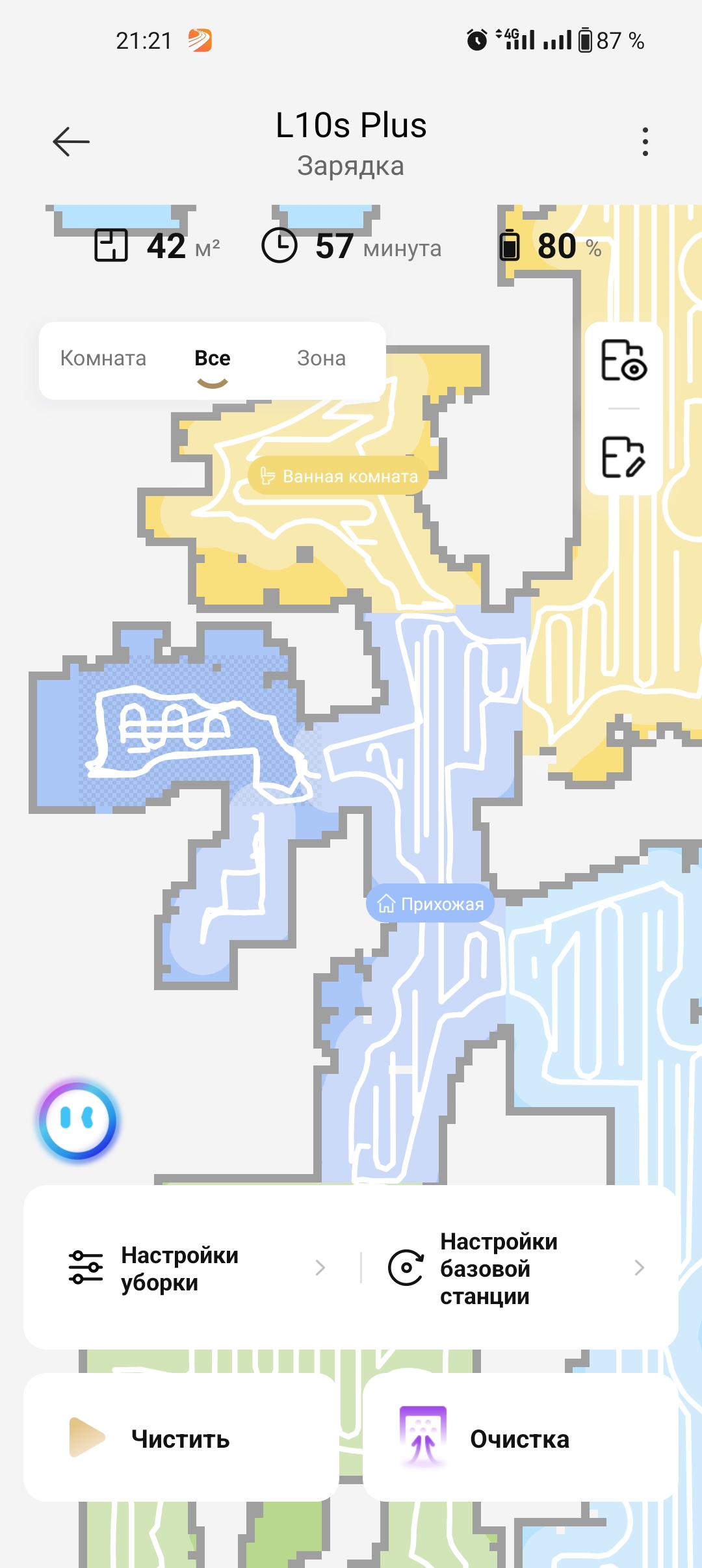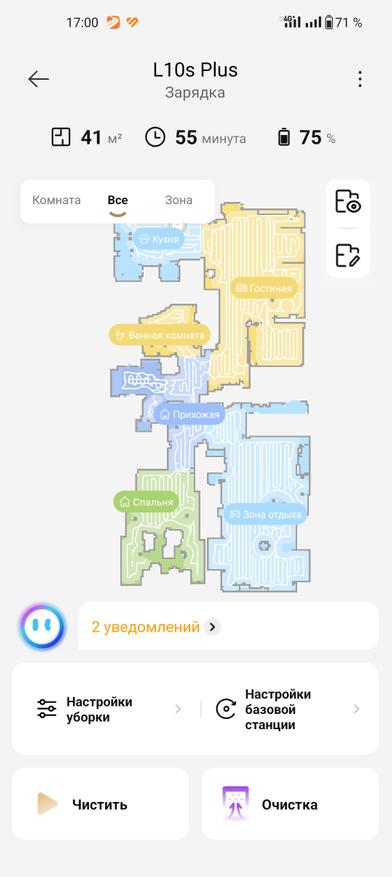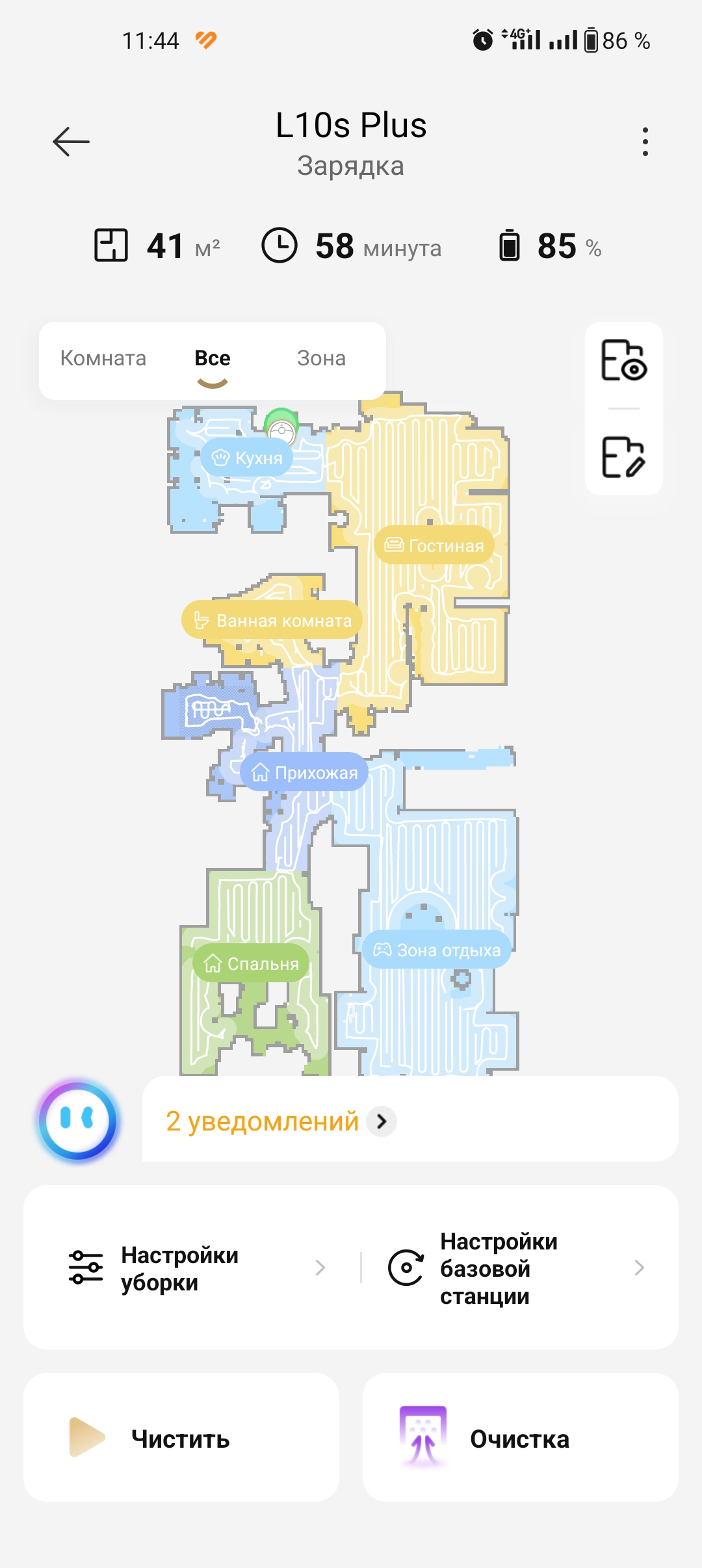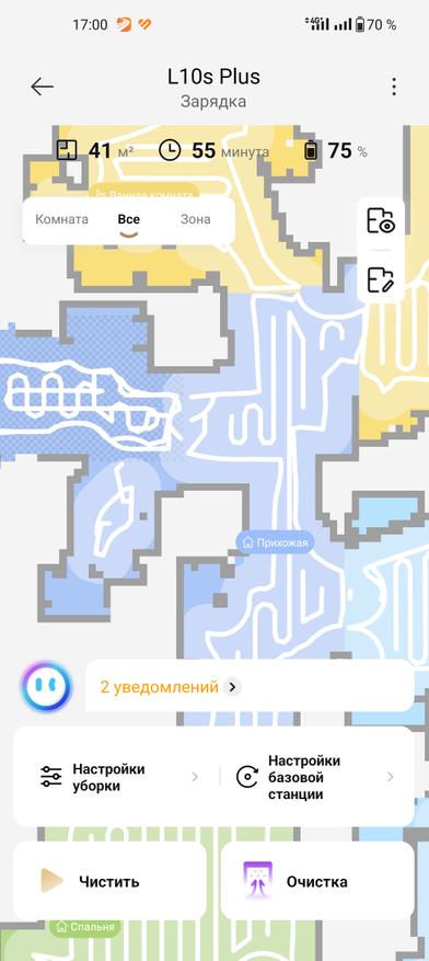 Для построения карты требуется первая очистка и прохождение робота по всем комнатам. После чего в приложении появляется карта помещения, размеченная на комнаты автоматически. Если это проведено некорректно, можно все отредактировать вручную. Каждой комнате можно задать характер уборки, какую-то убирать с влажной уборкой, в какой-то просто собрать мусор, какую-то обойти дважды. Разумеется, можно задавать зоны уборки, запретные зоны и виртуальные стены.
