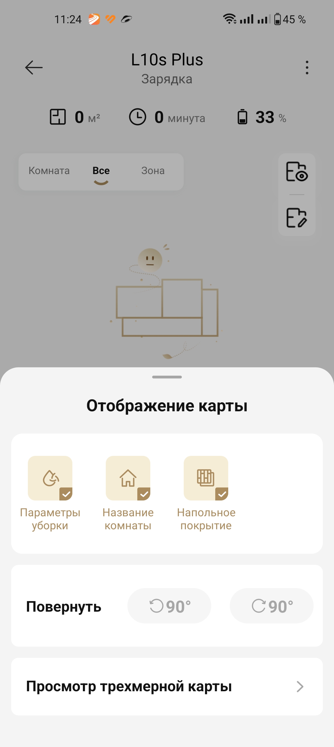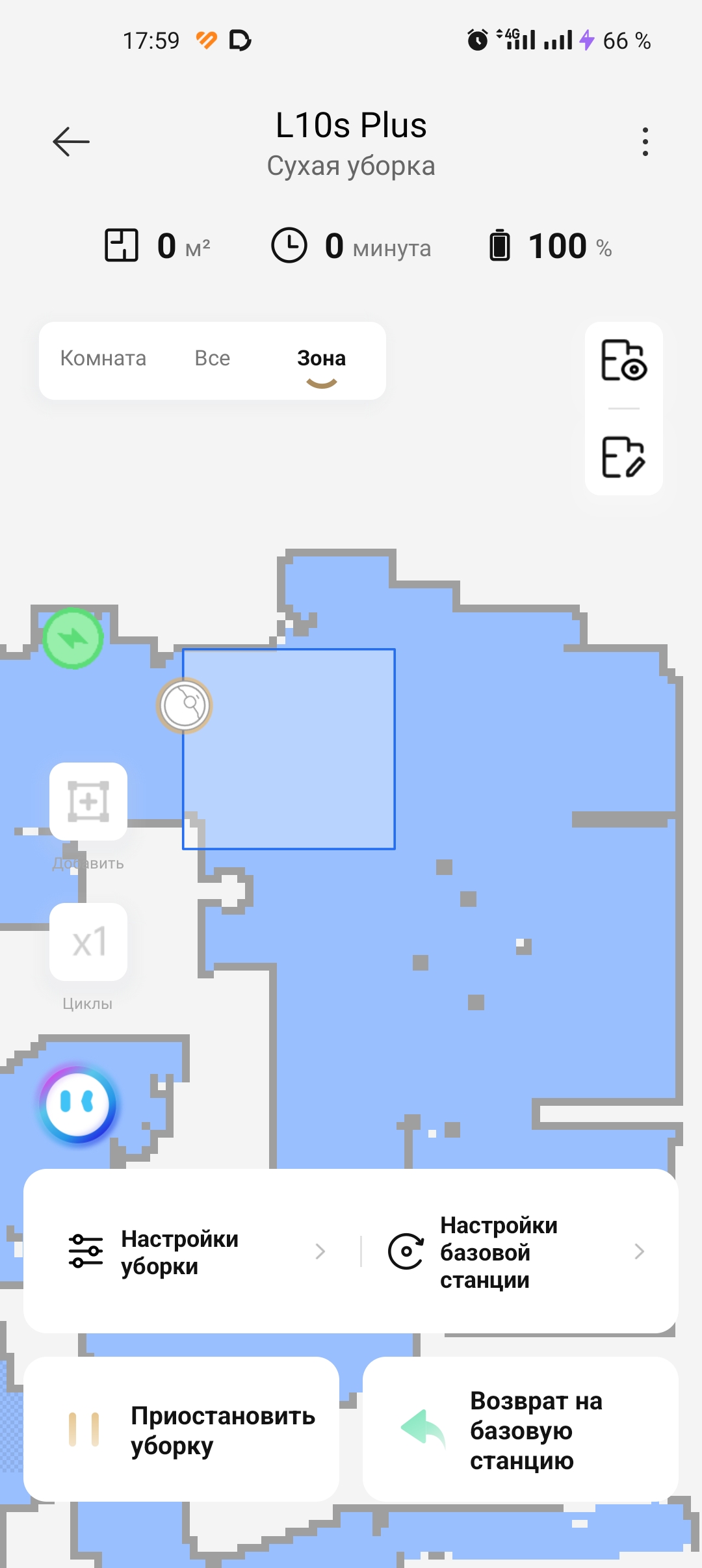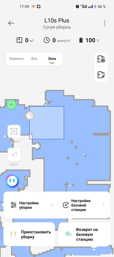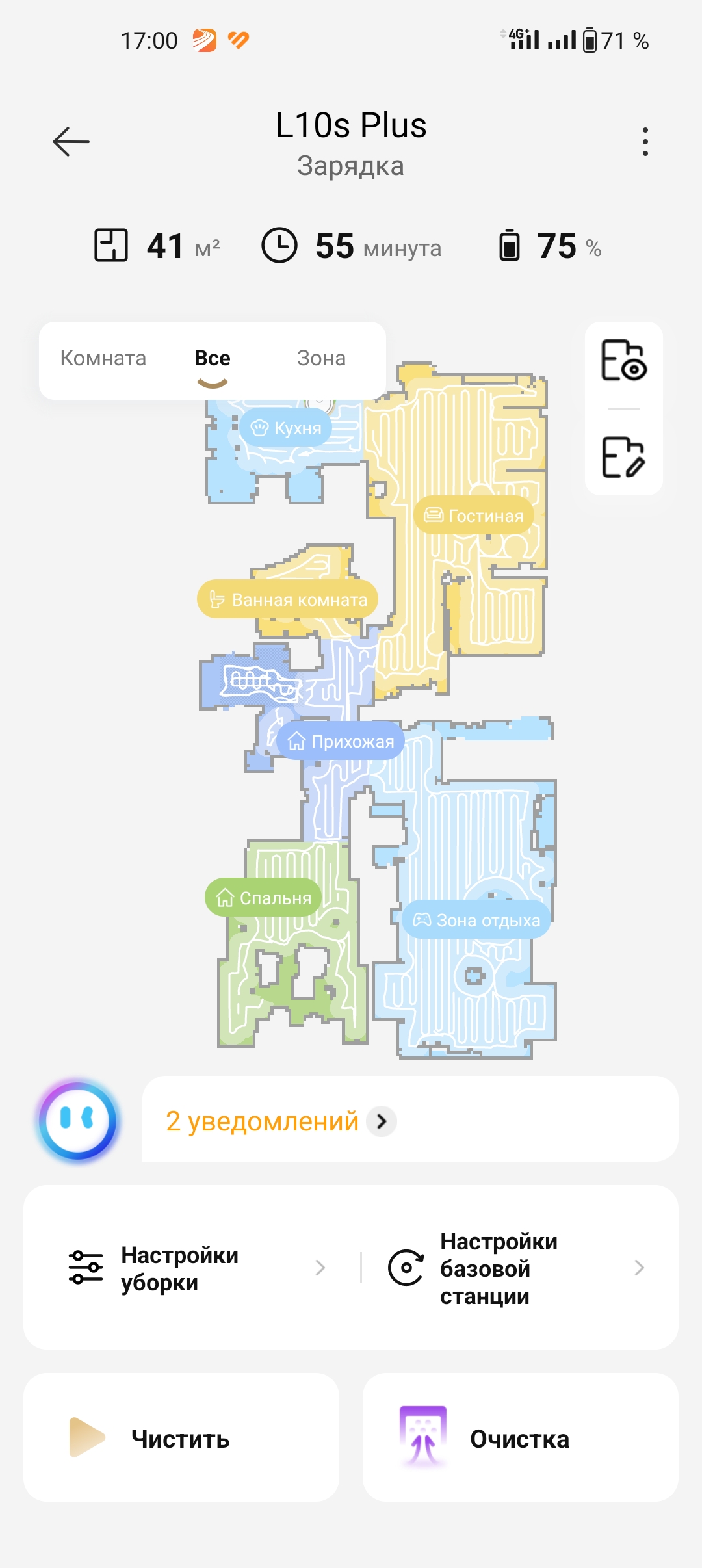Для построения карты требуется первая очистка и прохождение робота по всем комнатам. После чего в приложении появляется карта помещения, размеченная на комнаты автоматически. Если это проведено некорректно, можно все отредактировать вручную. Каждой комнате можно задать характер уборки, какую-то убирать с влажной уборкой, в какой-то просто собрать мусор, какую-то обойти дважды. Разумеется, можно задавать зоны уборки, запретные зоны и виртуальные стены.