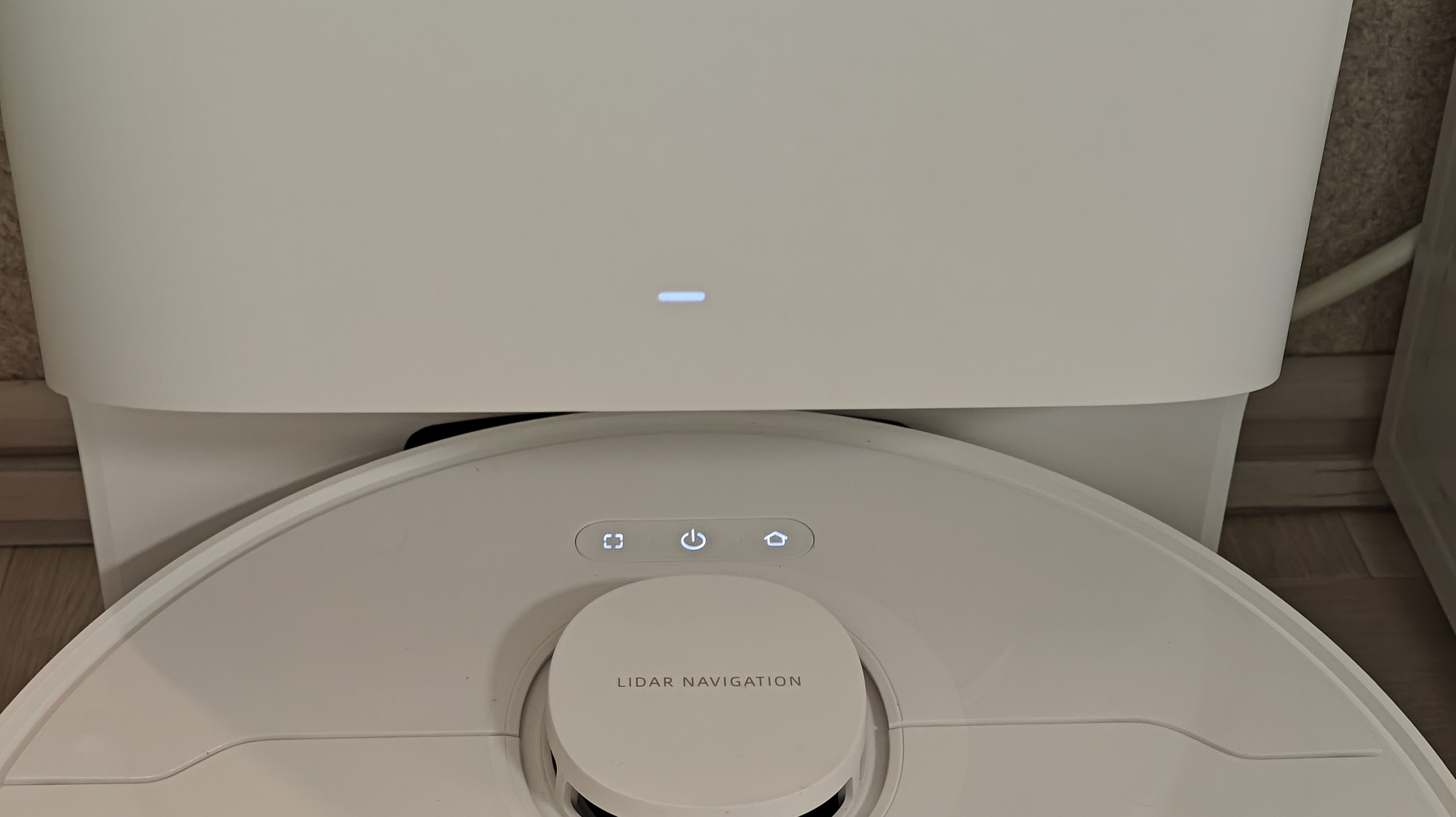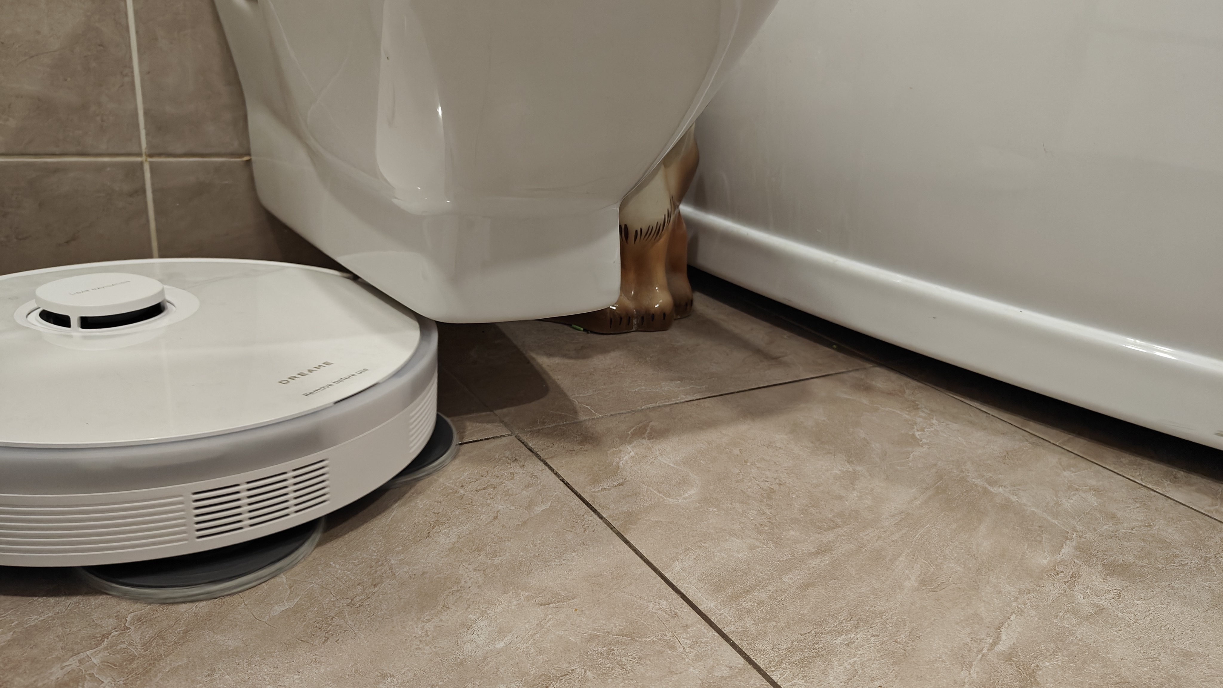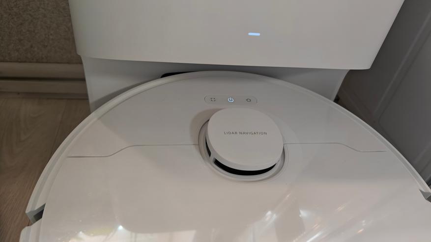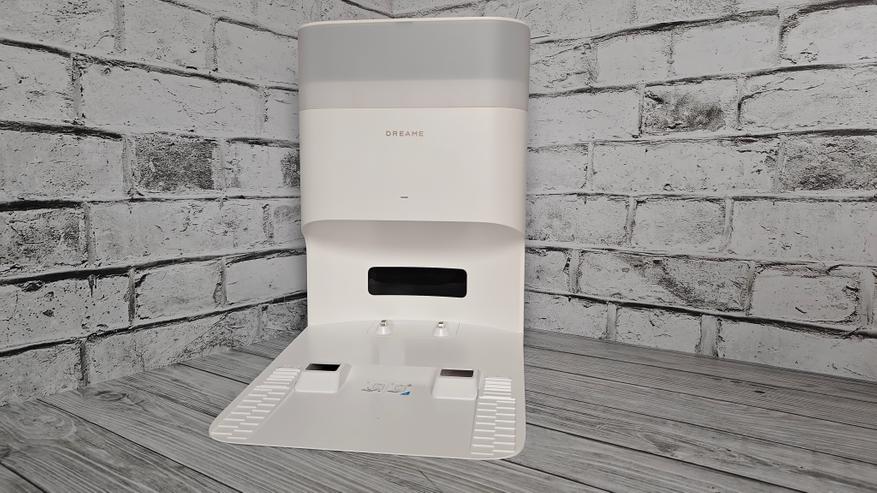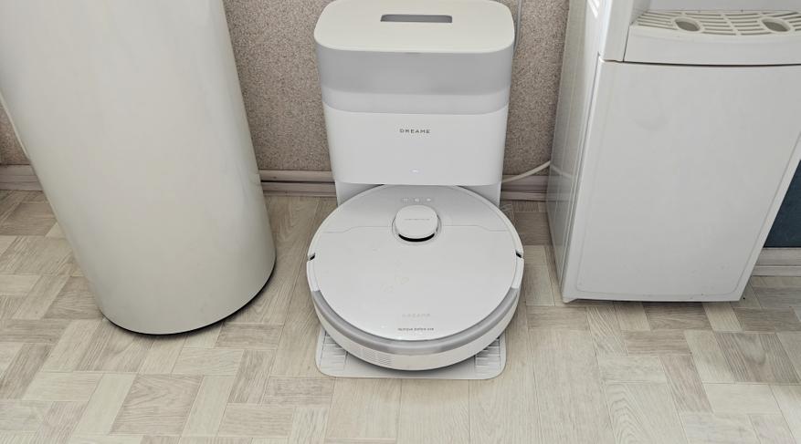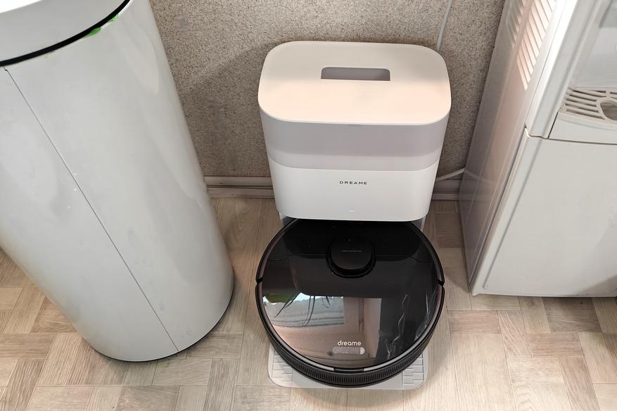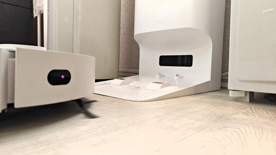 Робот очень осмотрительно забирается на эстакаду у базы. Причем для него у меня не созданы особые условия, он стоит в нише между умным ведром и диспансером для воды. Но это роботам от Dreame никогда и не мешало. Они всегда возвращаются «домой».