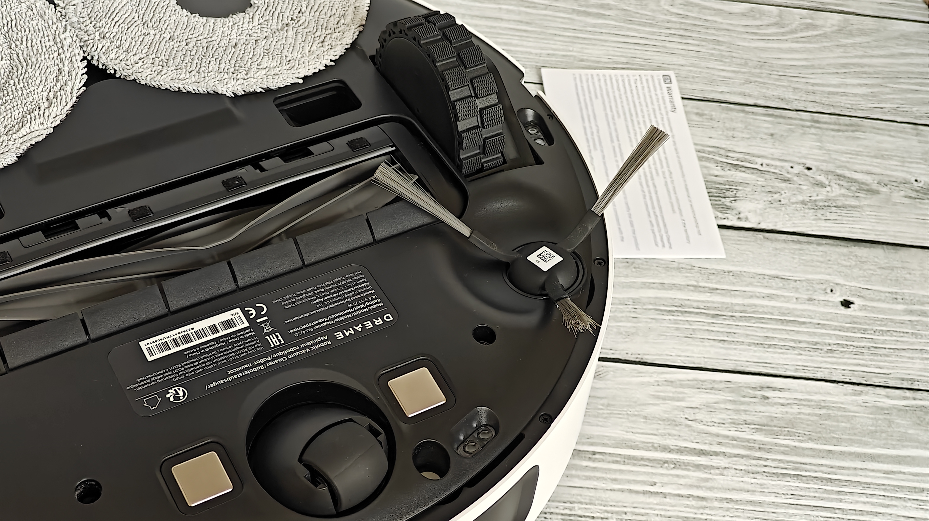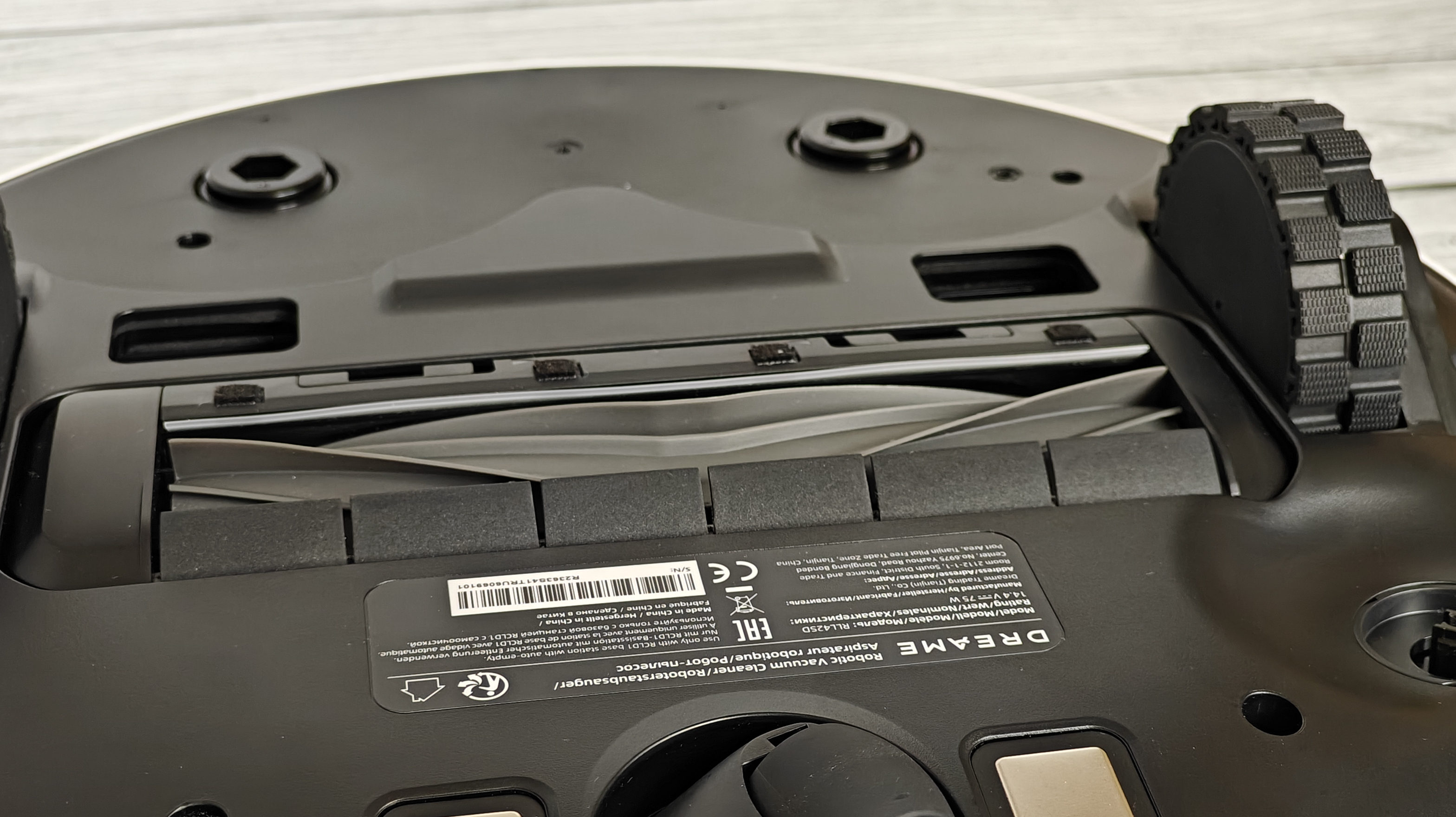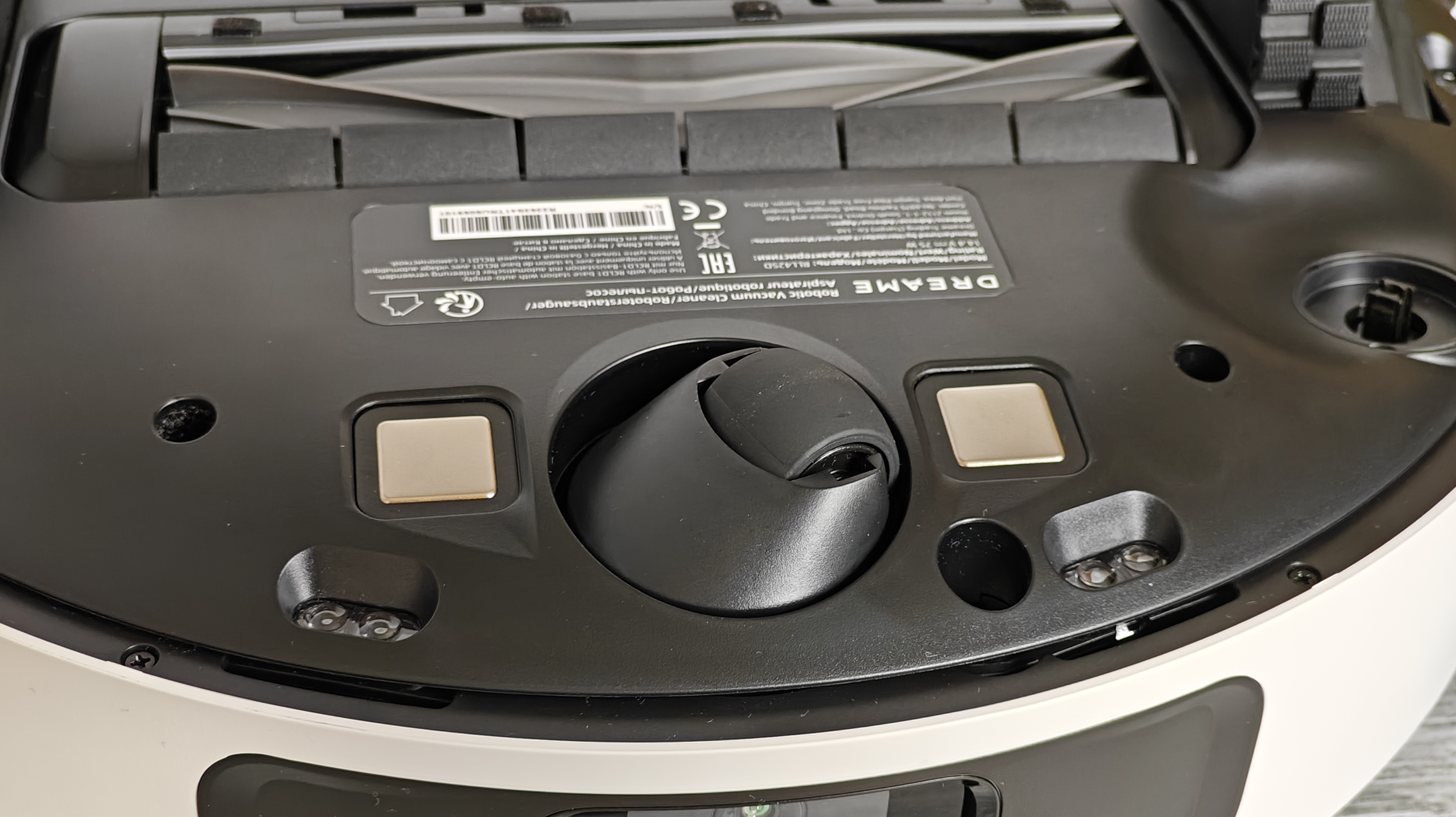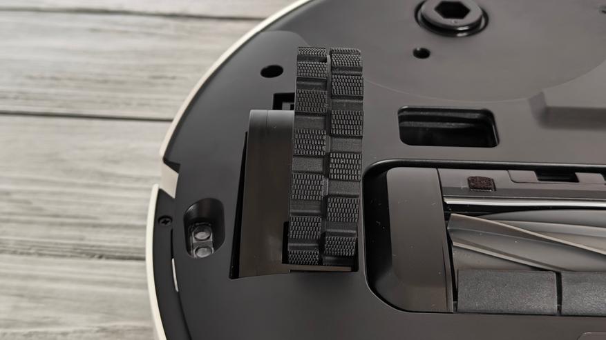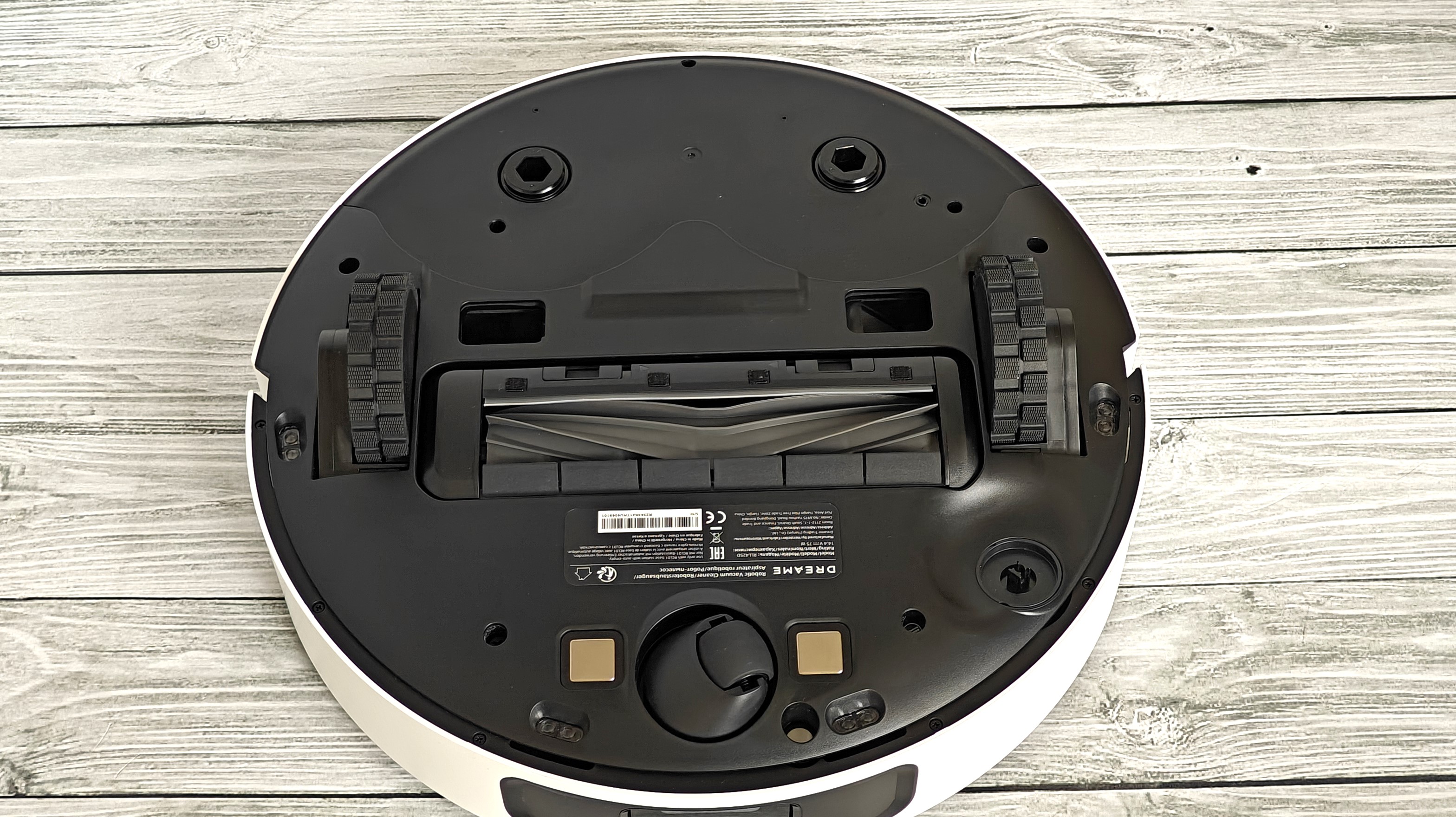 Нижняя часть у робота также привычно классическая. Тут отсек щетки, два колеса, колесо малое для поворотов, контакты зарядки, датчики обнаружения падения.