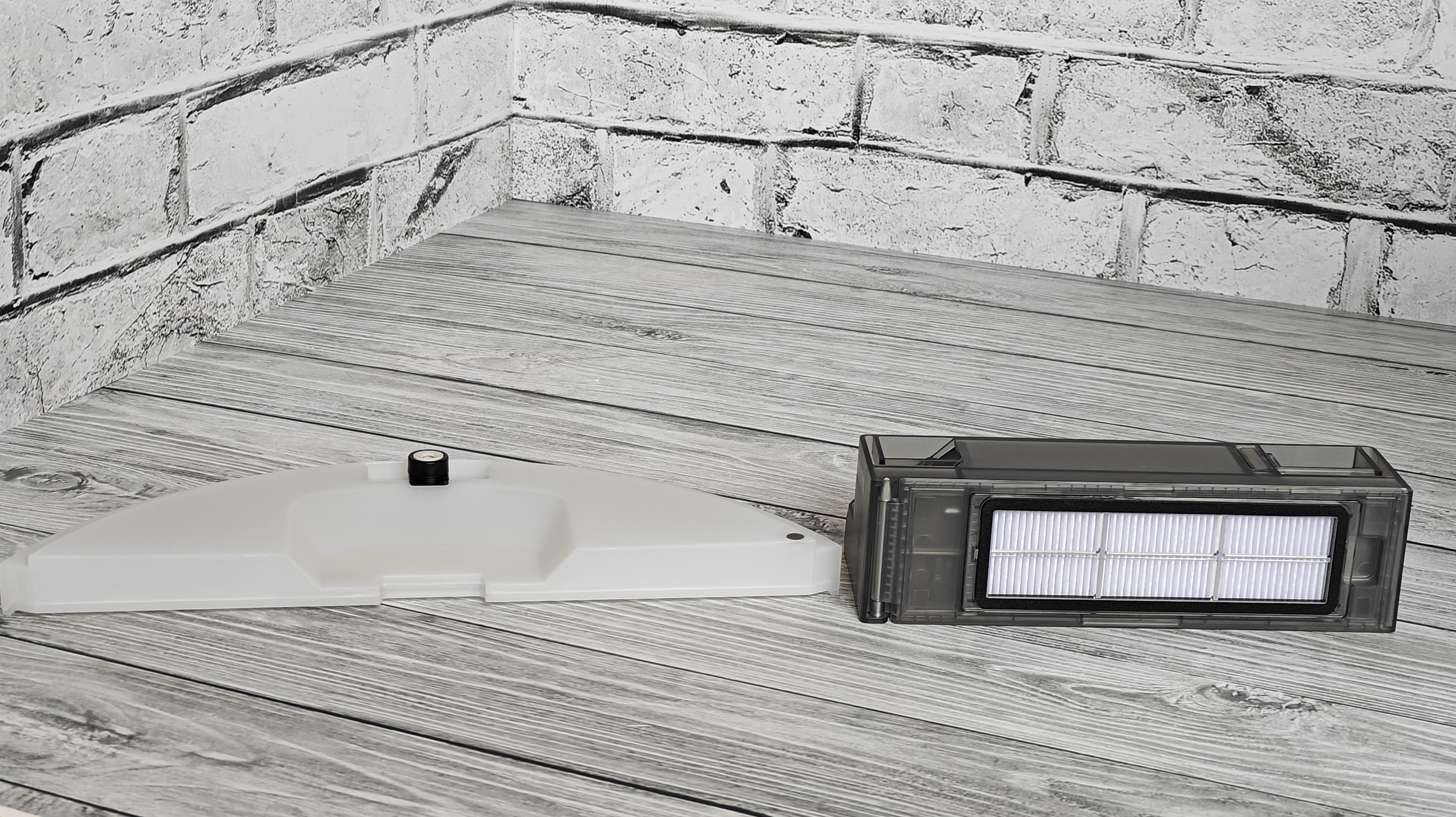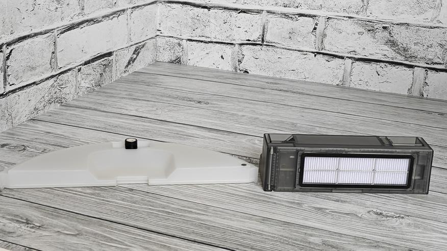 Контейнер для сбора пыли и мусора практически классический. С одной стороны отверстие для забора с другой Hepa фильтр. Крепление салфеток из микрофибры при помощи велкро-липучек.