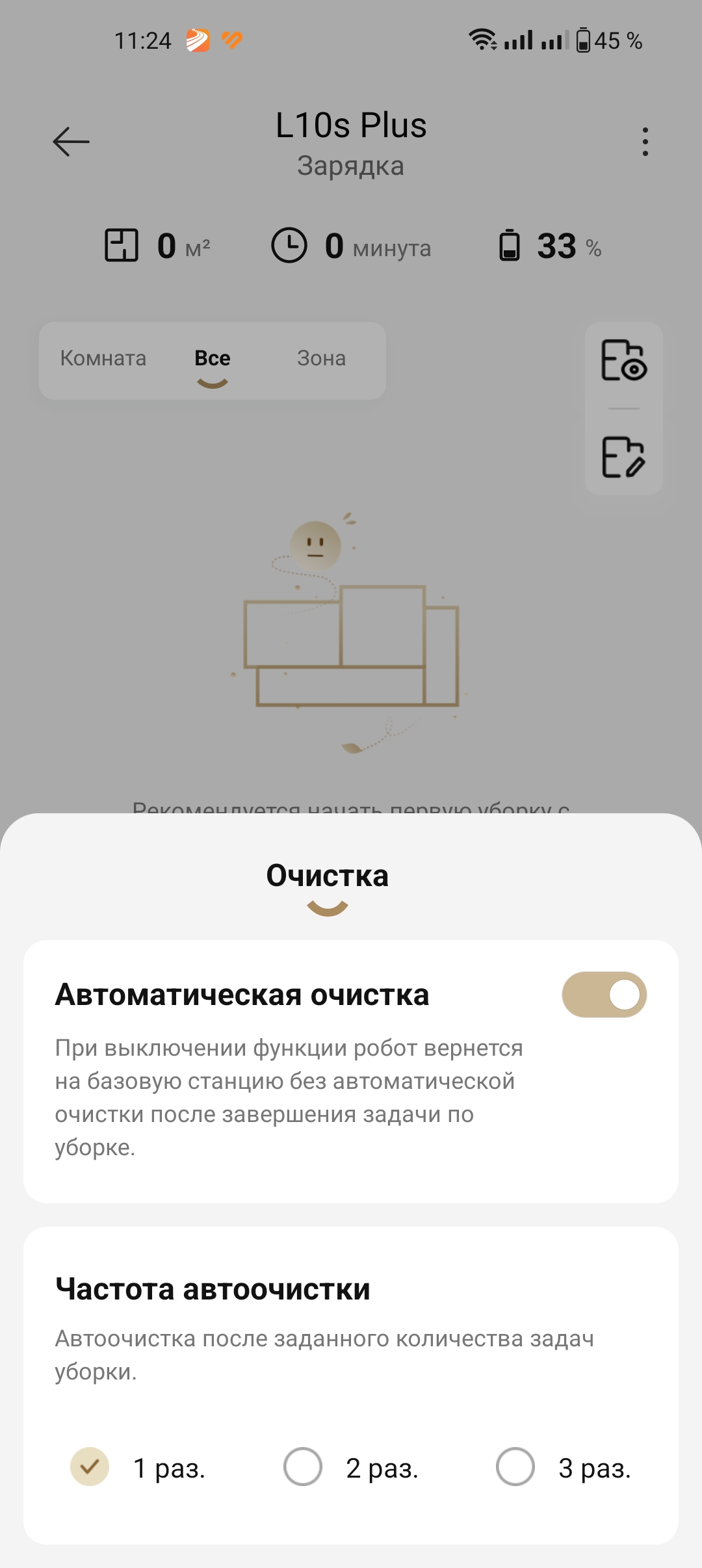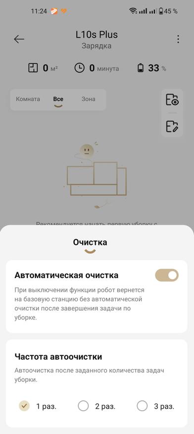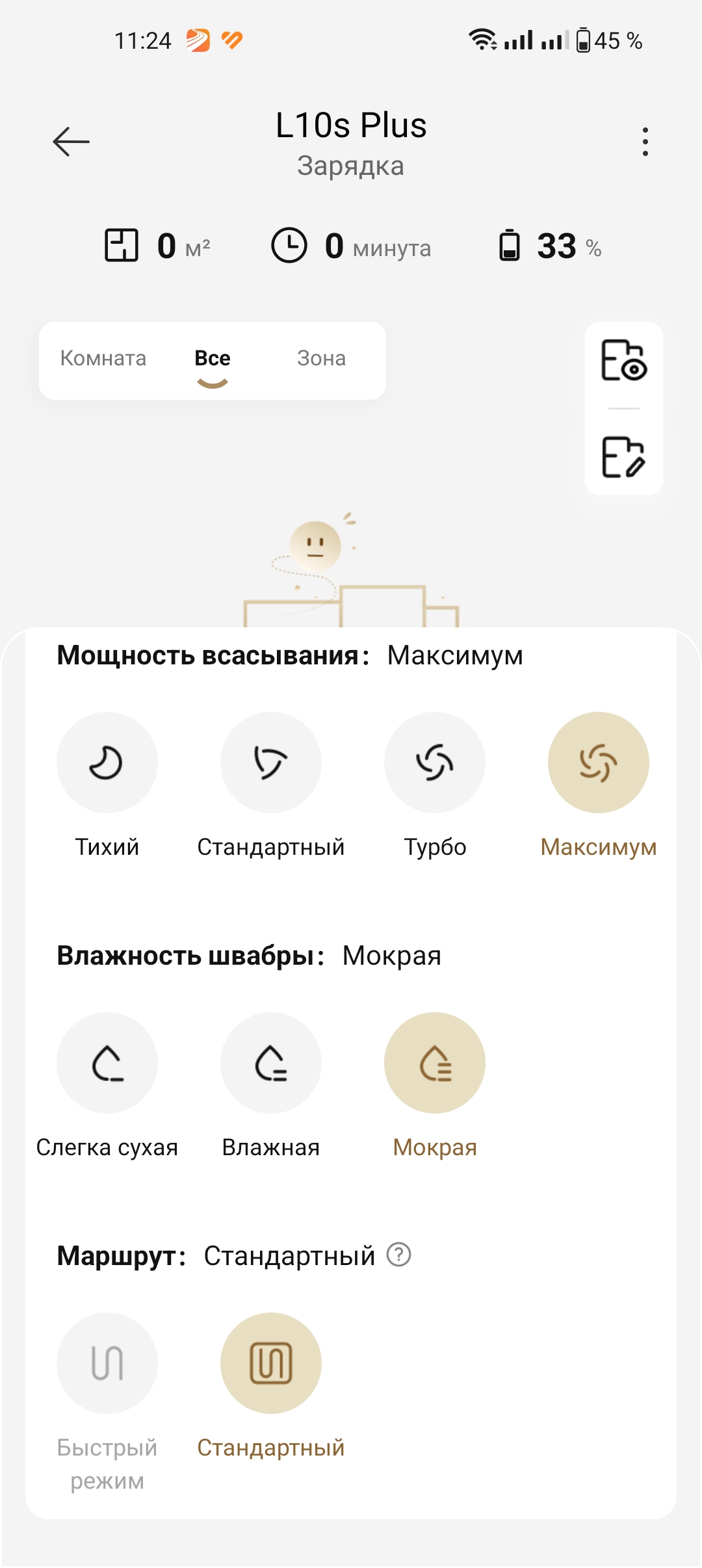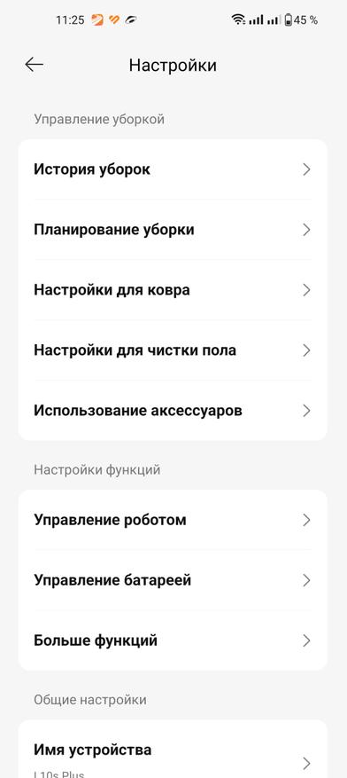 Настройки робота понятные, можно выбирать интенсивность всасывания и смачивания напольных покрытий. Можно задавать расписание уборок. Можно настроить поведение при обнаружении ковров. Также задаем частоту самоочисток.