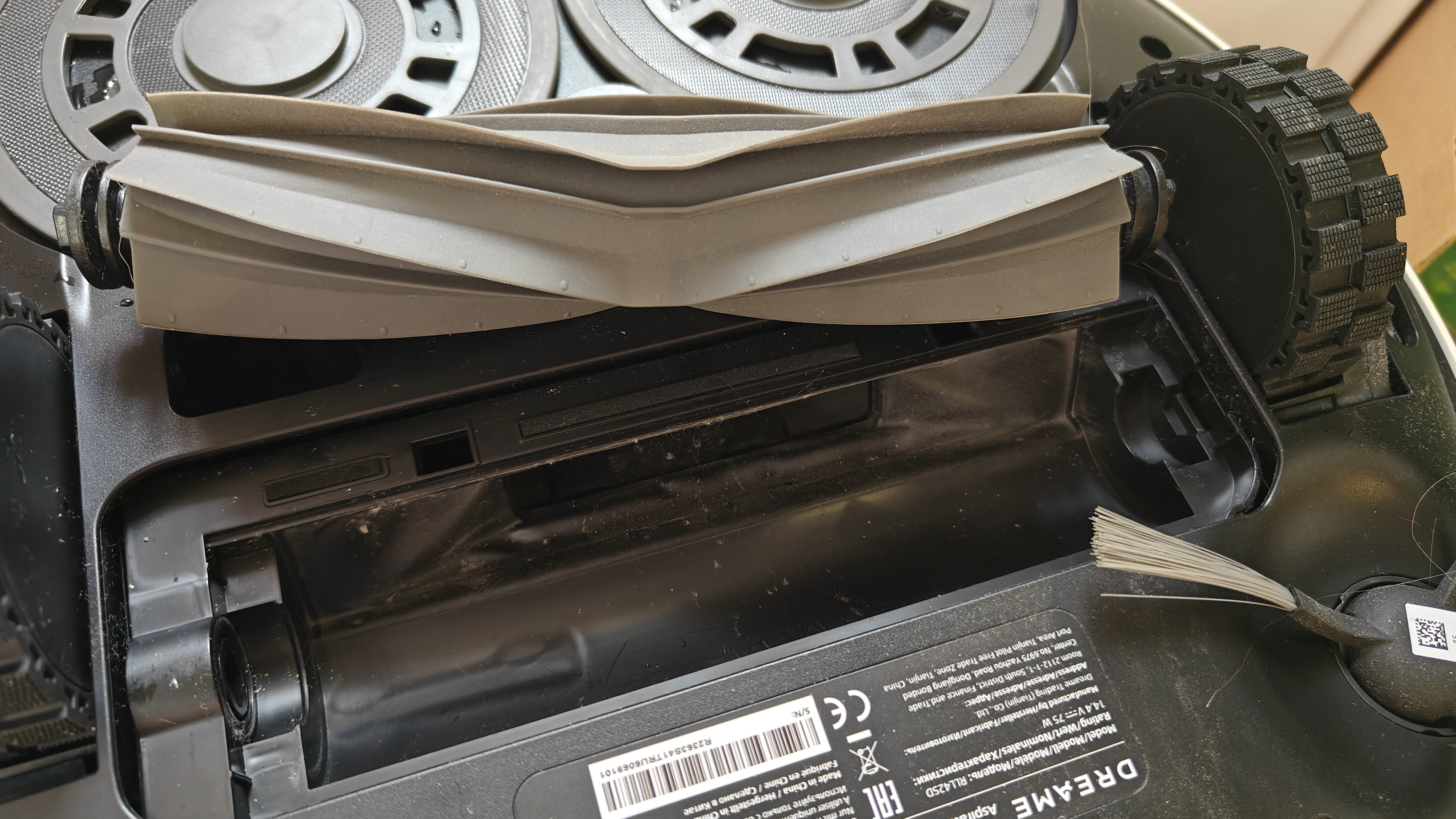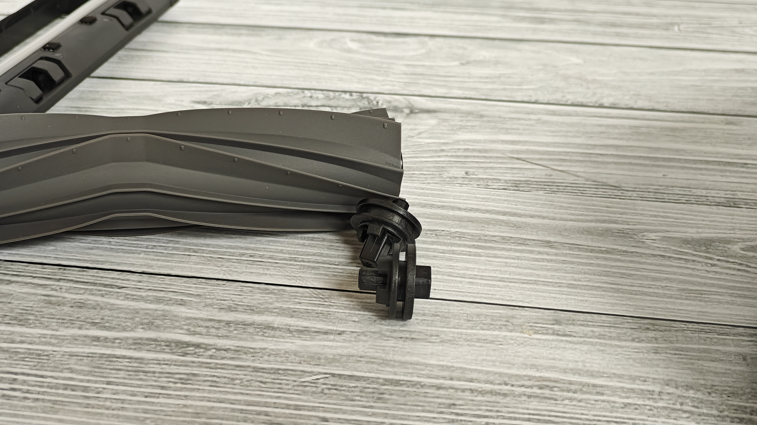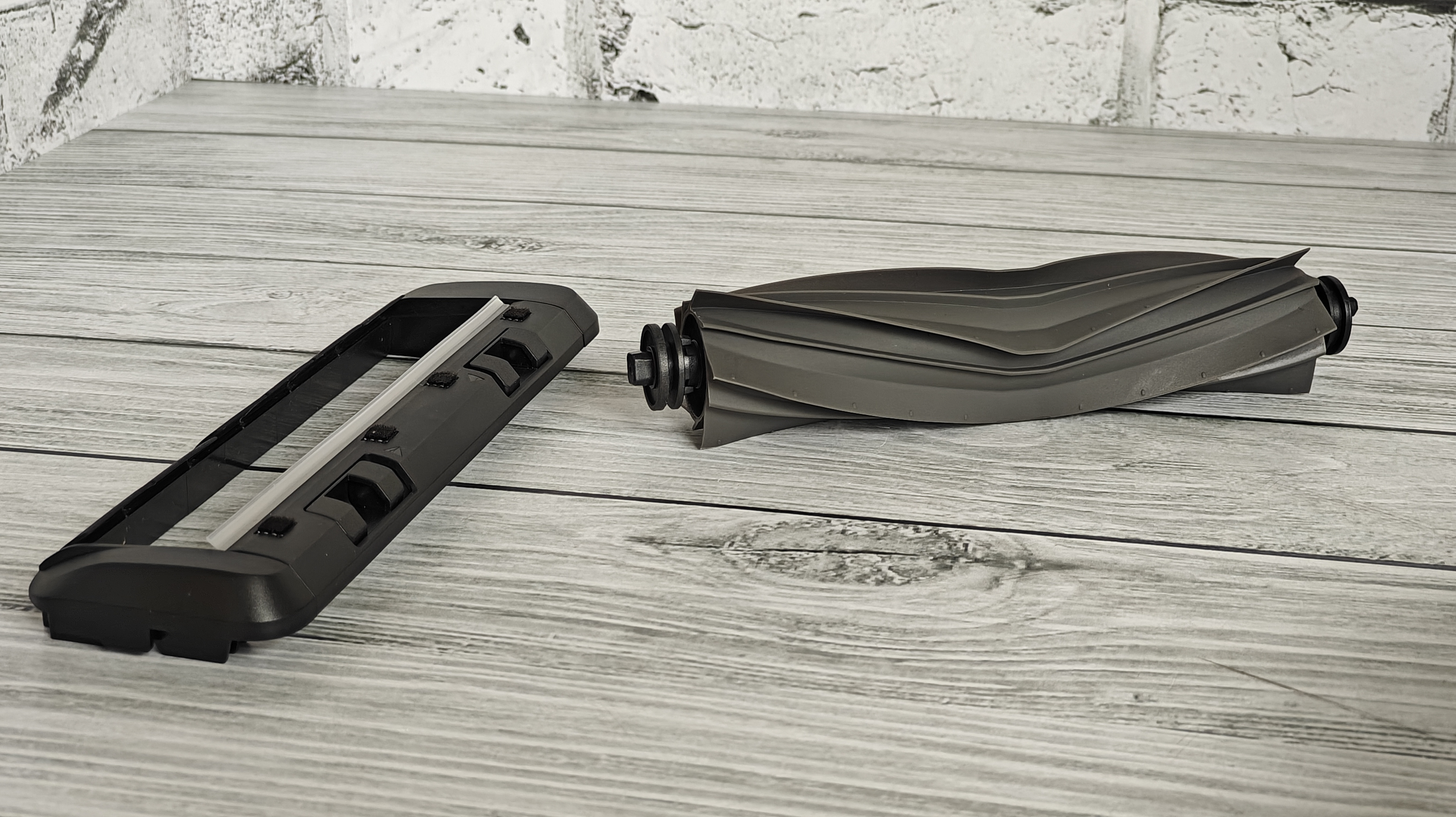 Открыв снизу лоток основной щетки, обнаружим, что щетка не обычная с ворсом, а вся покрыта силиконовыми лопастями, чтобы эффективнее убирать мусор. Особо отмечу возможность снять боковые фиксаторы и снять длинные волосы с вала щетки.