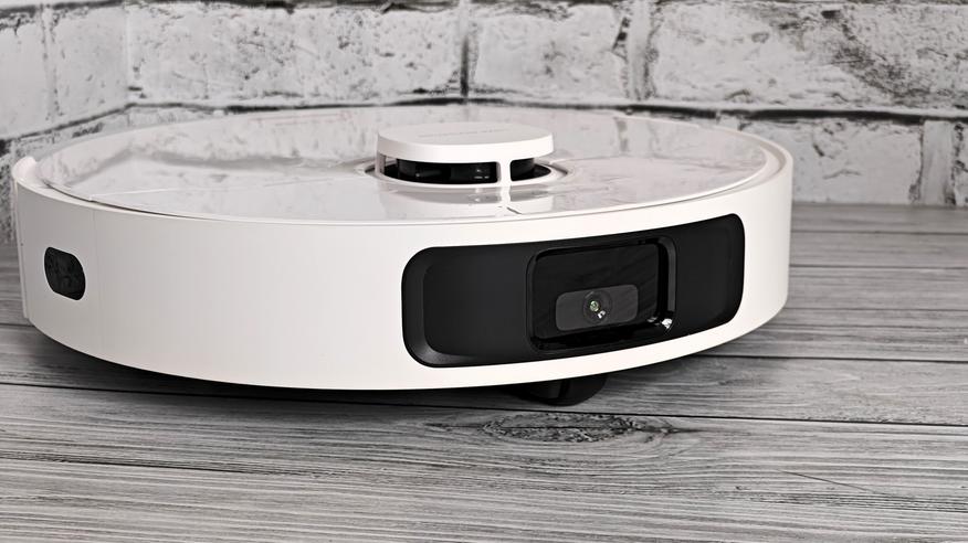 Сначала рассмотрим робот пылесос. Его корпус классический — круглый с одной боковой щеткой из белого глянцевого пластика. Сверху выделяется башня лазерного дальномер, а спереди явно видна камера. Она служит для ориентирования в пространстве и активного реагирования на изменение обстановки.