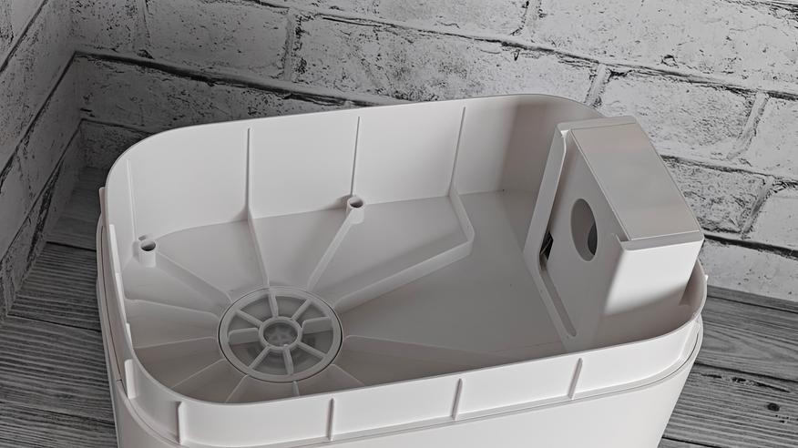 База для самоочистки тоже из белого пластика логотипом компании на лицевой стороне.