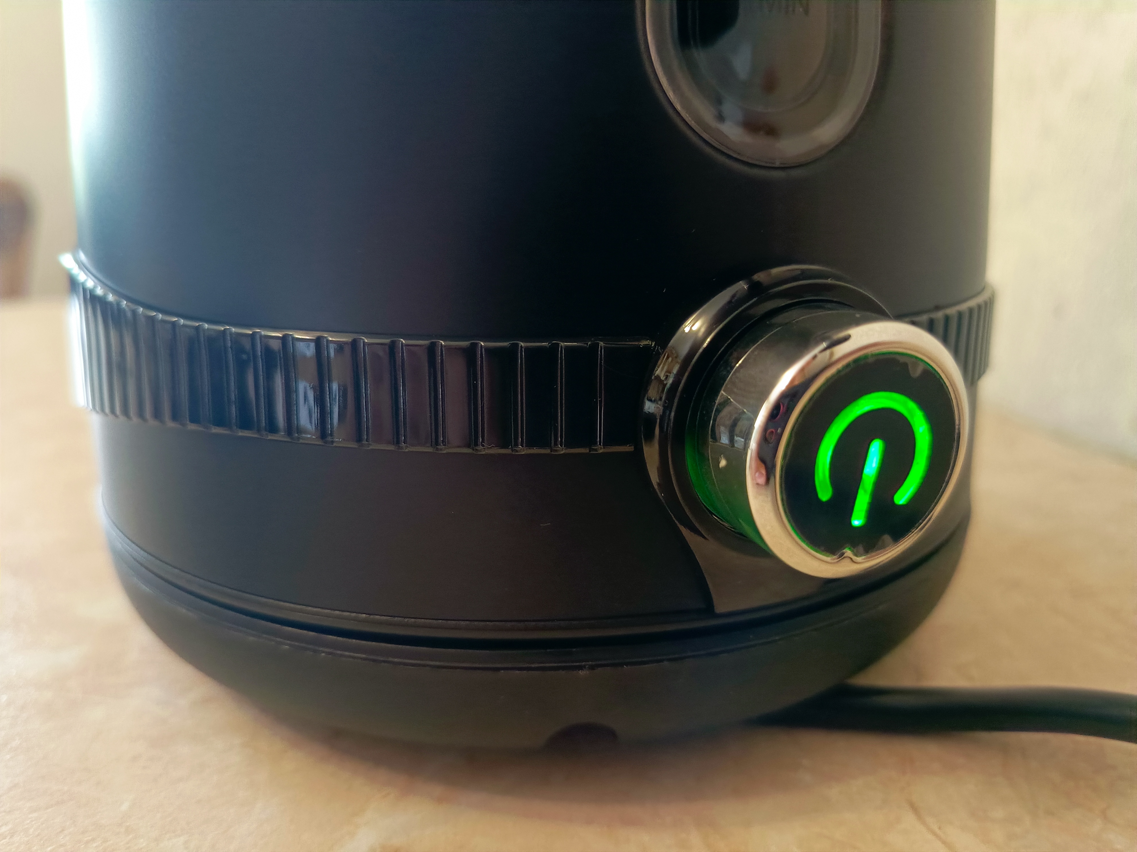 Начну с того, что кнопка включения находится на регуляторе температуры. Когда чайник выключен, индикатор светится зелёным цветом, указывая на то, что устройство находится в режиме ожидания и потребляет всего 0,3 Вт. Если же чайник включён, индикатор горит красным цветом, и потребление электроэнергии составляет 1831 Вт. Кнопка включения установлена сенсорного типа. Она весьма большая и реагирует на нажатие хорошо. Подсветка светится зеленым не все время. Через пару минут бездействия она выключается, в том числе и дисплей.