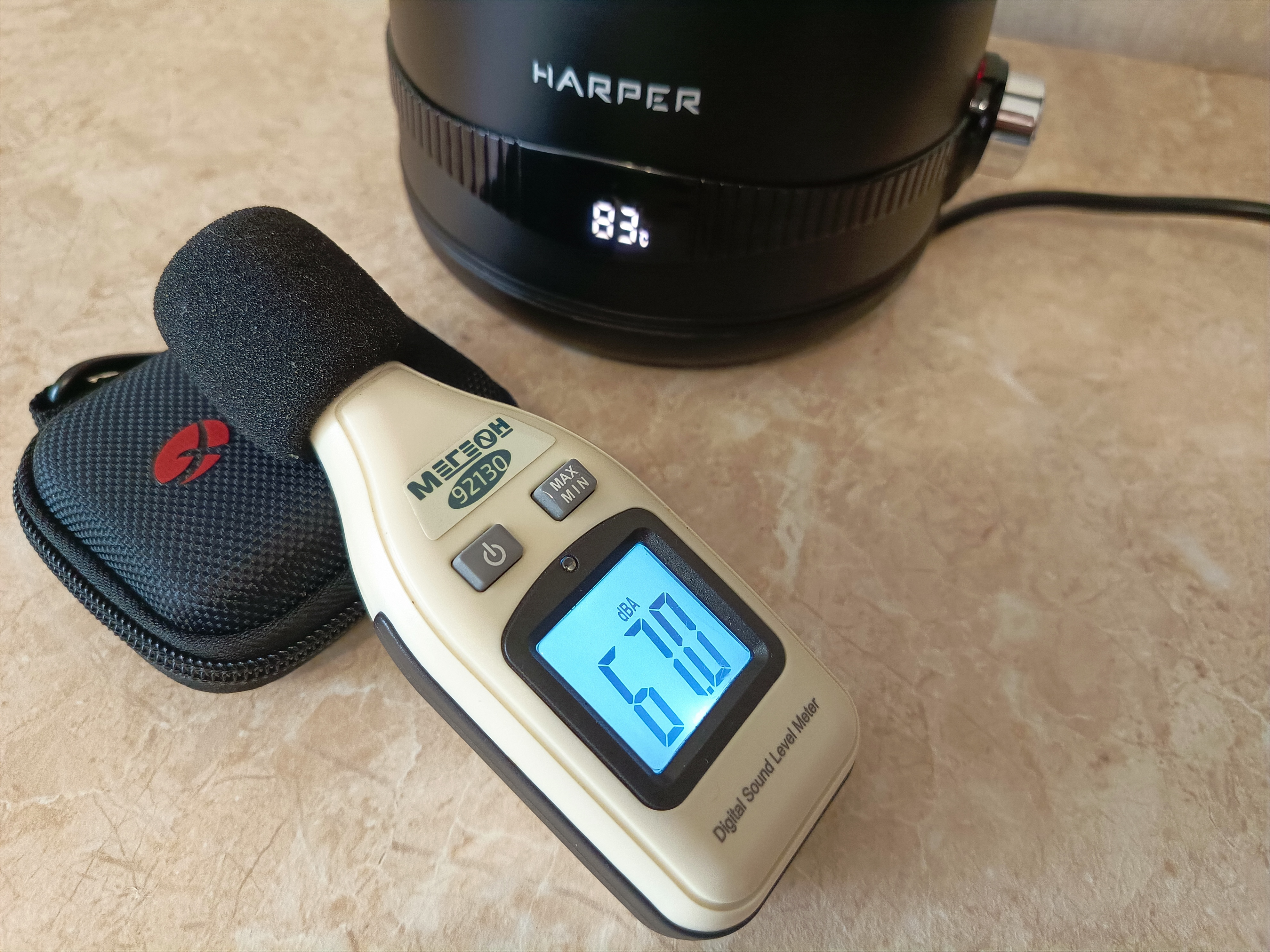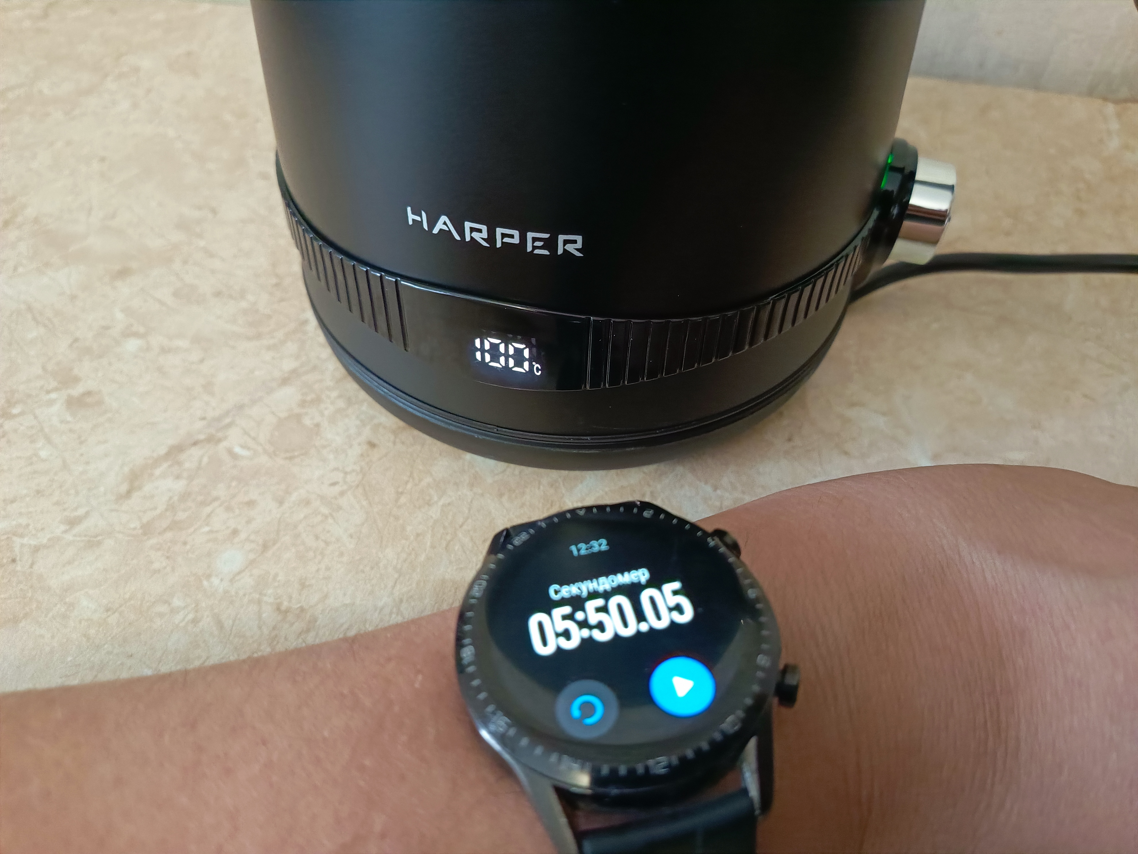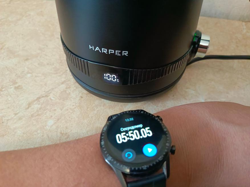 Чайник рассчитан на максимальный объём воды в 1,7 литра. При заливке воды из-под крана с температурой 19°C, она закипела через 5 минут 50 секунд. Высотомер на смарт-часах показывает, что я нахожусь на высоте 593 метра над уровнем моря, а атмосферное давление составляет 714 мм ртутного столба. Я полагаю, что 6 минут — это довольно быстрый результат для нагрева такого количества воды при мощности 1830 Вт. Кстати, во время теста напряжение в электросети было 213 Вт.