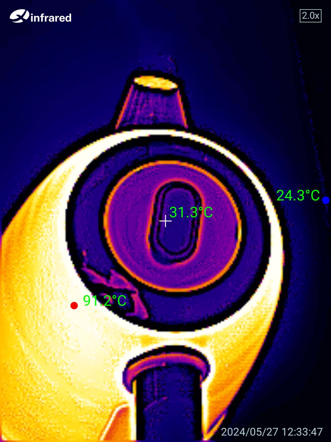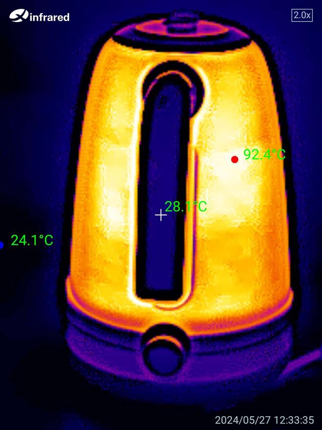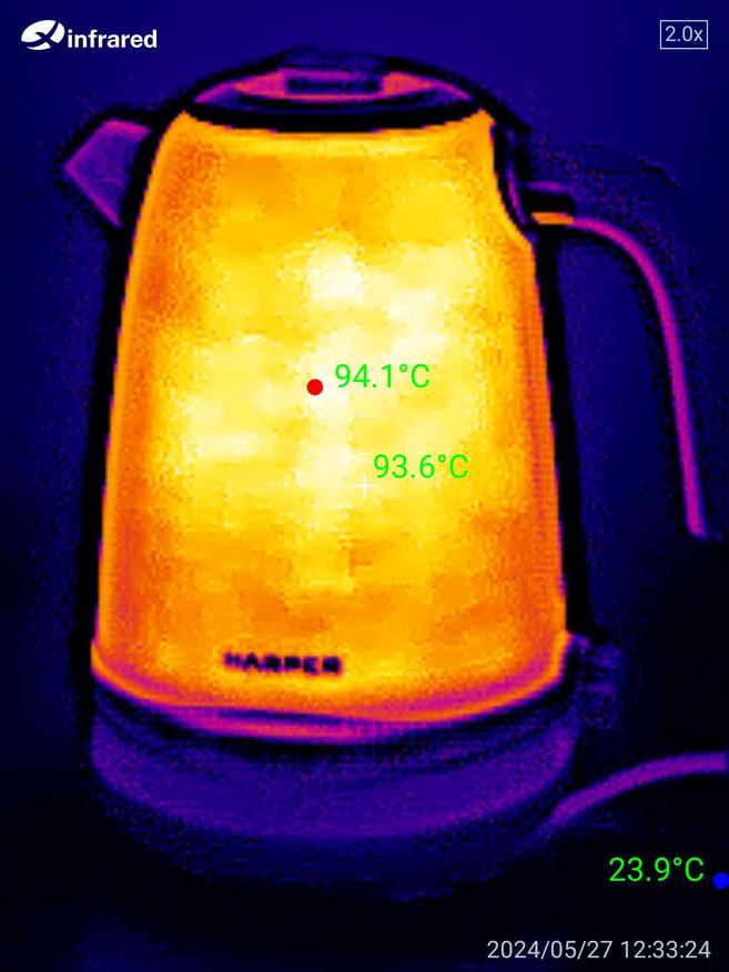 На фотографиях, сделанных с помощью тепловизора, видно, что верхняя крышка и рукоятка чайника остаются холодными. Однако стенки чайника нагреваются до высокой температуры, поэтому следует быть осторожными.