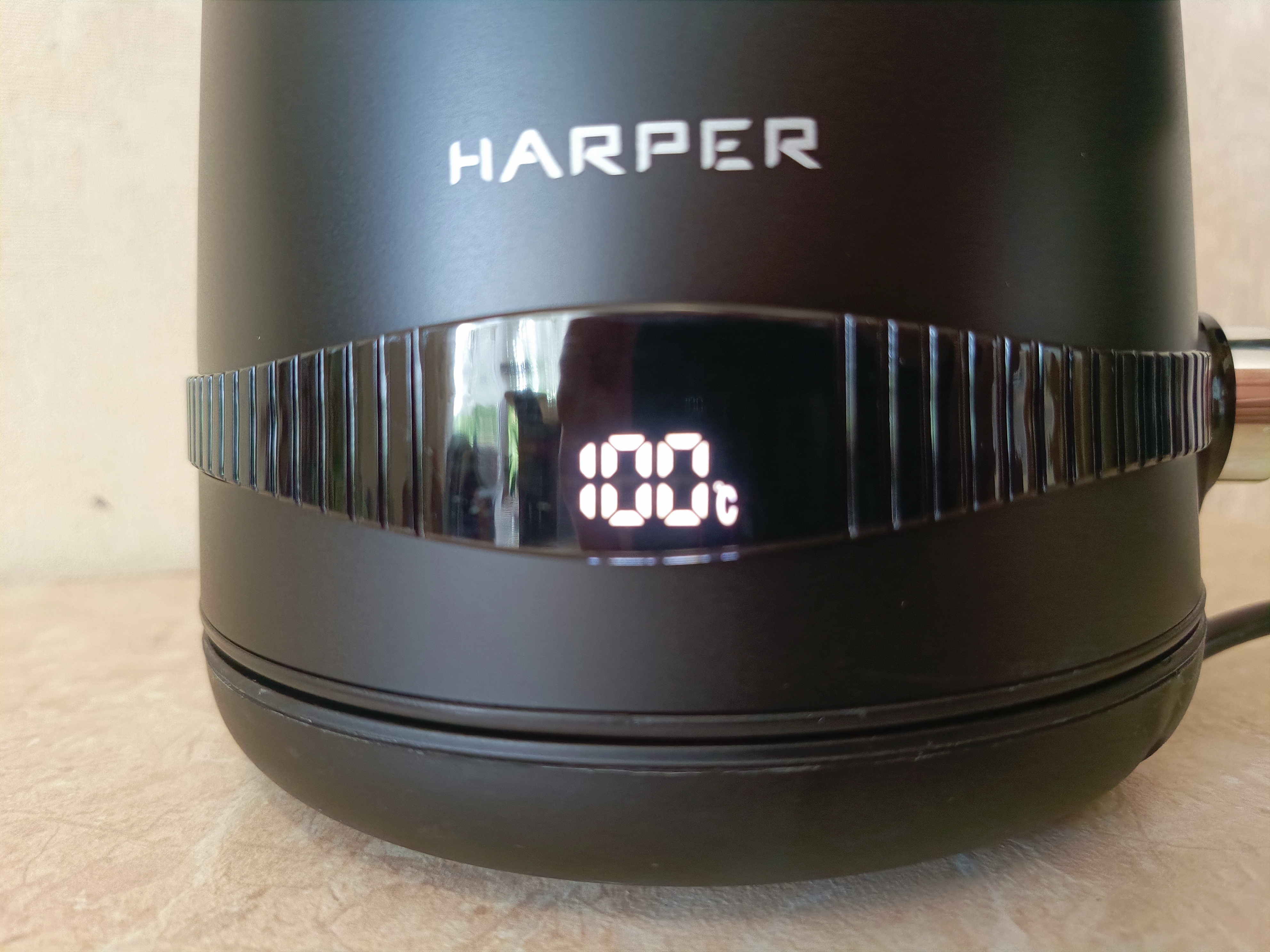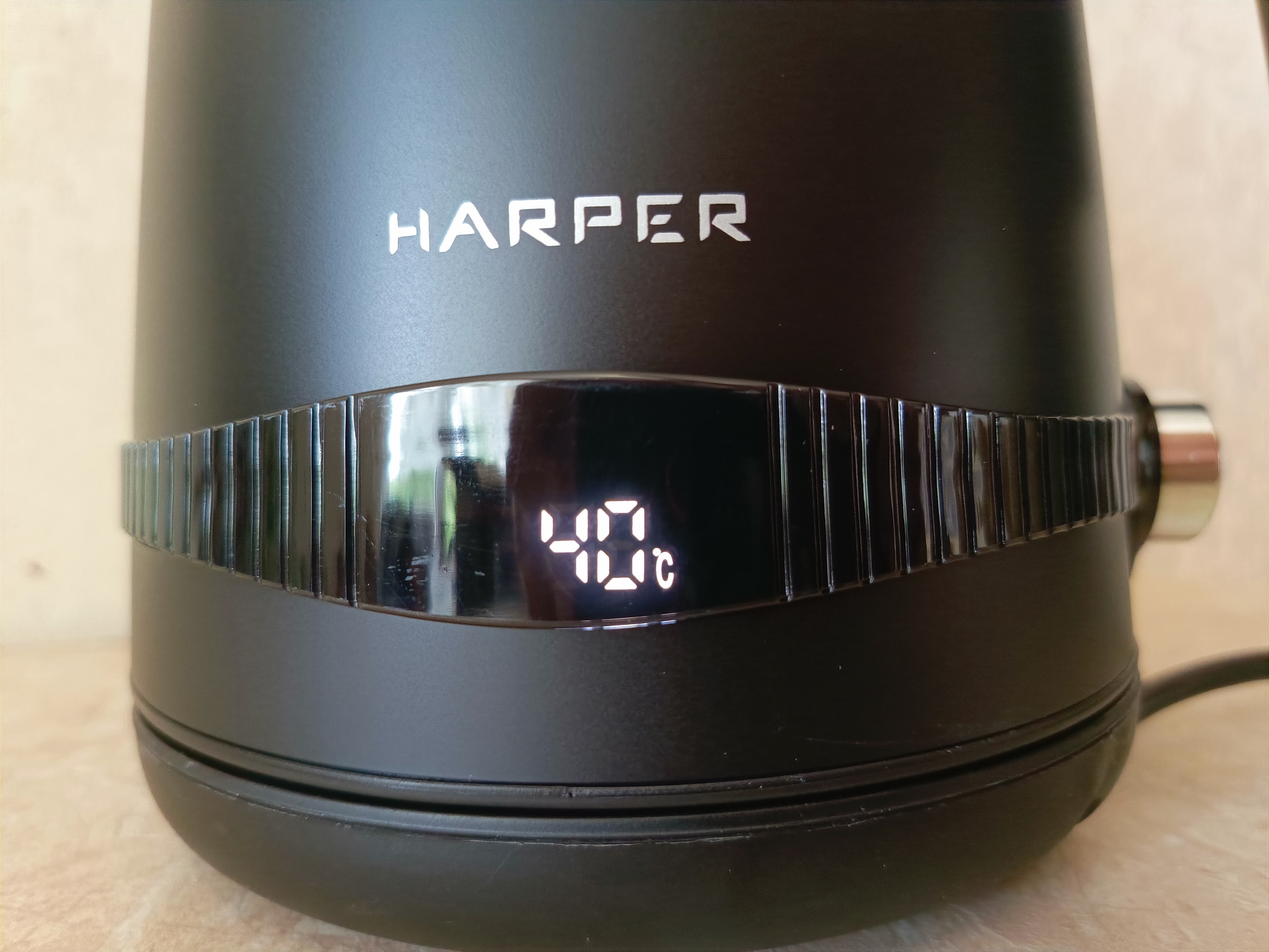 У этого чайника сбоку есть небольшой дисплей, на котором отображается текущая температура воды. Особенность этой модели заключается в том, что здесь есть возможность выбора температуры нагрева воды. Вы можете установить температуру от 40°C до 100°C с шагом в 10°C. Это очень удобно, потому что не всегда нужен кипяток. Такая функция будет особенно полезна для любителей чая или кофе, которые предпочитают заваривать напиток при определённой температуре. Дисплей яркий и весьма крупные цифры.