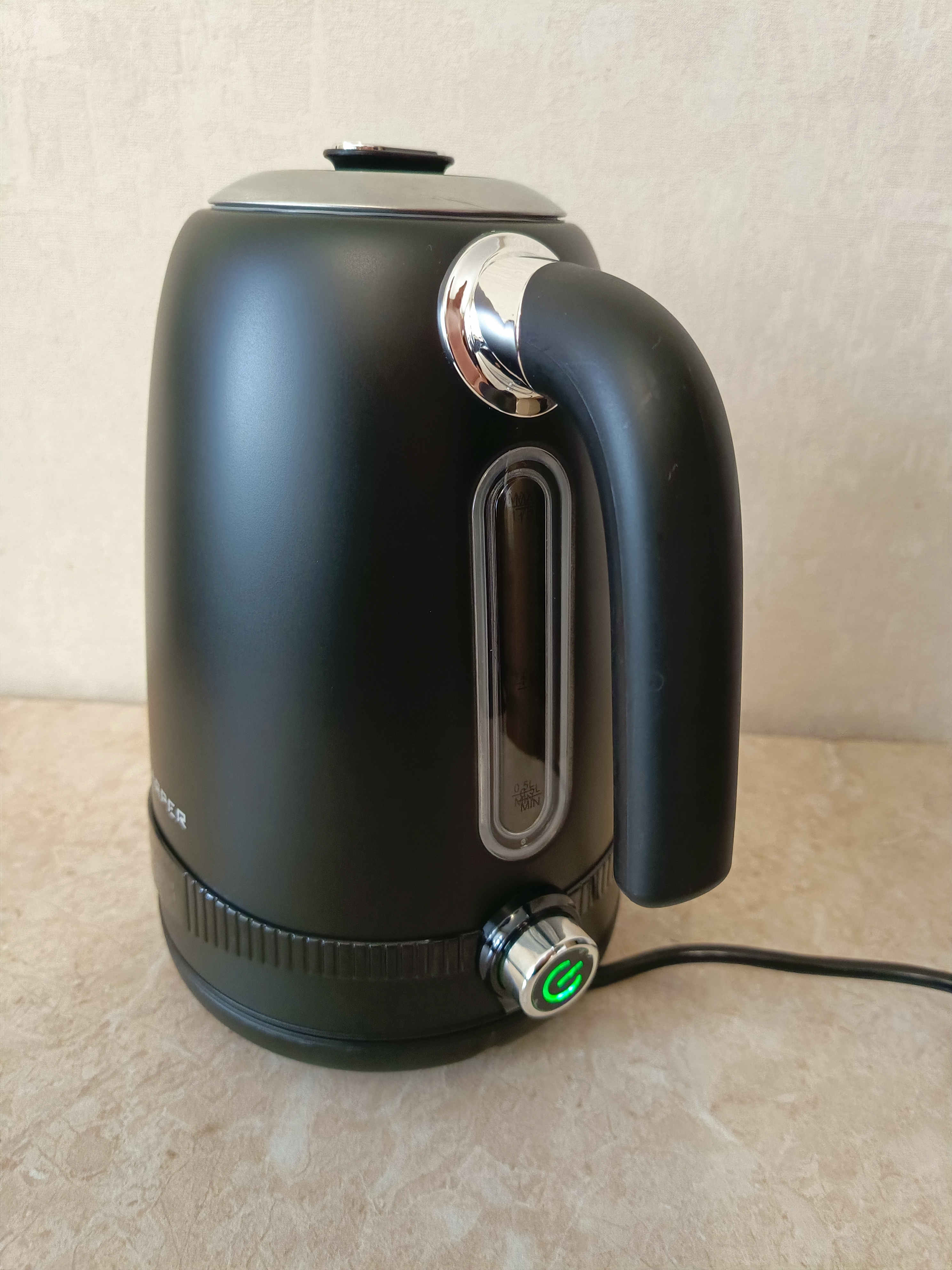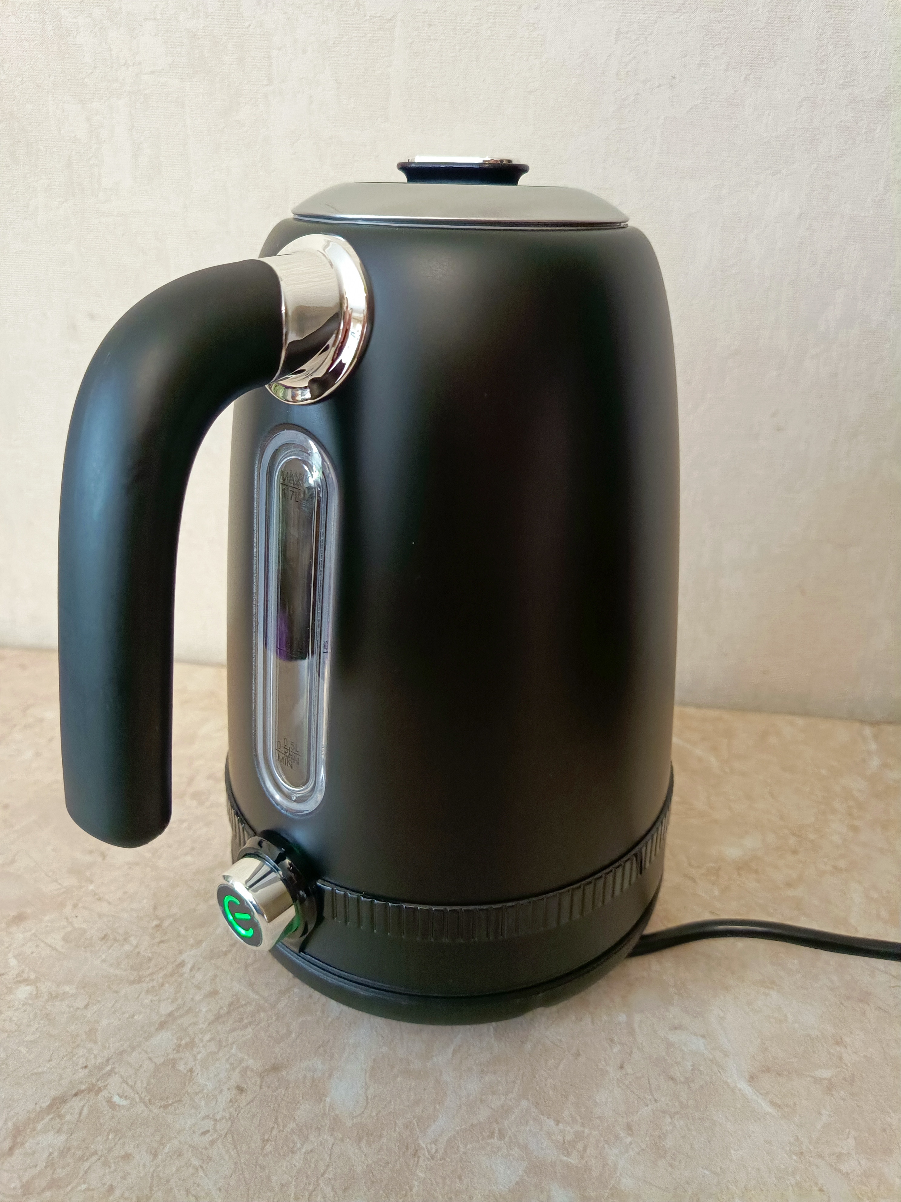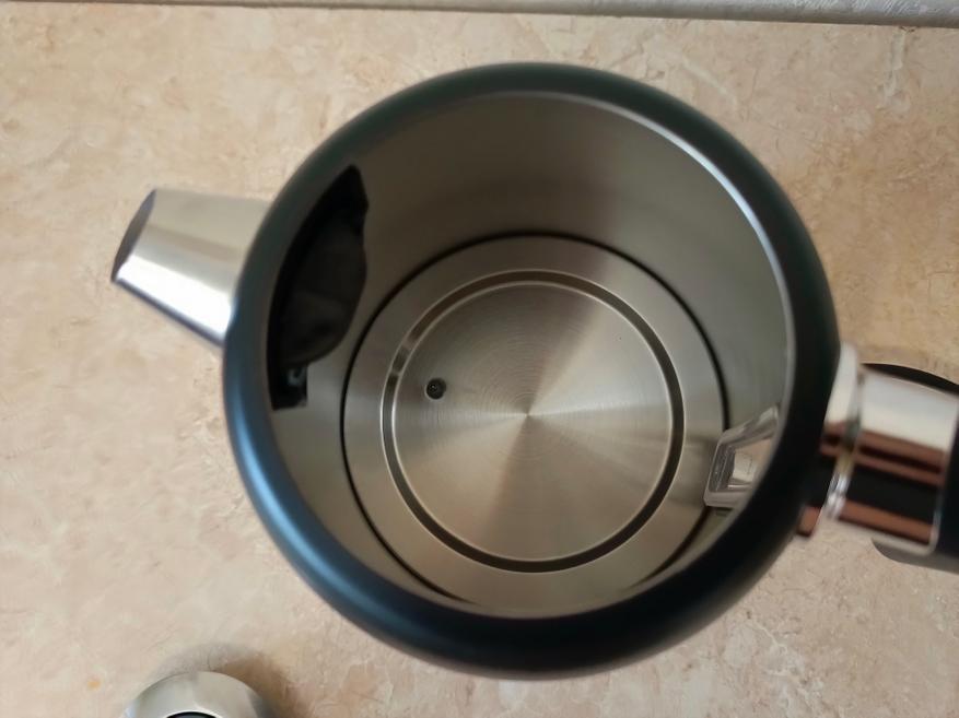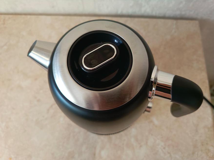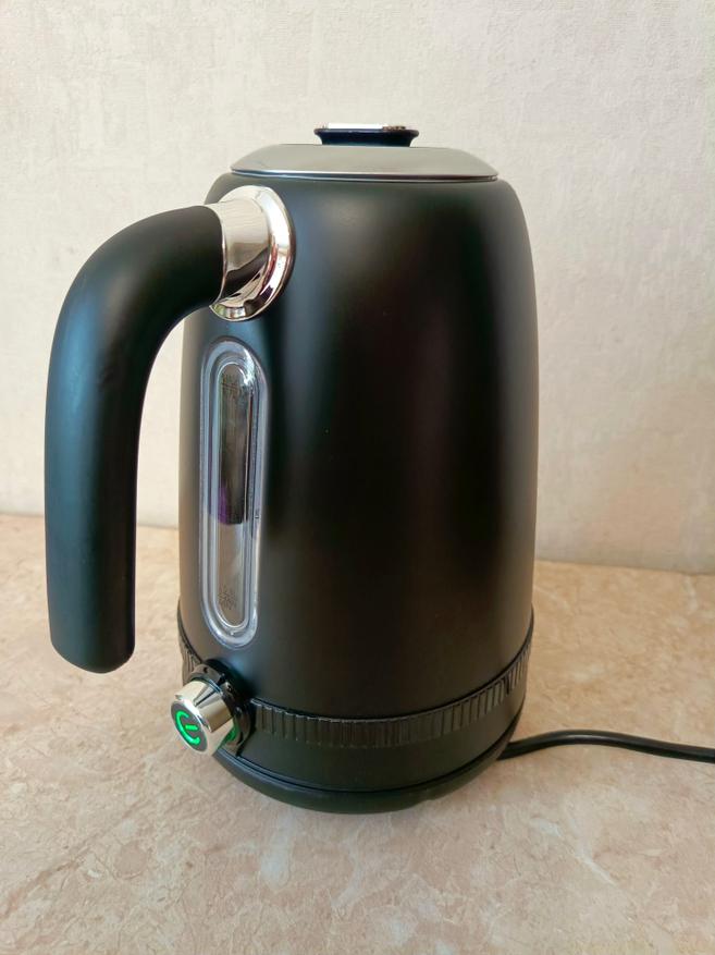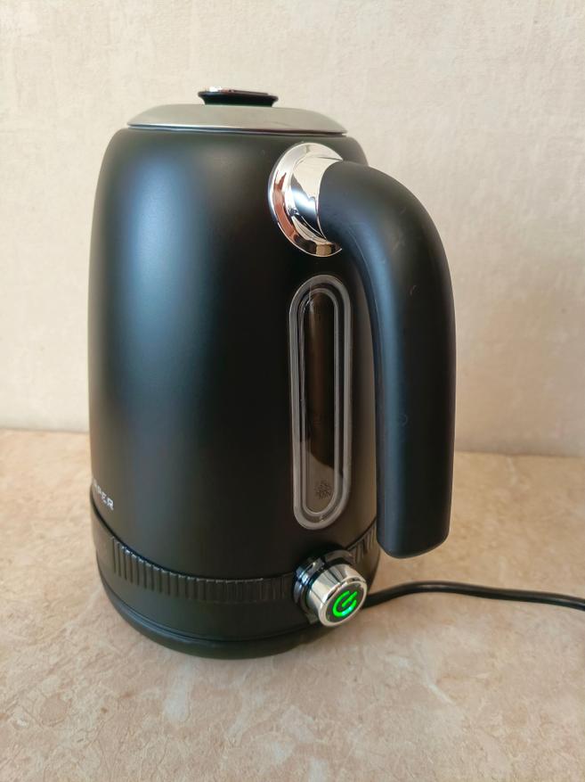 Чайник выполнен из нержавеющей стали выкрашенной в чёрный цвет. На его боку есть окошко, через которое можно увидеть уровень воды. К сожалению, в чайнике нет подсветки, поэтому при плохом освещении уровень воды может быть не очень хорошо виден.