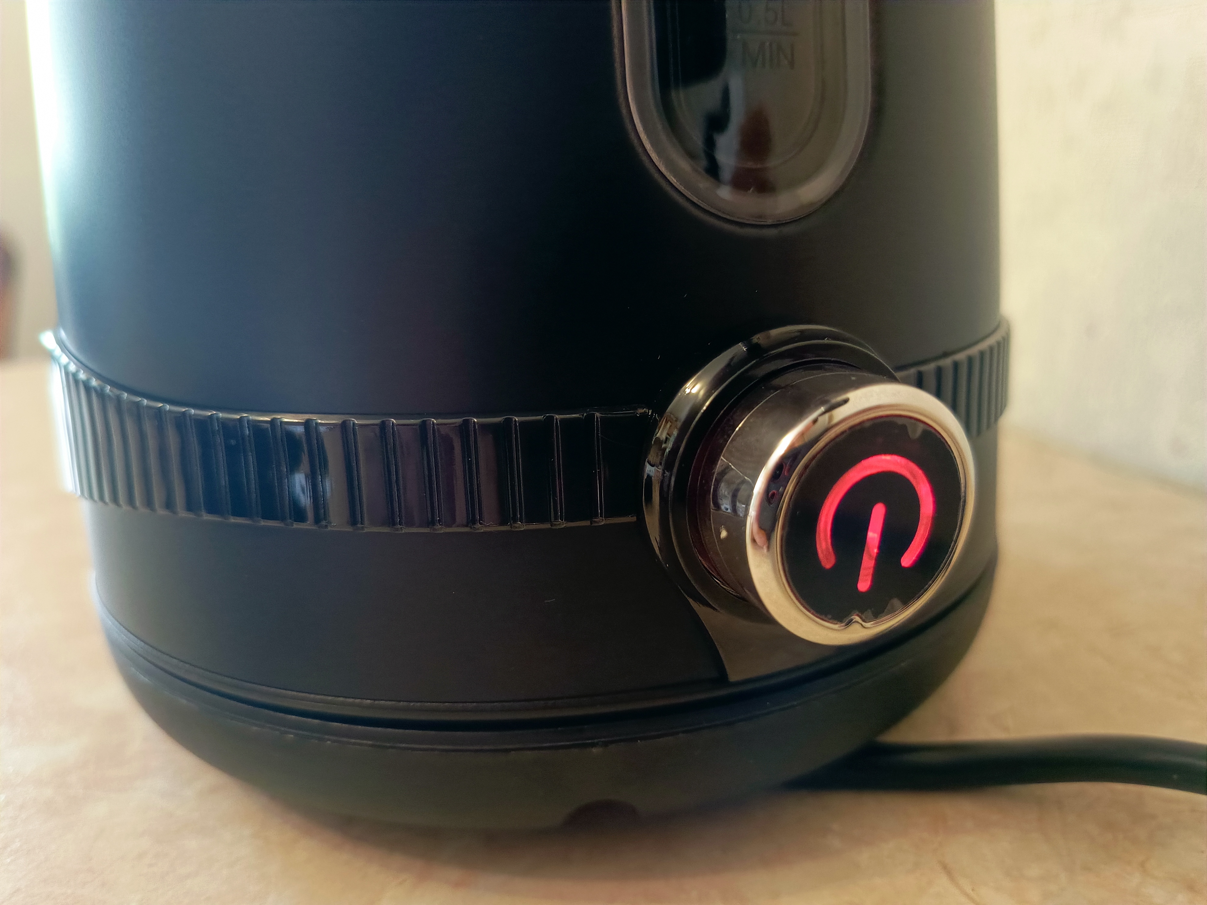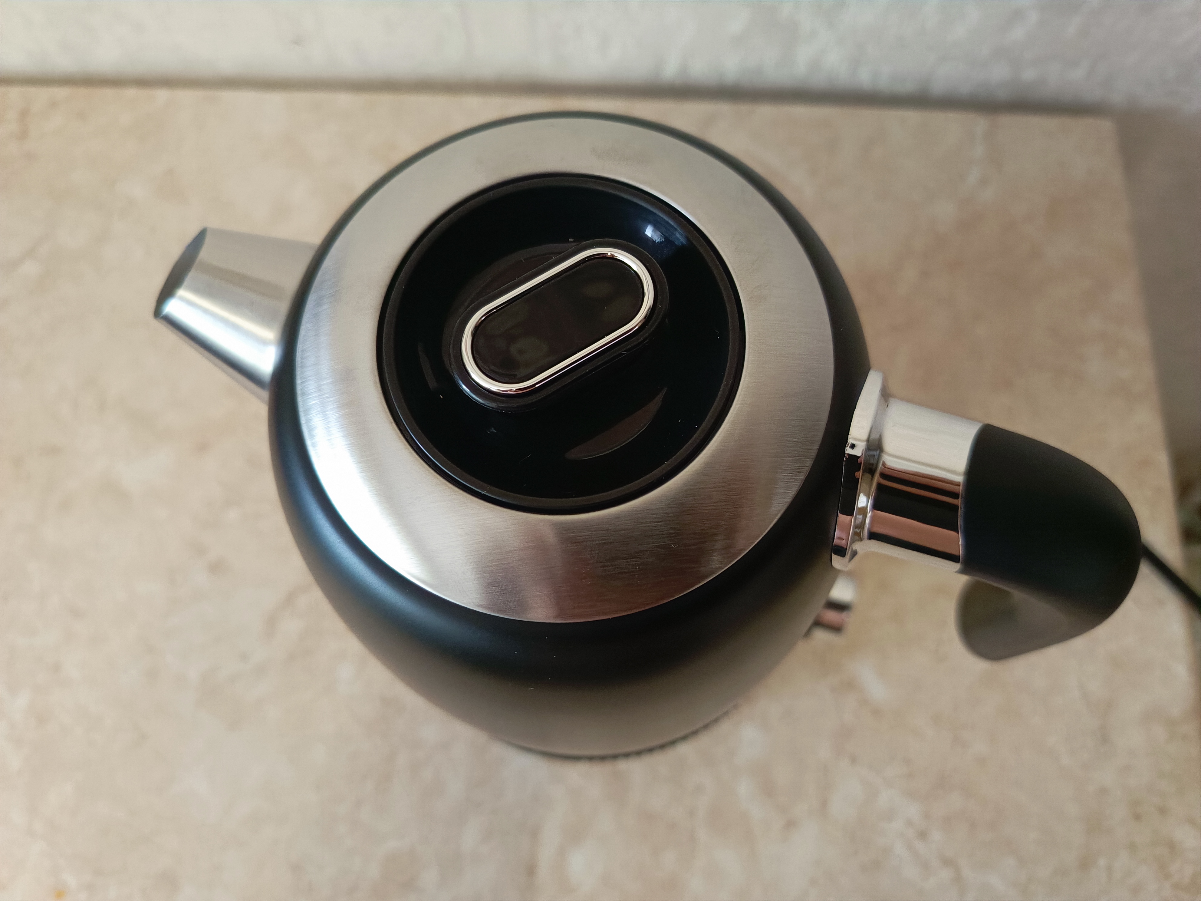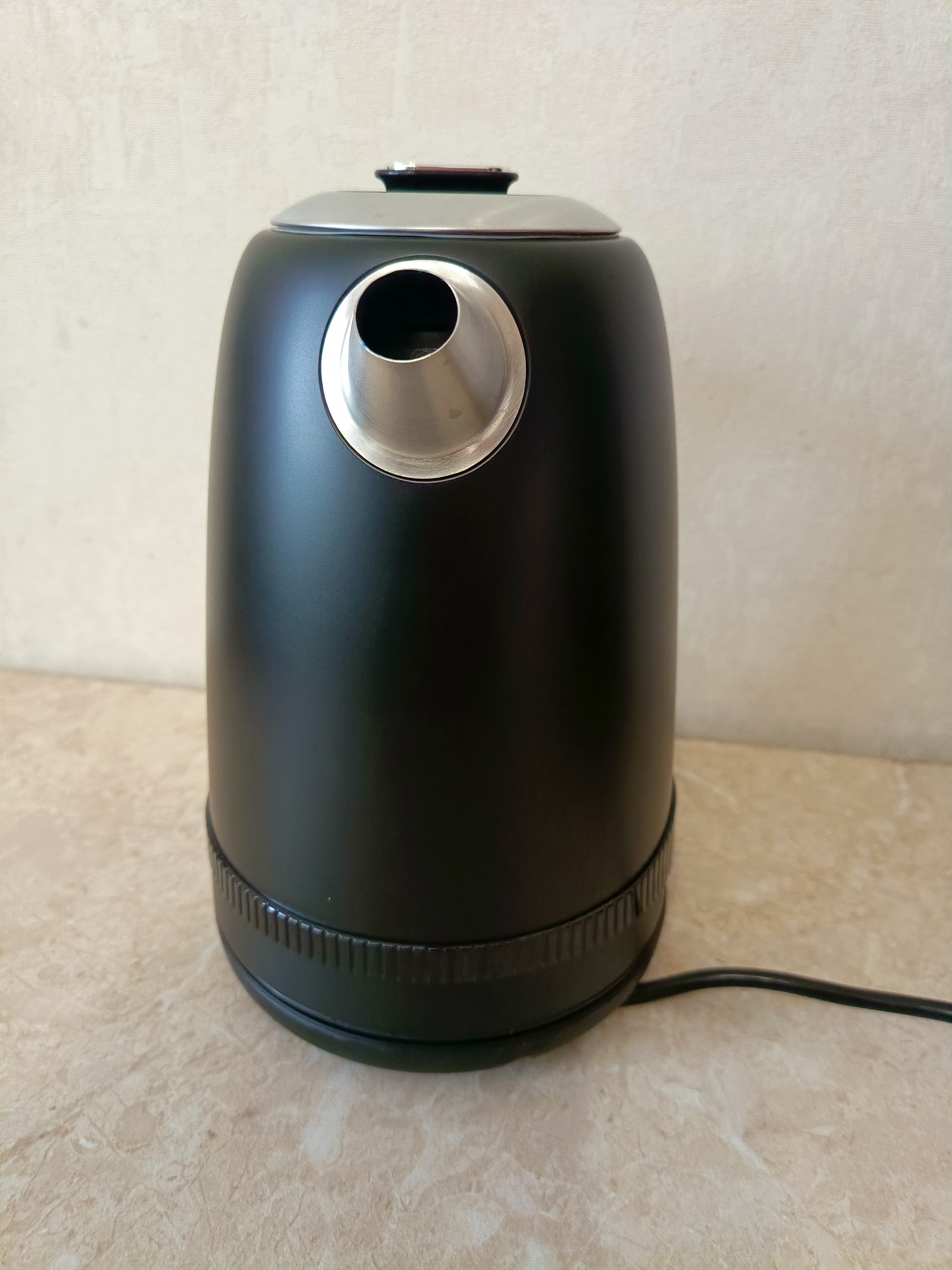 Чайник выполнен из нержавеющей стали выкрашенной в чёрный цвет. На его боку есть окошко, через которое можно увидеть уровень воды. К сожалению, в чайнике нет подсветки, поэтому при плохом освещении уровень воды может быть не очень хорошо виден.
