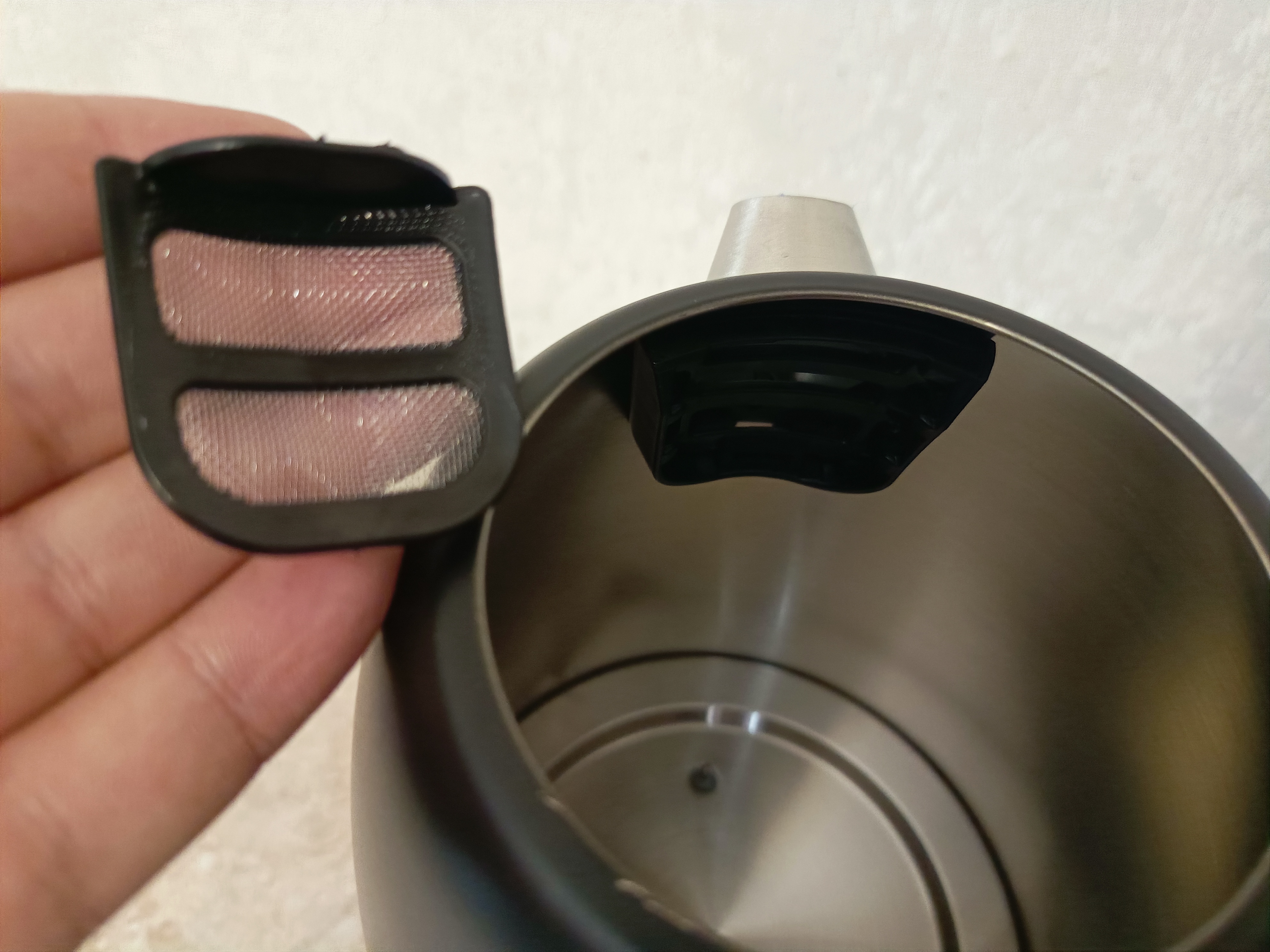 Крышка чайника снимается полностью. Она имеет конструкцию, напоминающую сэндвич, что позволяет обеспечить хорошую теплоизоляцию. Поэтому, если у вас только что закипел чайник, вы можете спокойно открыть его и долить воды. Внутри чайника есть сетчатый фильтр, который легко снимается. В комплекте не предусмотрен запасной фильтр.