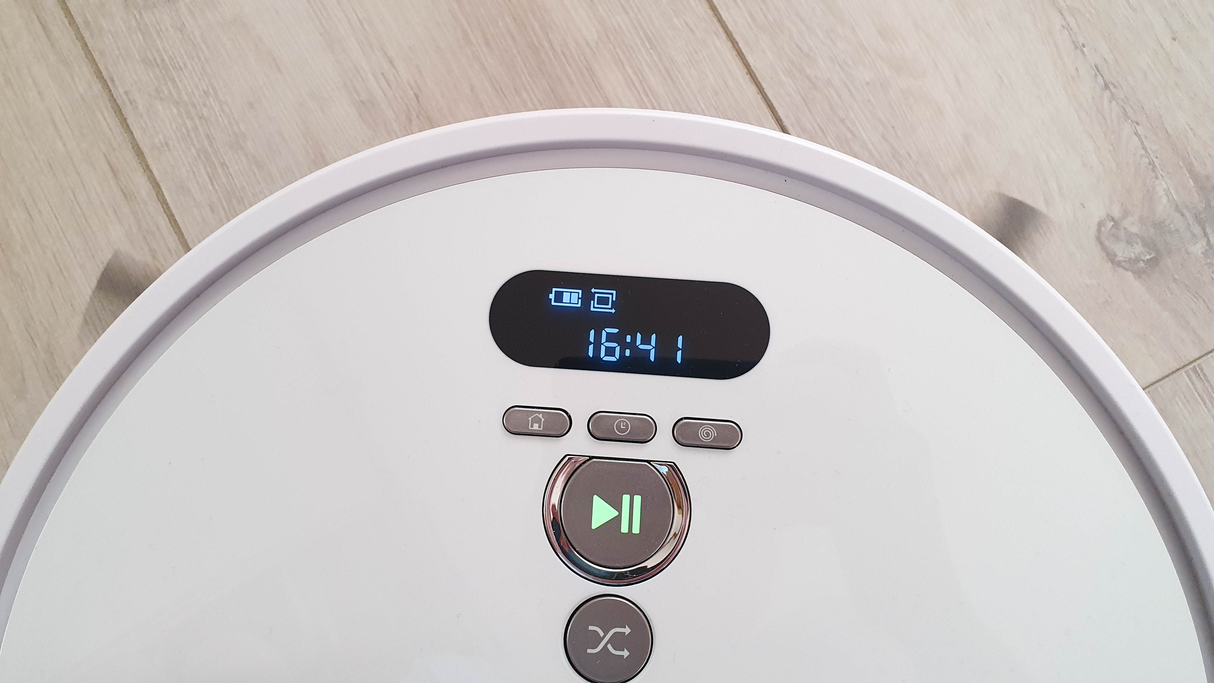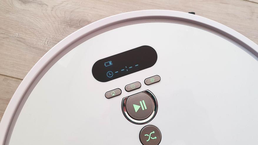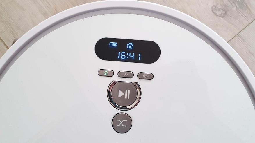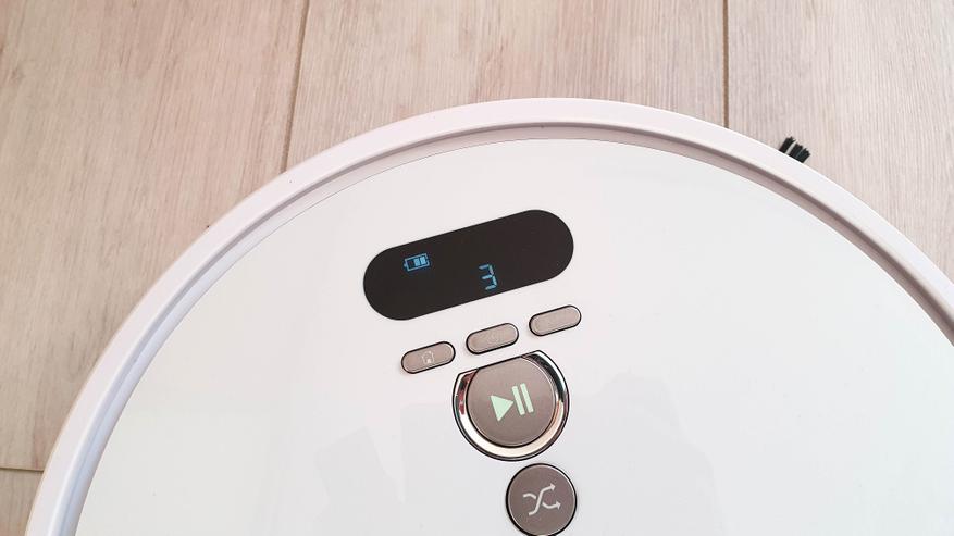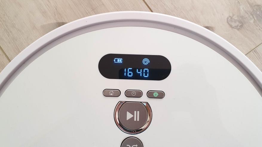 На экране отображается текущее время, оставшийся заряд батареи и текущий режим (если выполняется какая-то задача). Если робот-пылесос стоит без действия более 3 минут, например на зарядке, то он переходит в режим сна, а экран гаснет. Выйти из режима сна можно нажав кнопку пуск на корпусе или пульте.