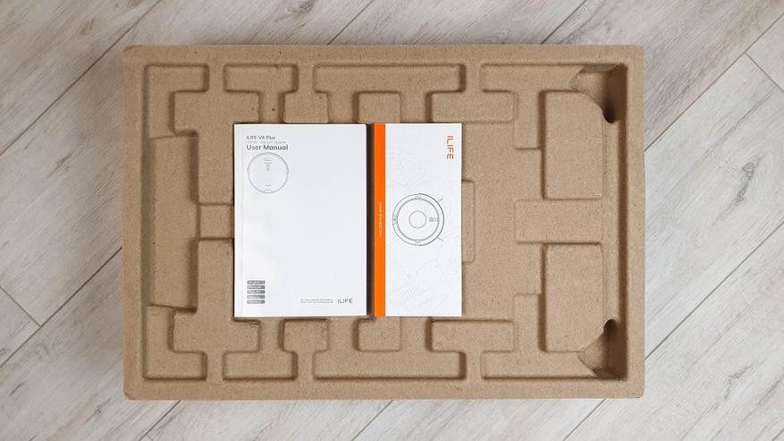 Далее мы видим формованный лоток из плотного картона в котором расположен робот-пылесос и аксессуары. Все в индивидуальных нишах и плотно закреплено так, что не болтается и трется друг о друга.