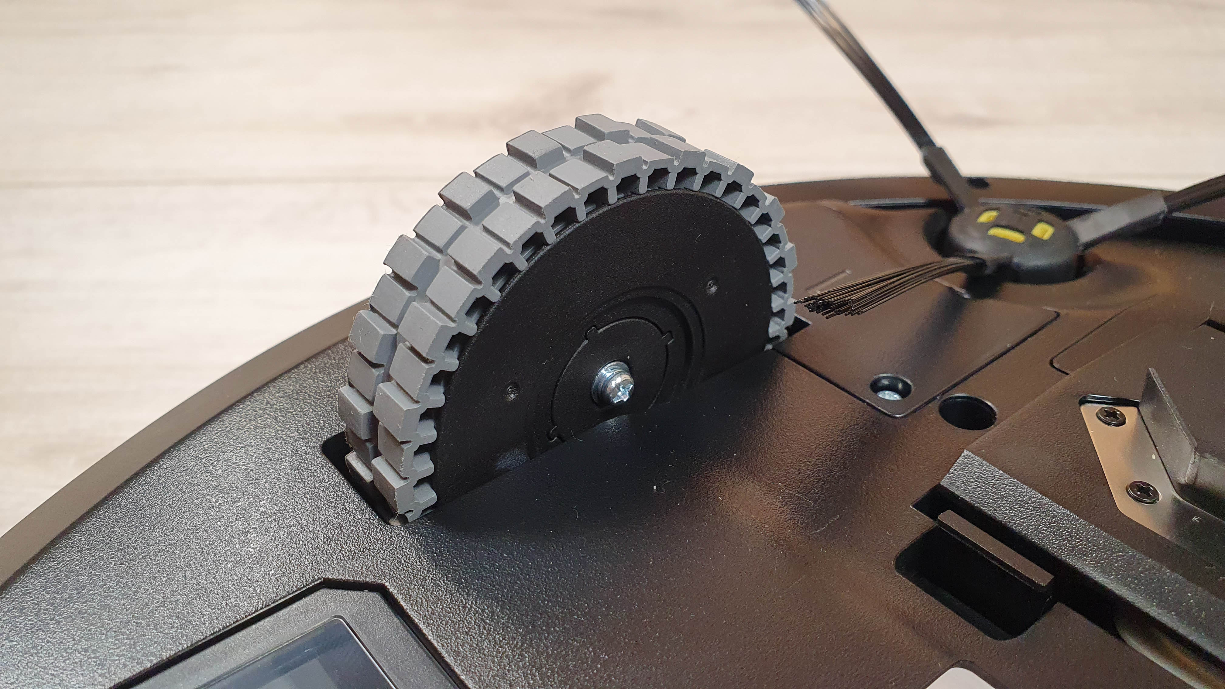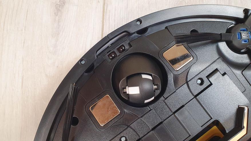 С нижней стороны все расположено привычным образом: 2 крупных ведущих колеса по бокам и небольшое поворотное колесико спереди, 2 боковых вращающихся щетки и всасывающее отверстие по центру. Есть небольшая резиновая юбка, которая расположена на подпружиненной крышке, она обеспечивает более плотный контакт с поверхностью и соответственно увеличивает тягу.