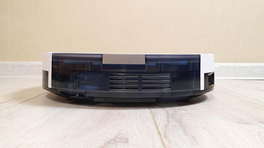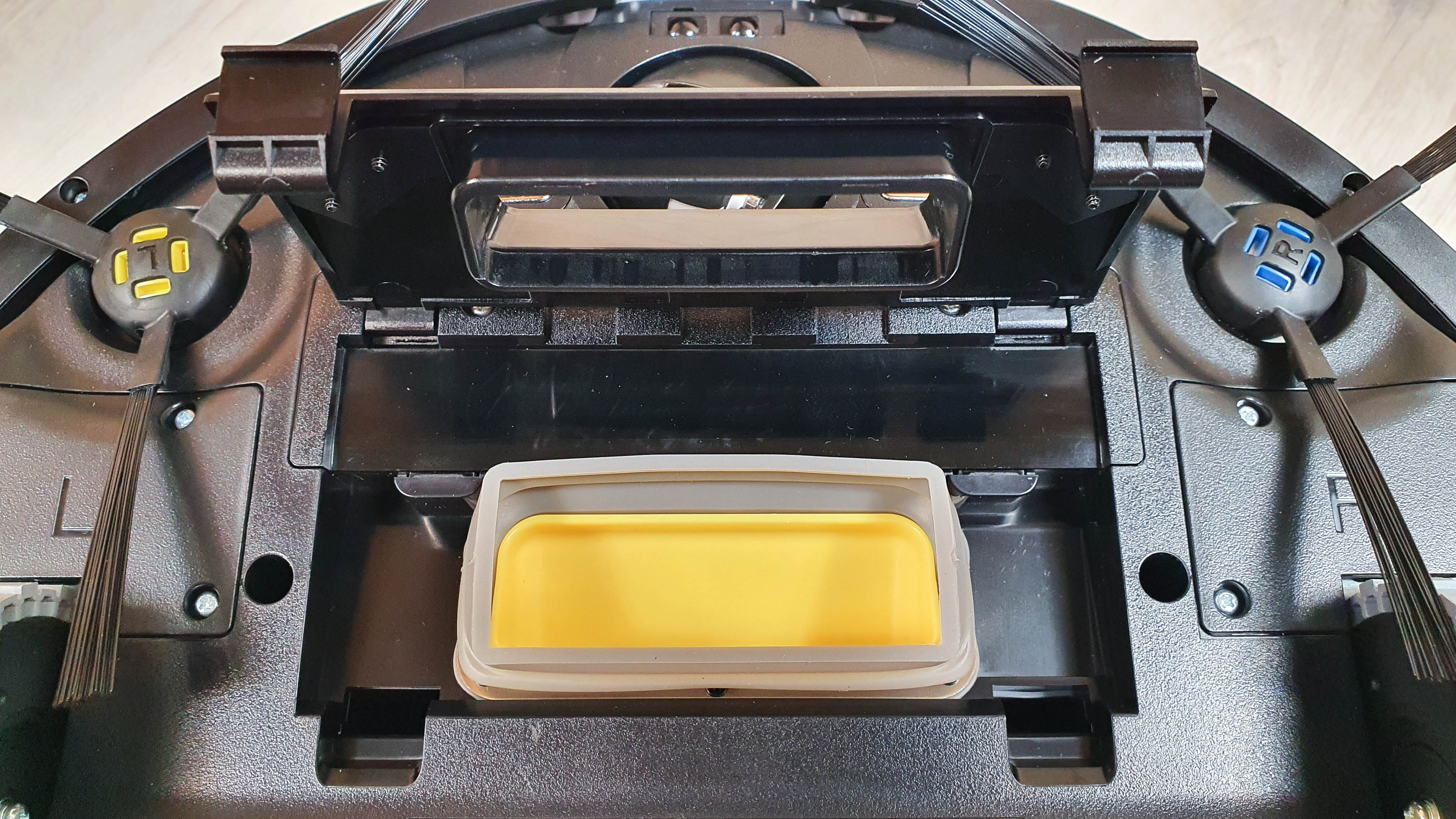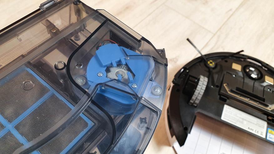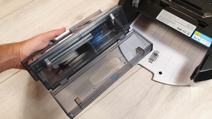 Ну а задняя часть является съемной насадкой, в которой расположена емкость для мусора и электромотор Nidec. Да, в конструкции такого типа, в самом роботе расположены лишь двигатели щеток и колес, а электромотор, который используется для втягивания воздуха, расположен прямо в контейнере.