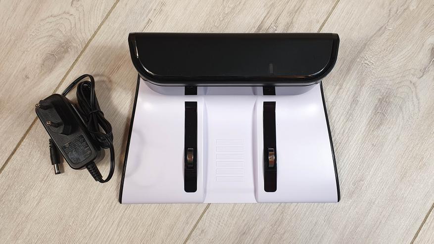 Робот может заряжаться как автоматически от док станции, так и при прямом подключении блока питания в разъем. На зарядном указаны характеристики 19V/0,6А.