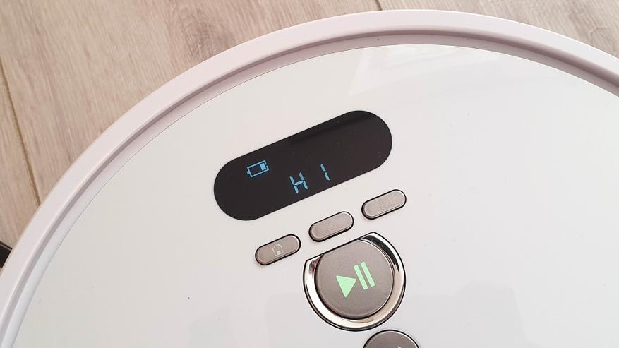 Кстати, кнопки имеют световую индикацию и показывают статус устройства. На зарядке кнопки мигают оранжевым, а когда робот заряжен горят зеленым цветом. При ошибке кнопки горят красным, а на экран выводится код, расшифровать который можно при помощи инструкции. Например если во время работы поднять пылесос над полом, он остановится и начнет гореть код Е21. В инструкции сказано, что она означает «приостановку работы» и для ее решения нужно поставить пылесос на пол. Таким же образом можно узнать, если что-то будет не в порядке с правой или левой щеткой, с правым или левым колесом, бампером, гироскопом и т.д. Также пылесос проинформирует специальными символами о низком заряде и переполненном баке для мусора.
